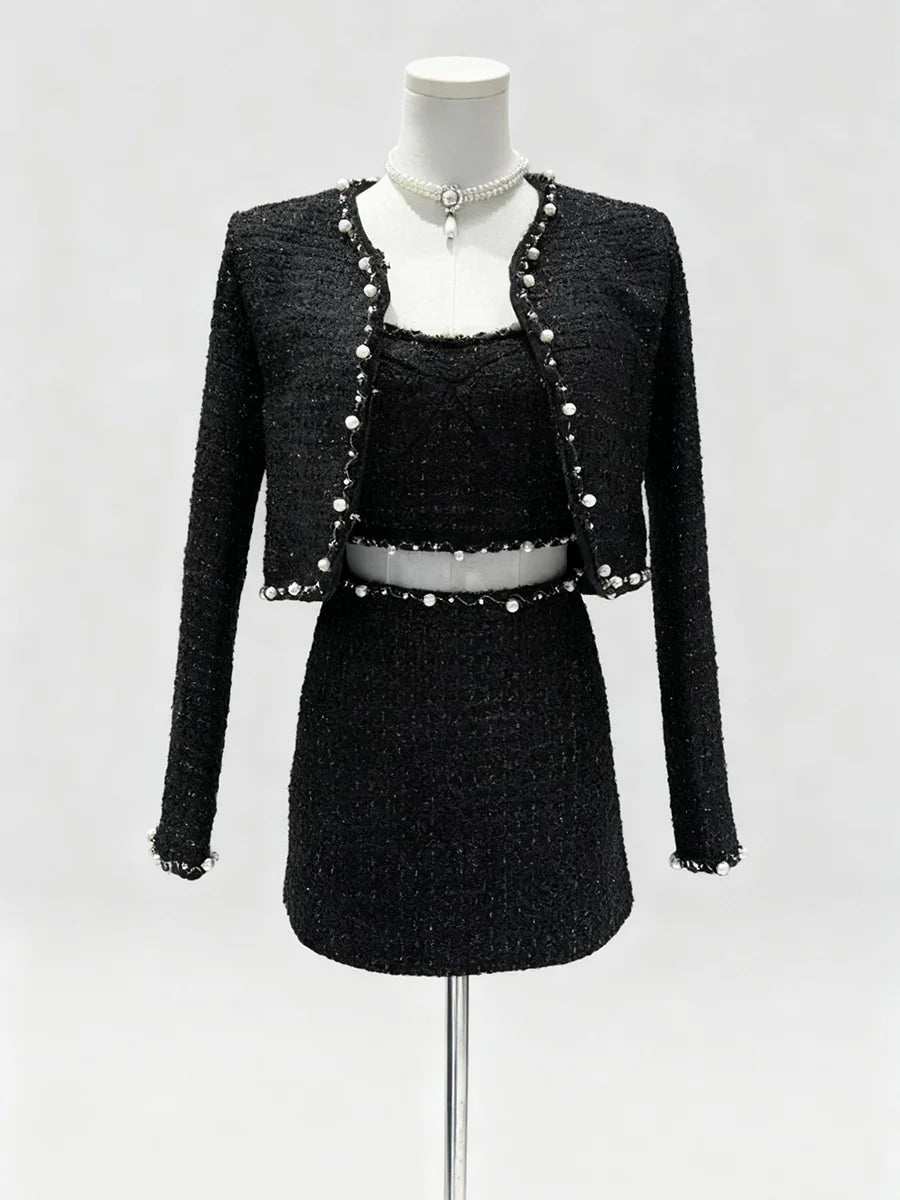 Elevate your wardrobe with the Trend4us Luxe Pearl-Trim Tweed Three-Piece Set, a stunning ensemble that blends timeless sophistication with modern allure. Crafted from premium textured tweed, this coordinated set includes a cropped camisole top, a high-waisted mini skirt, and a matching open-front blazer.