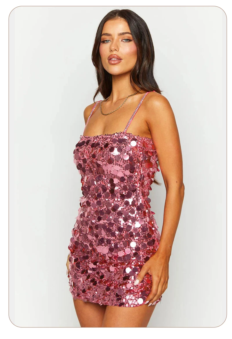 Shine brighter than ever in the Trend4us Luxe Sequin Charm Spaghetti Strap Mini Dress — a glamorous show-stopping piece designed for nights that demand attention.