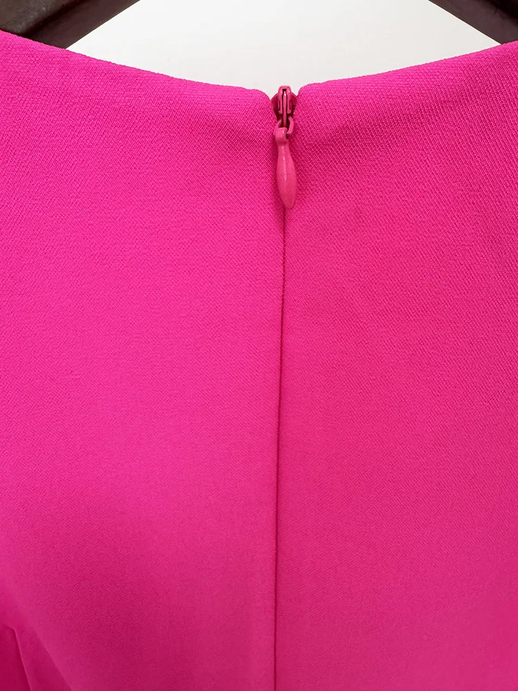 This striking midi dress exudes bold femininity with its vibrant fuchsia hue and dramatic silhouette. Crafted from premium structured fabric, it features voluminous puff sleeves and a flattering fitted cut that enhances the figure. The highlight of the design lies in its oversized floral appliqués—meticulously hand-embellished with shimmering sequins and delicate beads that create a radiant, three-dimensional bloom effect across the front and back.