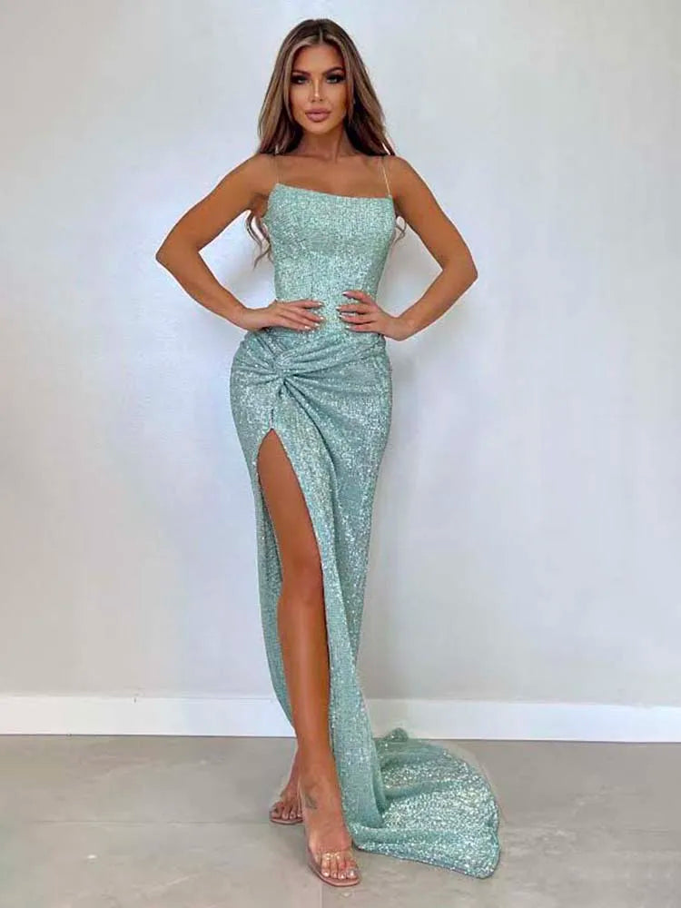Light up the room in the Trend4us Luxe Sparkling Sequin Maxi Dress. Designed for the modern glam goddess, this eye-catching gown features all-over shimmering sequins in a radiant mint hue, capturing the light from every angle. The delicate spaghetti straps and flattering scoop neckline add a touch of elegance, while the ruched waist detail and daring high slit create a sculpted silhouette that exudes confidence.