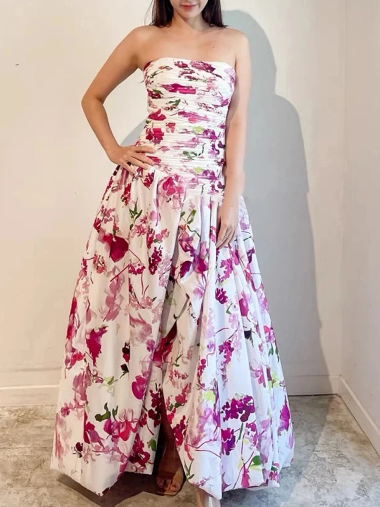 Adorned in vibrant floral prints, this gown is crafted from lightweight, breathable fabric that moves beautifully with every step. The high slit and cascading hemline create a captivating silhouette that’s both modern and timeless—perfect for garden weddings, destination soirées, or luxury evening events.