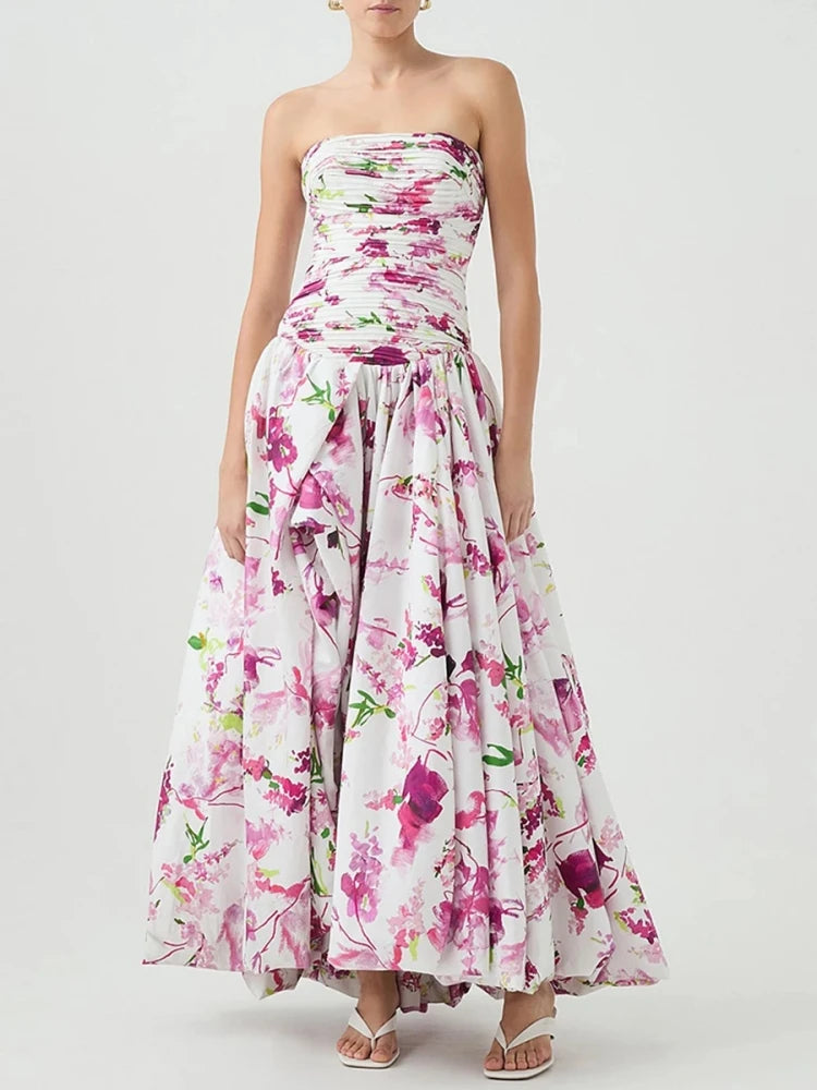 Make a stunning entrance in the Trend4us Luxe Strapless Floral Draped High-Low Gown, a breathtaking fusion of romantic florals and sculpted elegance. This strapless gown features a ruched bodice that flatters the figure and accentuates the waist, flowing effortlessly into a voluminous high-low skirt that adds graceful movement and drama.