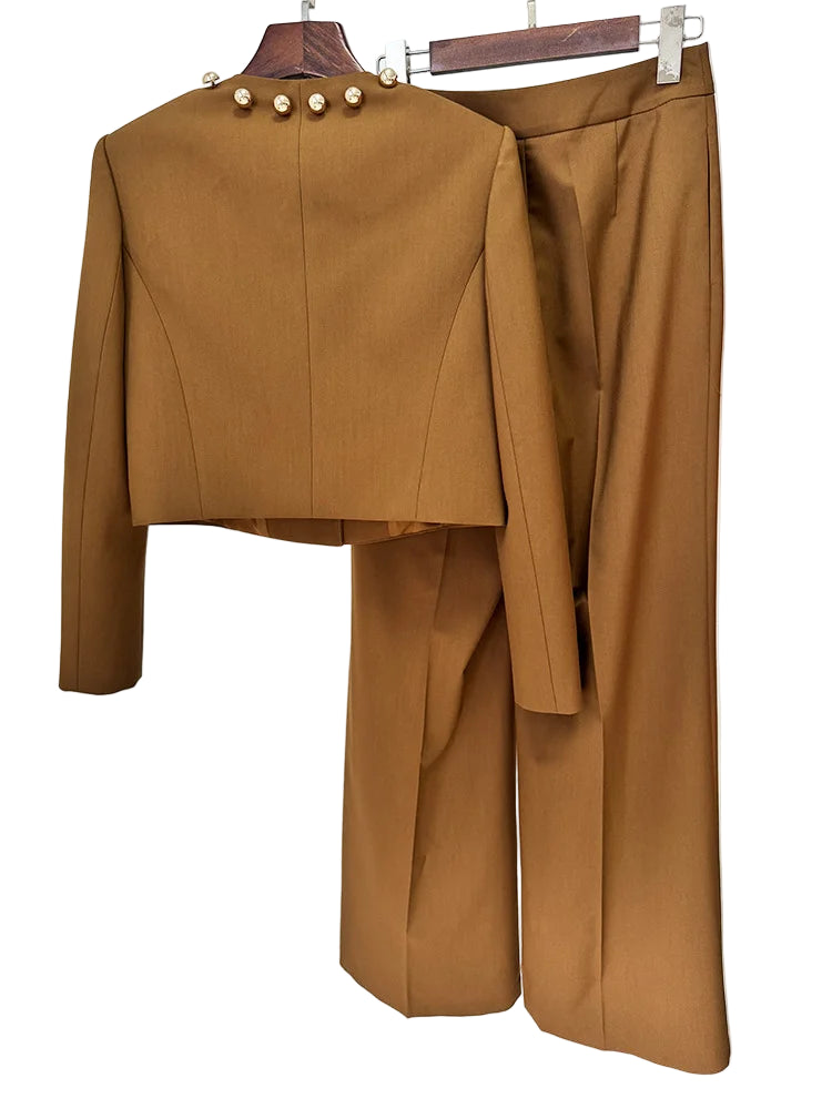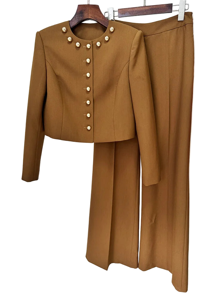 Elevate your wardrobe with the Trend4us Luxe Structured Blazer & Wide-Leg Pants Set, a statement ensemble designed for modern sophistication. Featuring a beautifully tailored cropped blazer adorned with bold gold-tone dome buttons, this set exudes luxury from every angle. The structured shoulders and sculpted seams create an elegant silhouette that highlights the waist while adding contemporary edge.