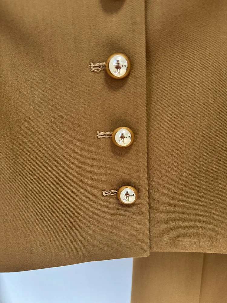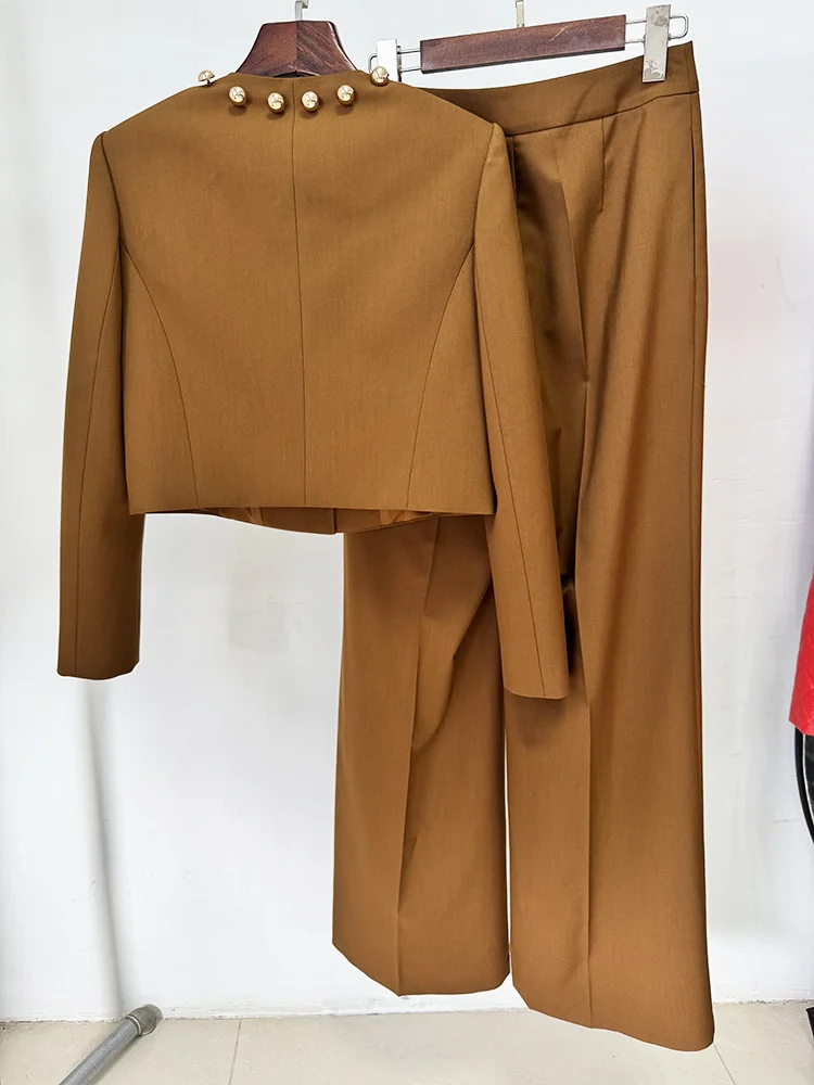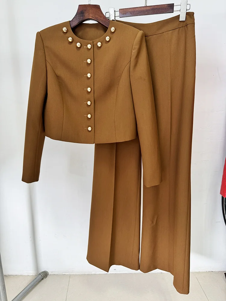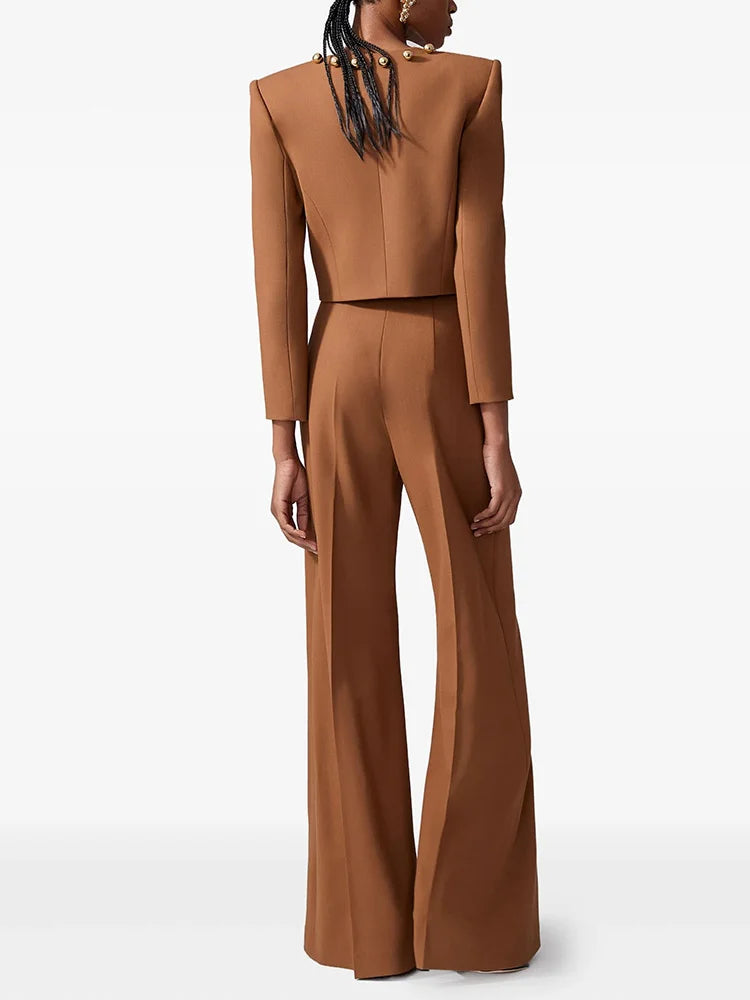 The matching high-waisted wide-leg pants elongate the figure with clean pleats and fluid movement, offering both comfort and a refined finish. Whether worn together for a commanding monochromatic look or styled separately, this set transitions effortlessly from chic daytime events to elevated evening engagements.