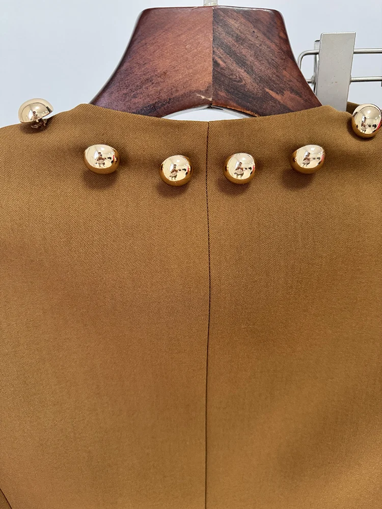 Details: Gold-tone statement buttons, sculpted seams