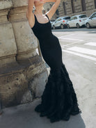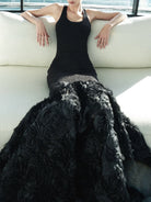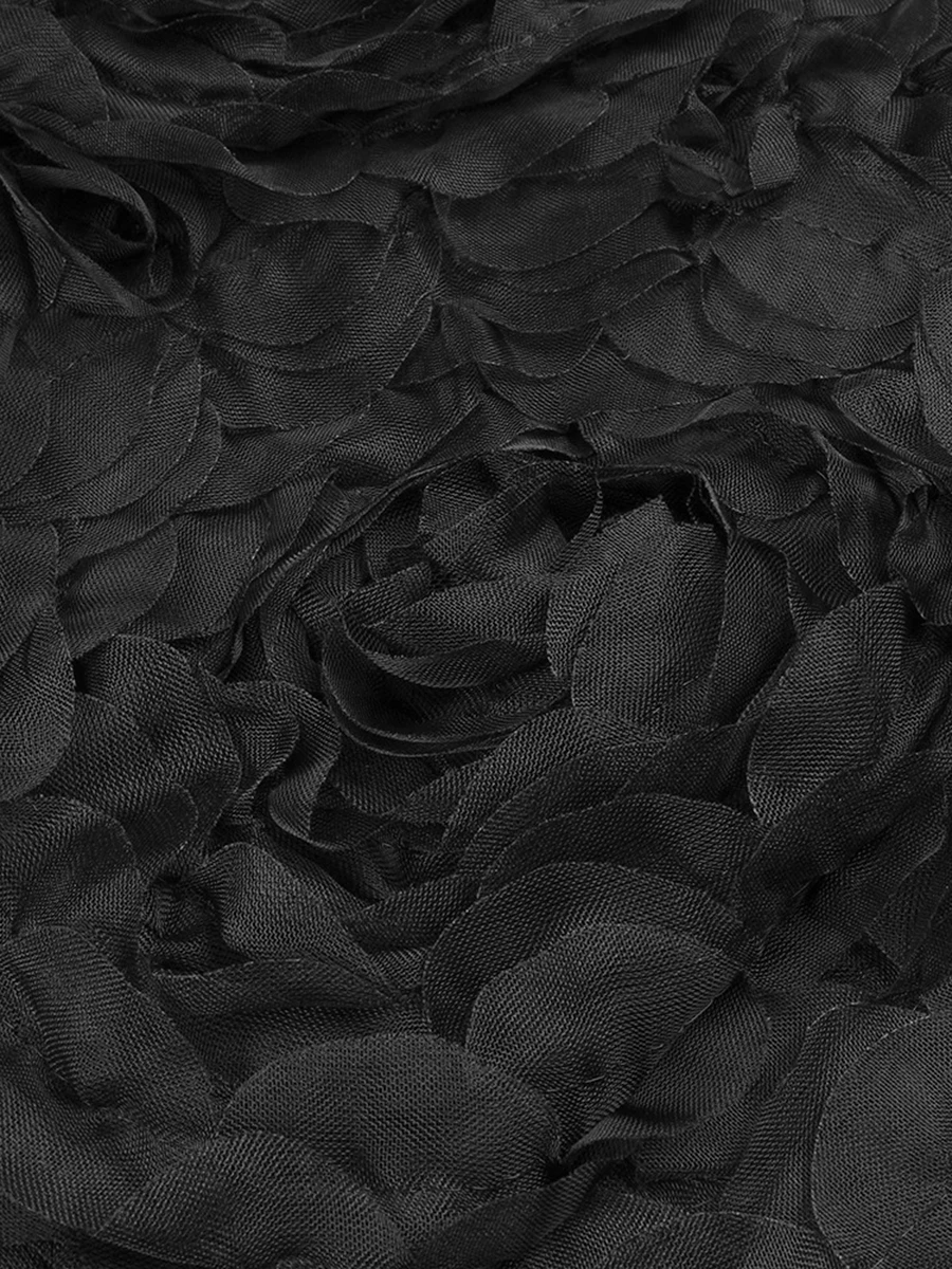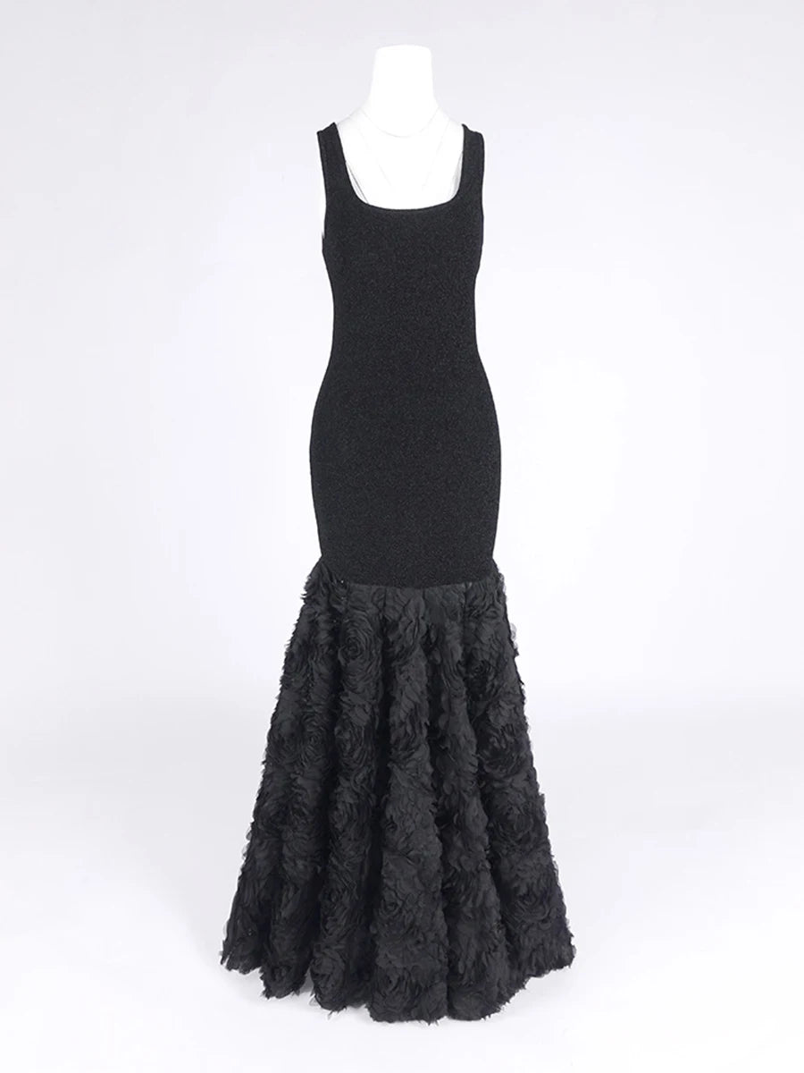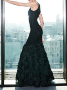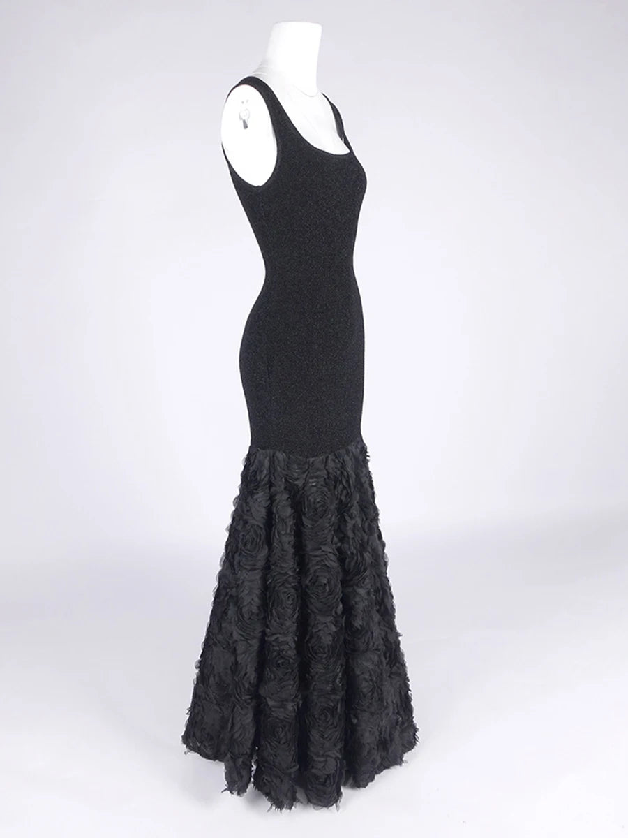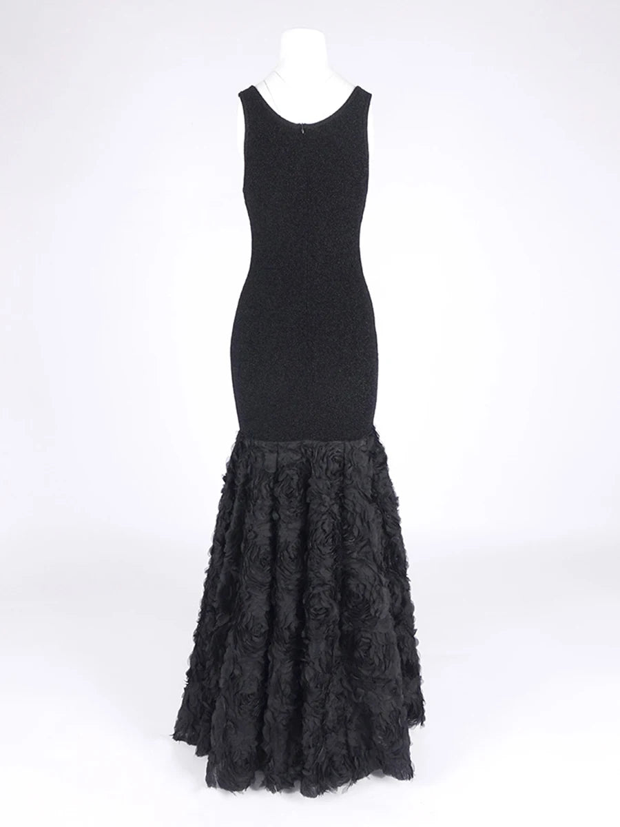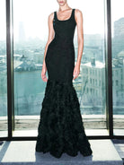 Make an unforgettable entrance in the Trend4us Luxe Textured Floral Appliqué Mermaid Gown. This captivating black evening dress features a form-fitting glitter-knit bodice that hugs your curves, flowing into a dramatic mermaid skirt adorned with intricate 3D floral appliqués. The sleeveless scoop neckline adds a touch of classic elegance, while the textural contrast between the shimmering top and voluminous floral base creates a high-fashion statement. Perfect for red carpet events, galas, and formal occasions, this gown exudes sophistication and timeless glamour.