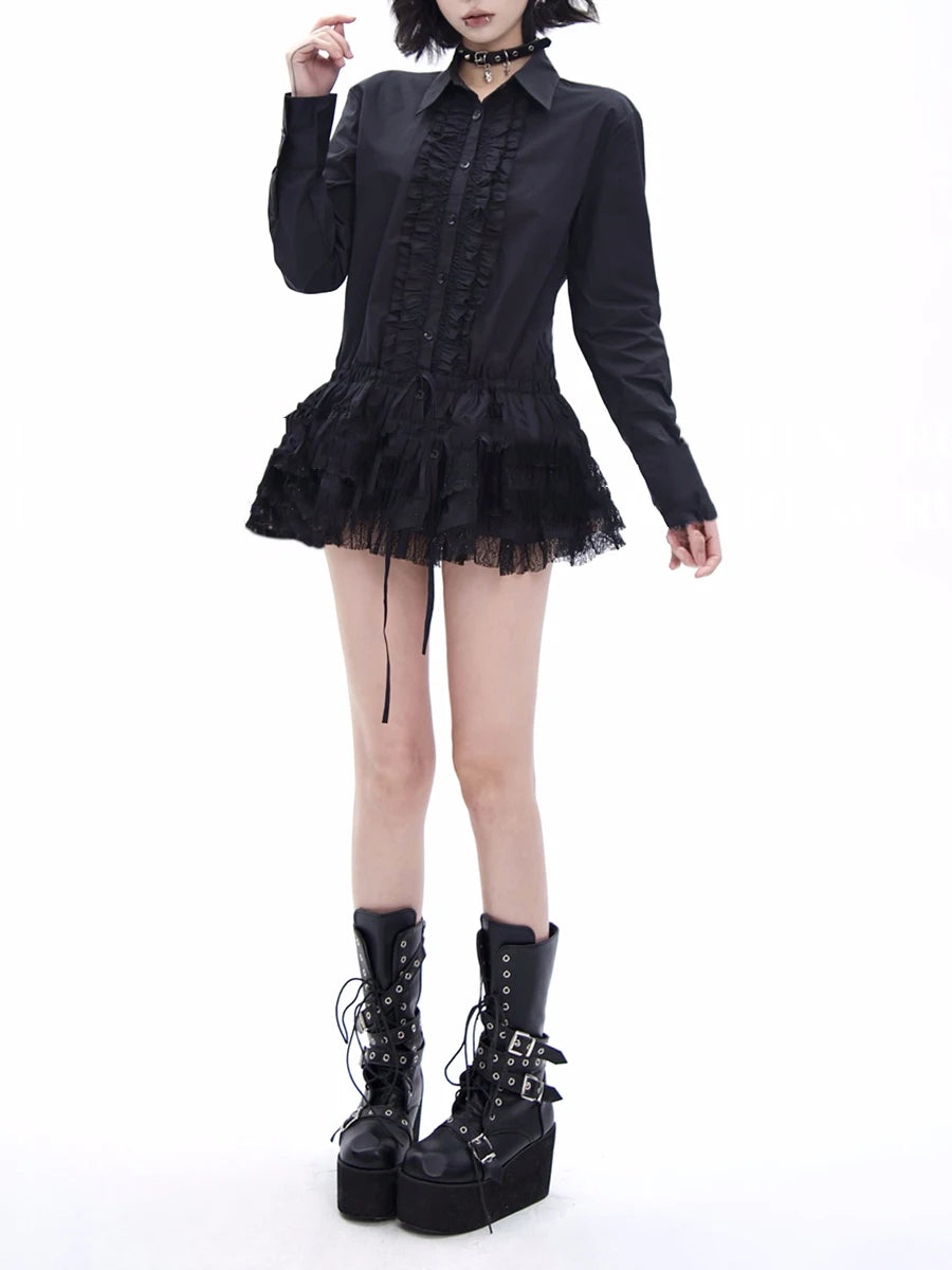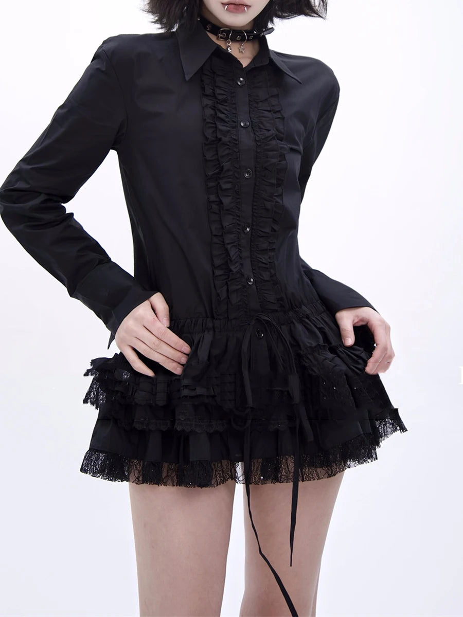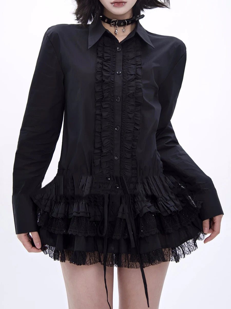 Infuse your wardrobe with dark romance in the Trend4us Ruffled Lace Trim Gothic Shirt Dress, a striking blend of classic tailoring and edgy elegance. This statement mini dress features a structured shirt silhouette with a pointed collar, full-length sleeves, and button-down front. The standout detail lies in its multi-tiered ruffle and lace trim hem, creating dramatic texture and volume. A drawstring waist allows for adjustable shape, while the gothic design influence is heightened with its contrast black or white color options.