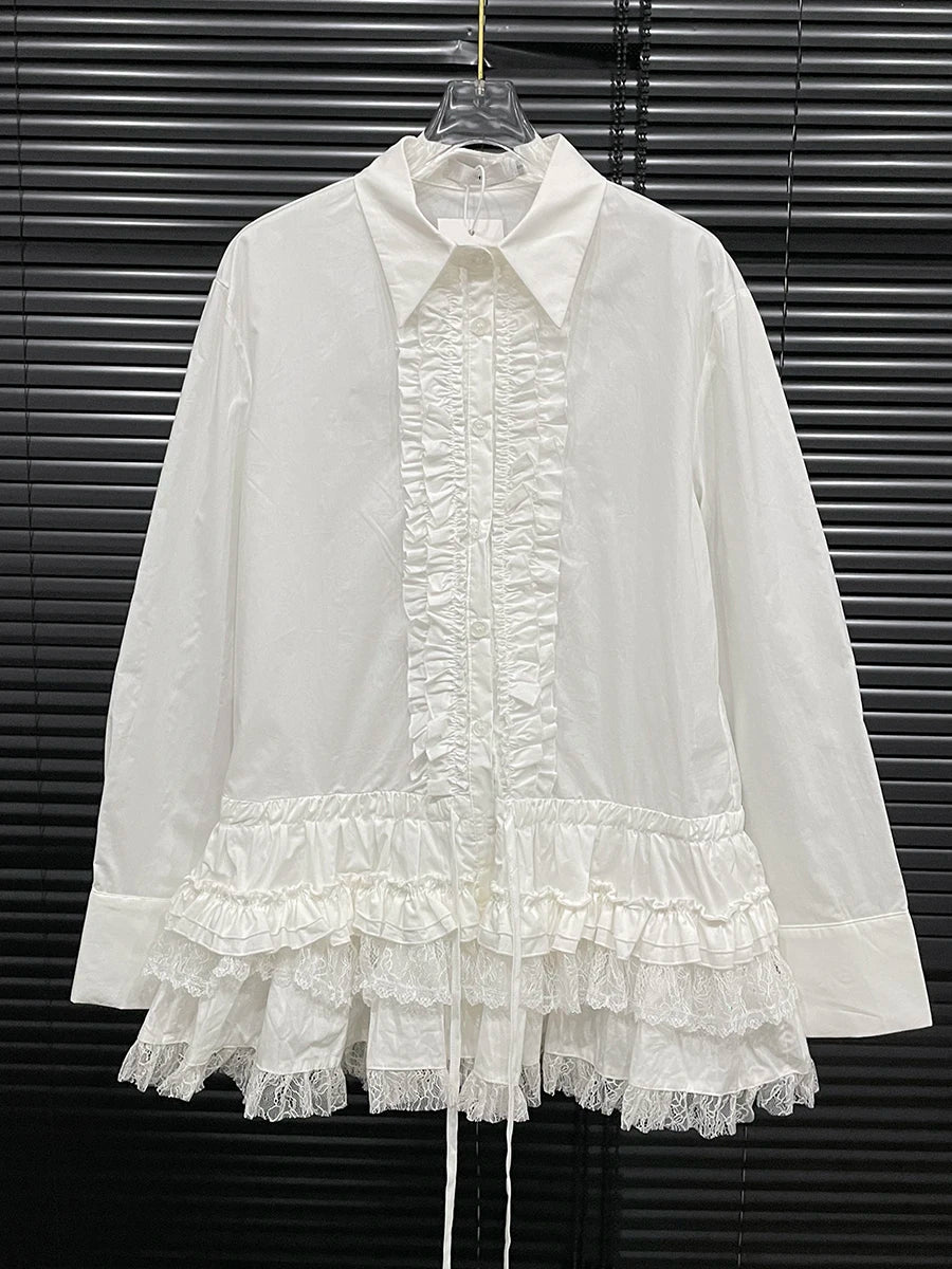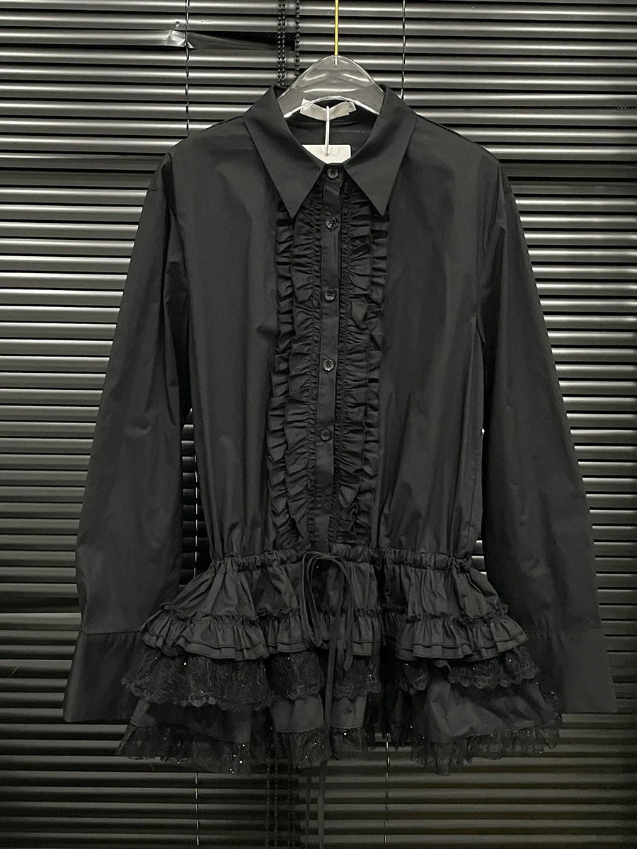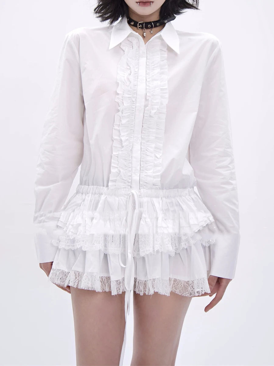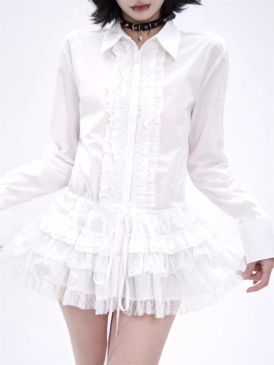 Infuse your wardrobe with dark romance in the Trend4us Ruffled Lace Trim Gothic Shirt Dress, a striking blend of classic tailoring and edgy elegance. This statement mini dress features a structured shirt silhouette with a pointed collar, full-length sleeves, and button-down front. The standout detail lies in its multi-tiered ruffle and lace trim hem, creating dramatic texture and volume. A drawstring waist allows for adjustable shape, while the gothic design influence is heightened with its contrast black or white color options.