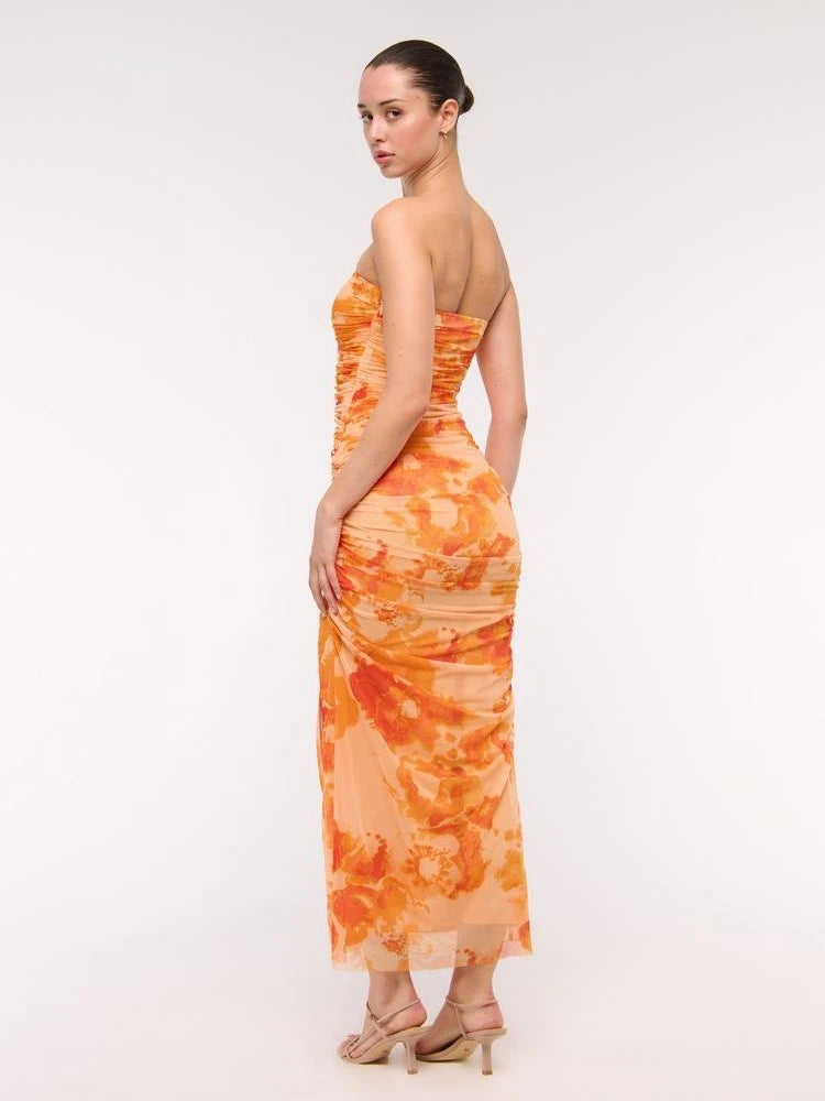 Make a bold statement in the Trend4us Strapless Ruched Tie-Dye Slit Maxi Dress. Designed with a vibrant orange tie-dye print, this strapless silhouette features flattering all-over ruching that hugs your figure in all the right places. The thigh-high side slit adds drama and ease of movement, while the lightweight stretch mesh ensures comfort and a flawless fit. Perfect for summer parties, vacations, or evening events.