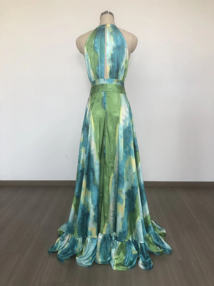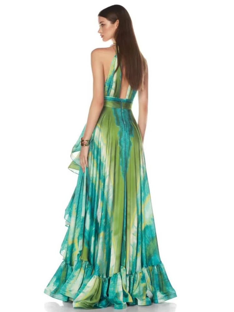 Capture effortless vacation elegance in the Trend4us Tropical Ruffle Halter High-Low Maxi Dress. Designed with a vibrant watercolor-inspired print, this flowy silhouette features a halter neckline, cinched waistband, and dramatic ruffled hem with a cascading high-low cut. Light, airy, and full of movement, it's the perfect statement piece for resort escapes, beachside dinners, or summer events.