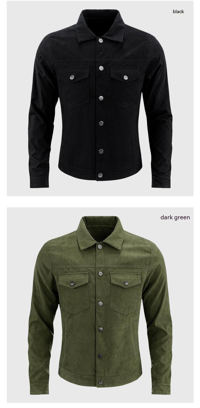 Our Suede Jacket boasts a timeless solid color pattern that effortlessly blends with any outfit. The topstitching slit pockets not only add a touch of sophistication but also provide convenience for your essentials. Available in three versatile colors - Khaki, Black, and Army Green - you can easily find the shade that suits your personal style.