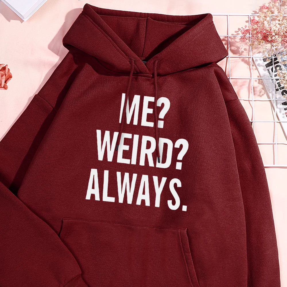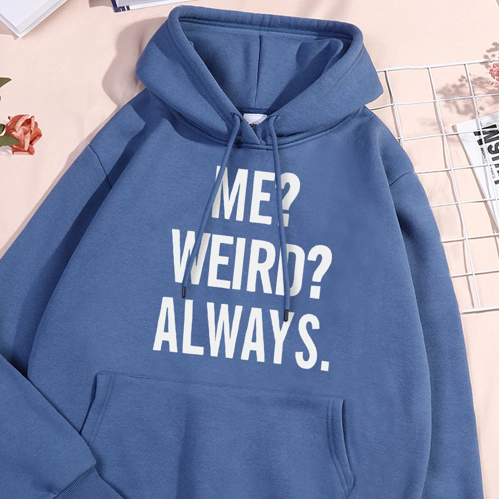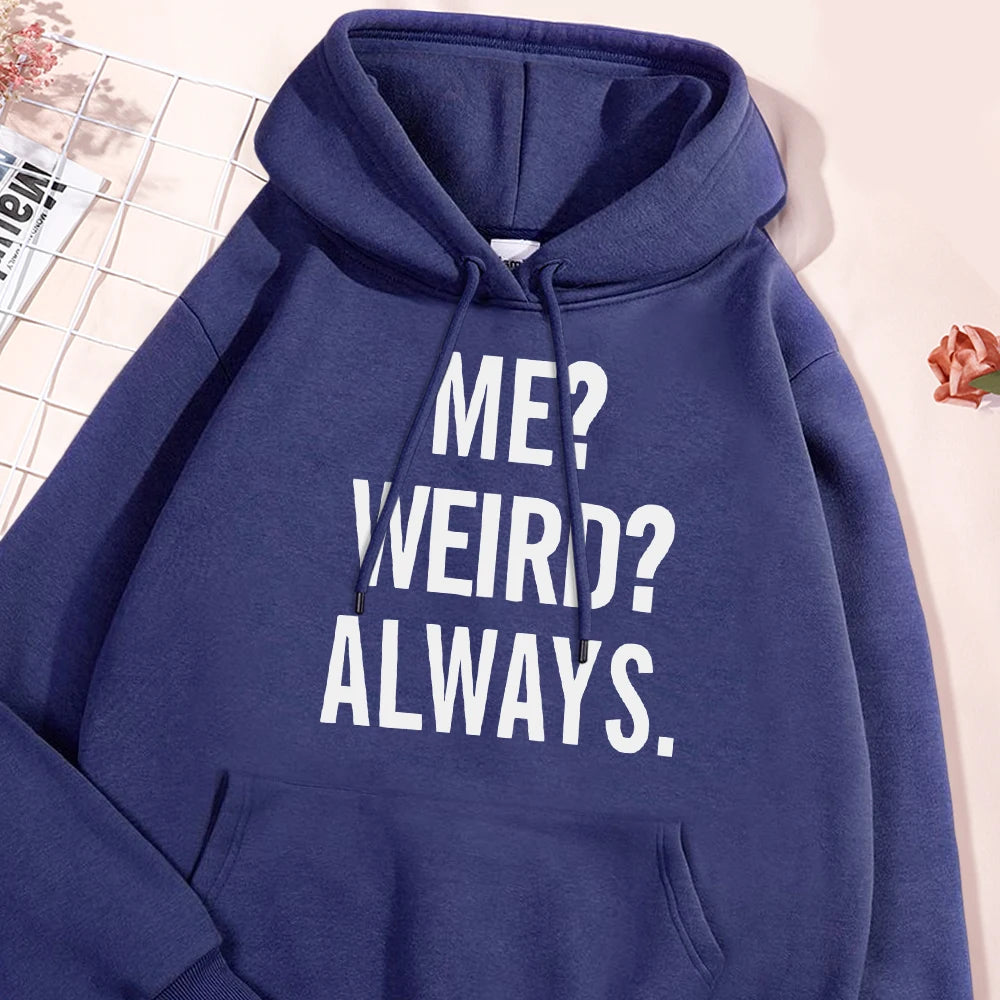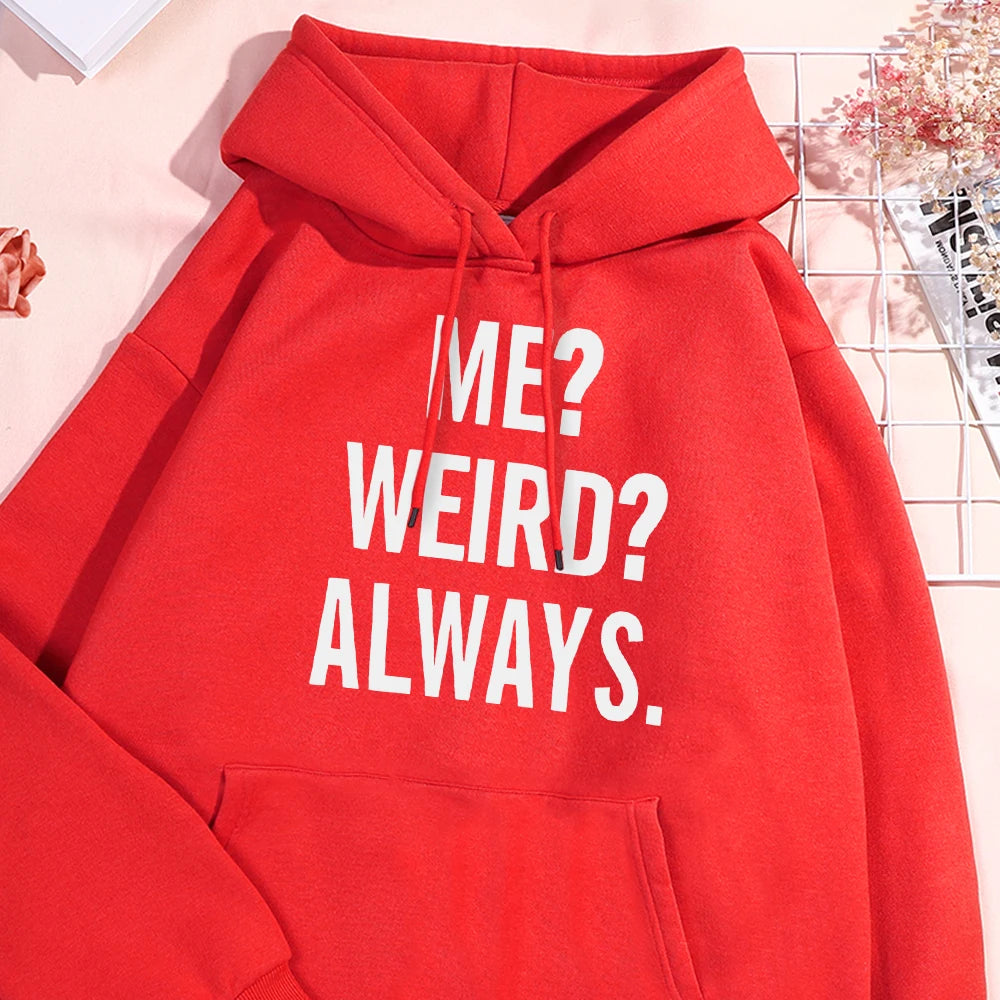 Make a bold statement in the Trend4us Unisex Streetwear Graphic Hoodie. Featuring a relaxed fit, soft fleece lining, and standout front print reading “Me? Weird? Always.”, this hoodie combines comfort with unapologetic personality. Designed for streetwear lovers and trendsetters who don’t take life too seriously. Perfect for layering, lounging, or making a scene—your way.