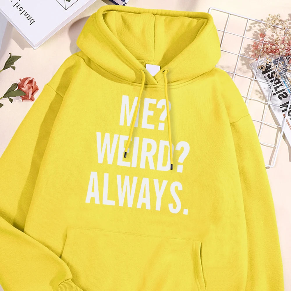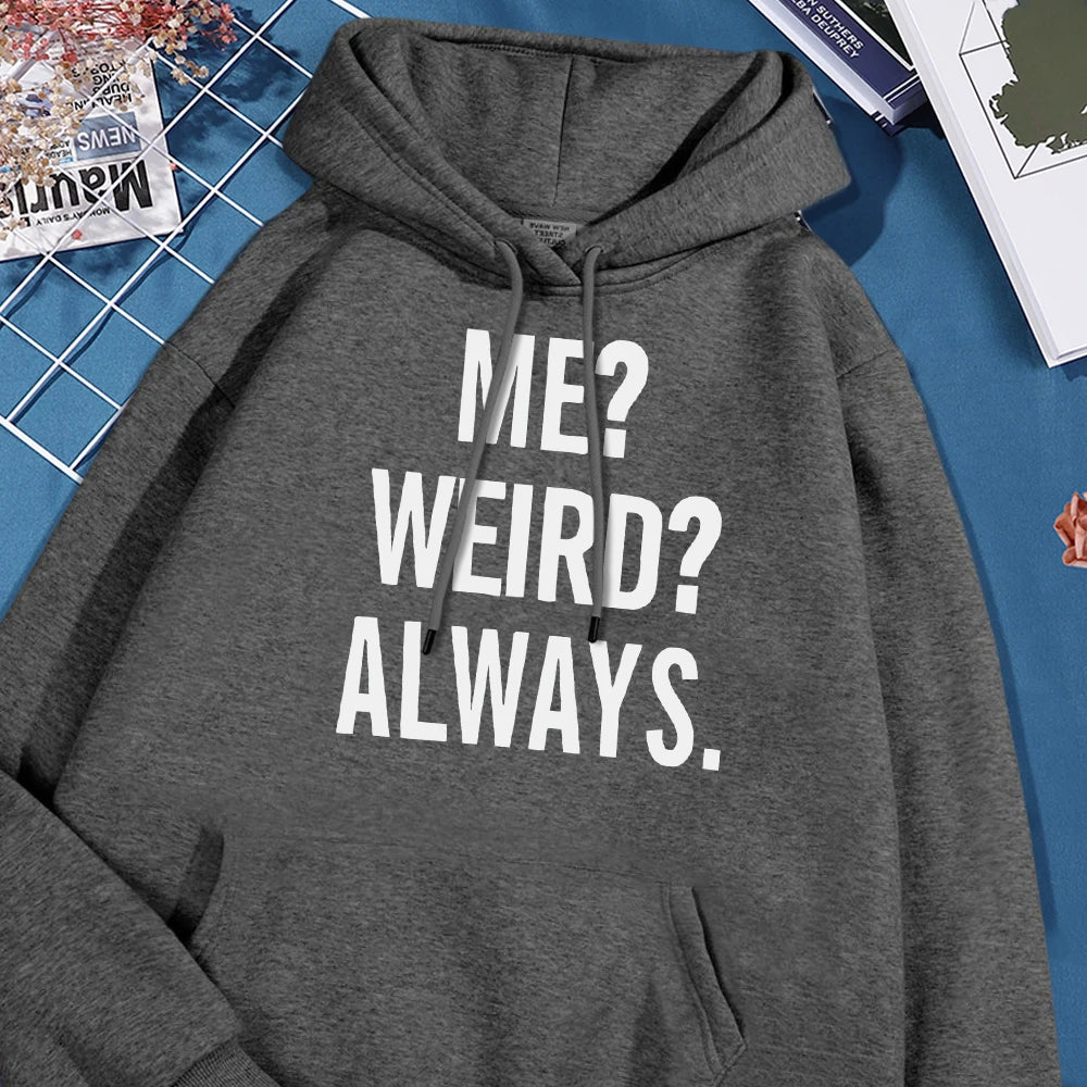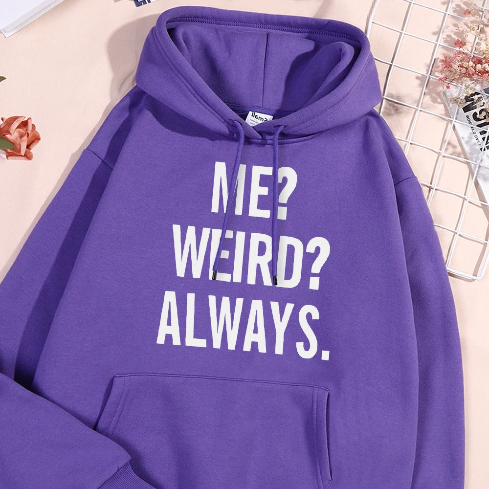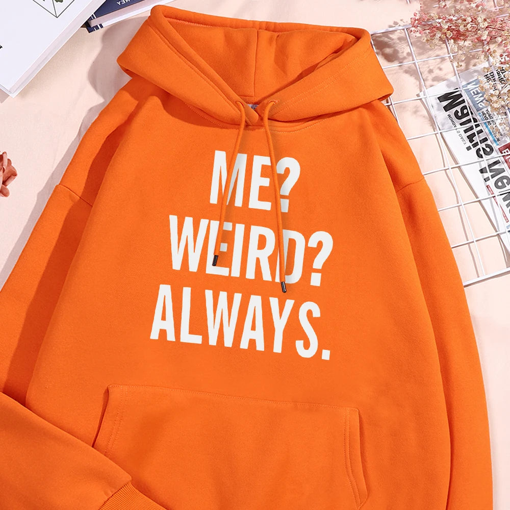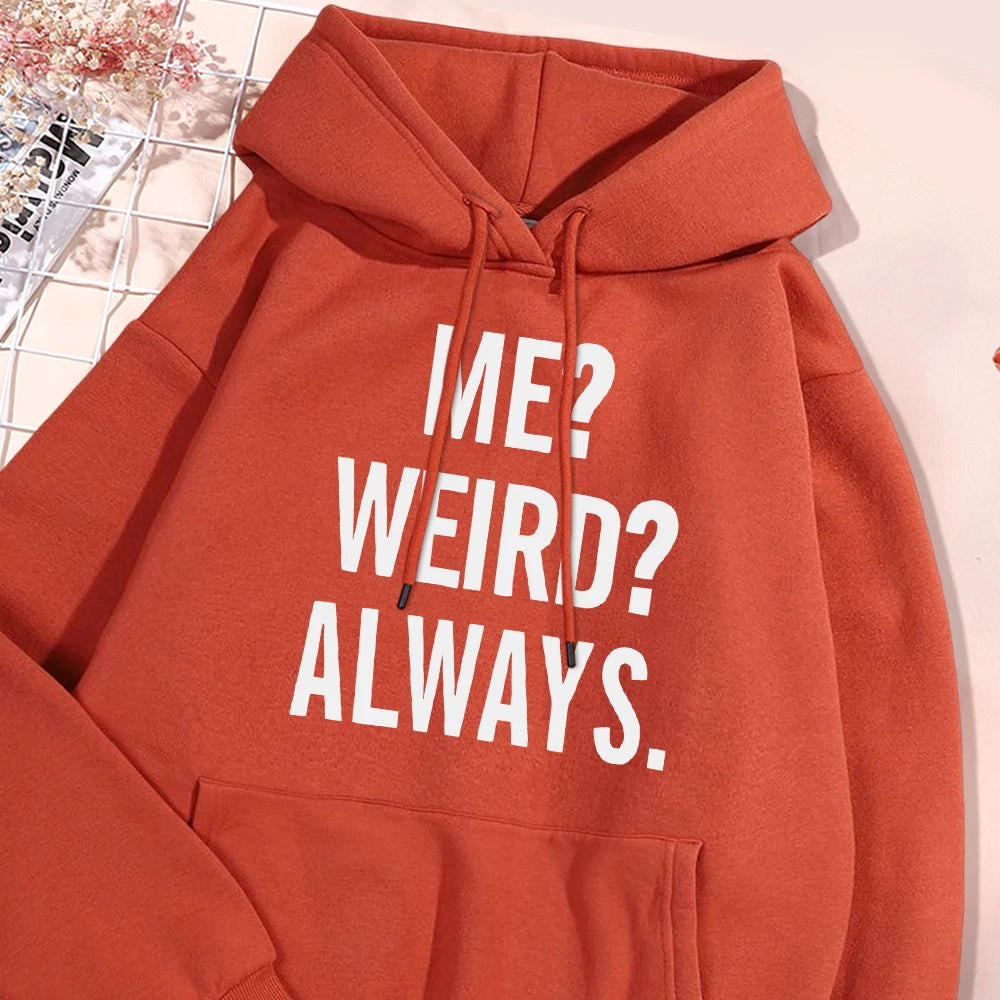 Make a bold statement in the Trend4us Unisex Streetwear Graphic Hoodie. Featuring a relaxed fit, soft fleece lining, and standout front print reading “Me? Weird? Always.”, this hoodie combines comfort with unapologetic personality. Designed for streetwear lovers and trendsetters who don’t take life too seriously. Perfect for layering, lounging, or making a scene—your way.