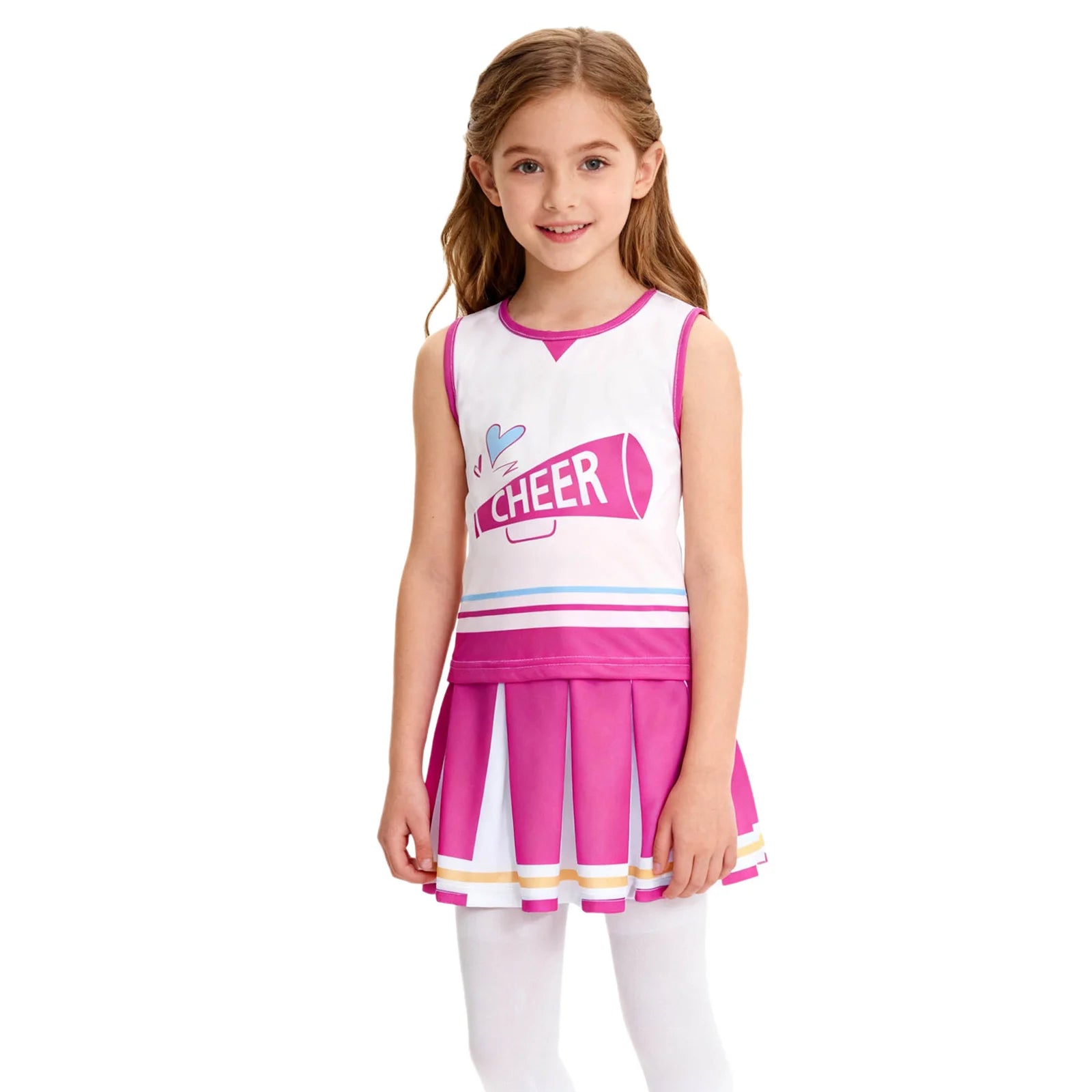 This adorable set features a sleeveless cheer crop top with a printed graphic, paired with a pleated mini skirt in bright contrast colors.