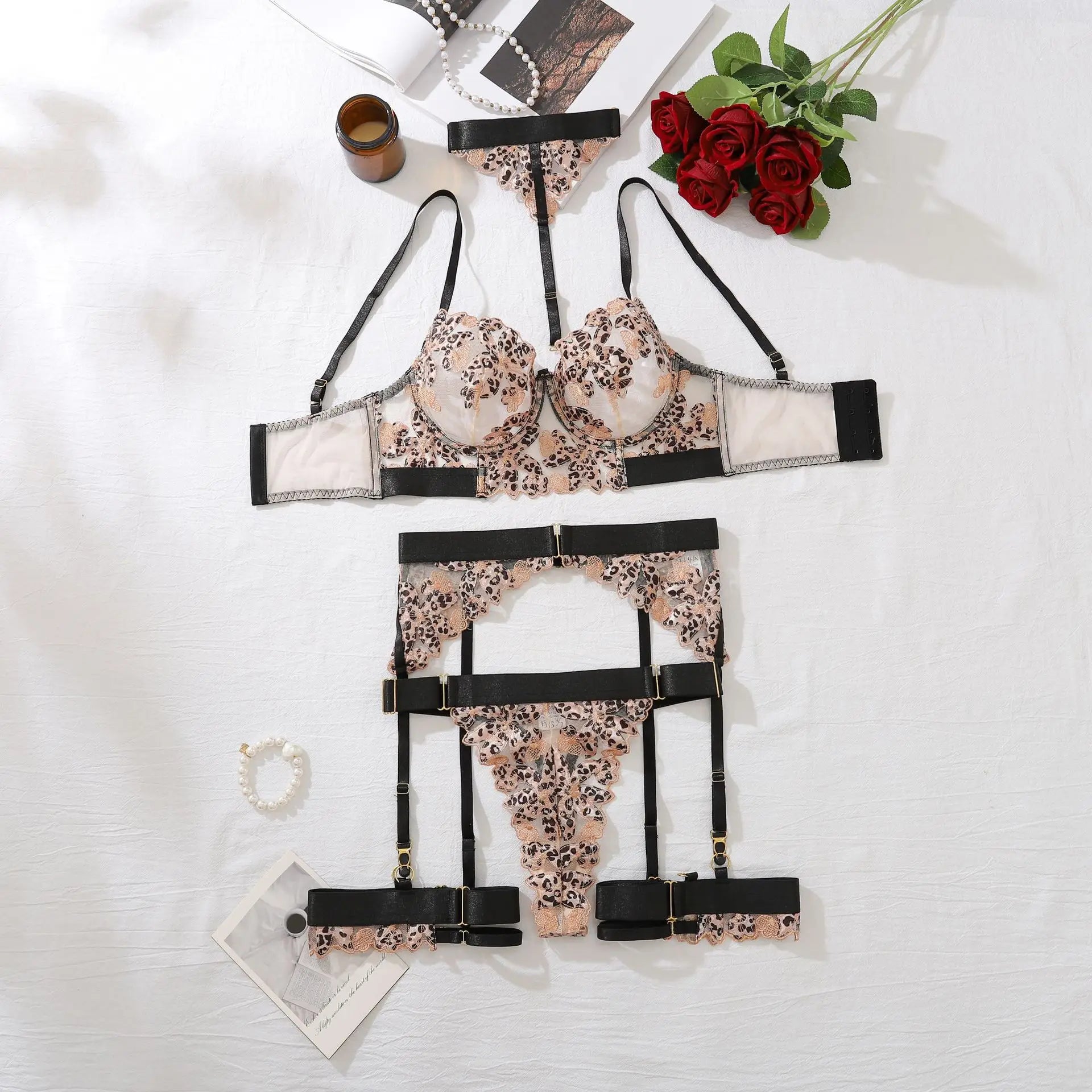 Unleash your fierce elegance with the Trend4us Leopard Lace Harness Lingerie Set, a daring blend of sensual lace and bold strappy design. This captivating three-piece set features sheer mesh with intricate leopard-patterned embroidery, accented by adjustable satin straps and gold-tone hardware for a touch of luxury. The underwire bra offers structured support, while the coordinating thong and harness garter belt sculpt an unforgettable silhouette — perfect for confident, empowered women.