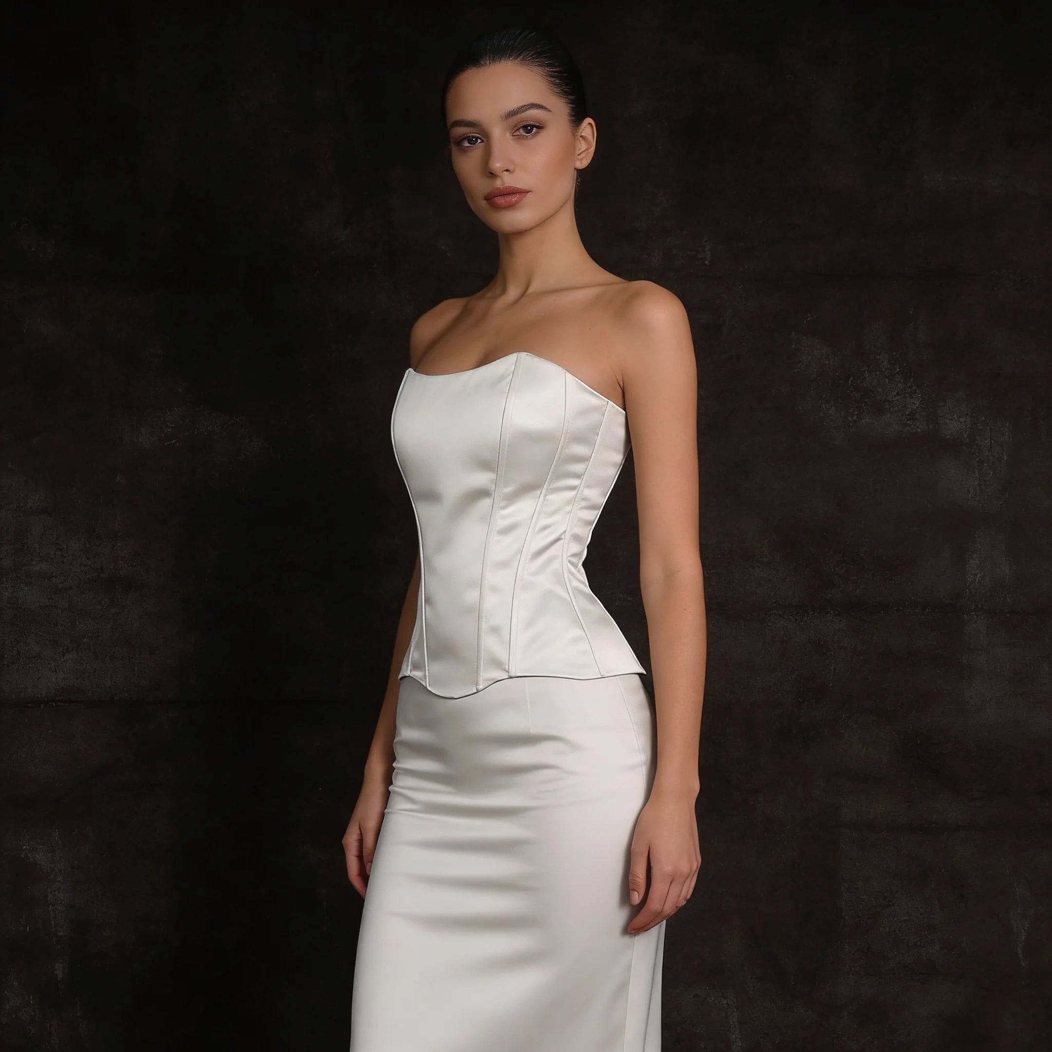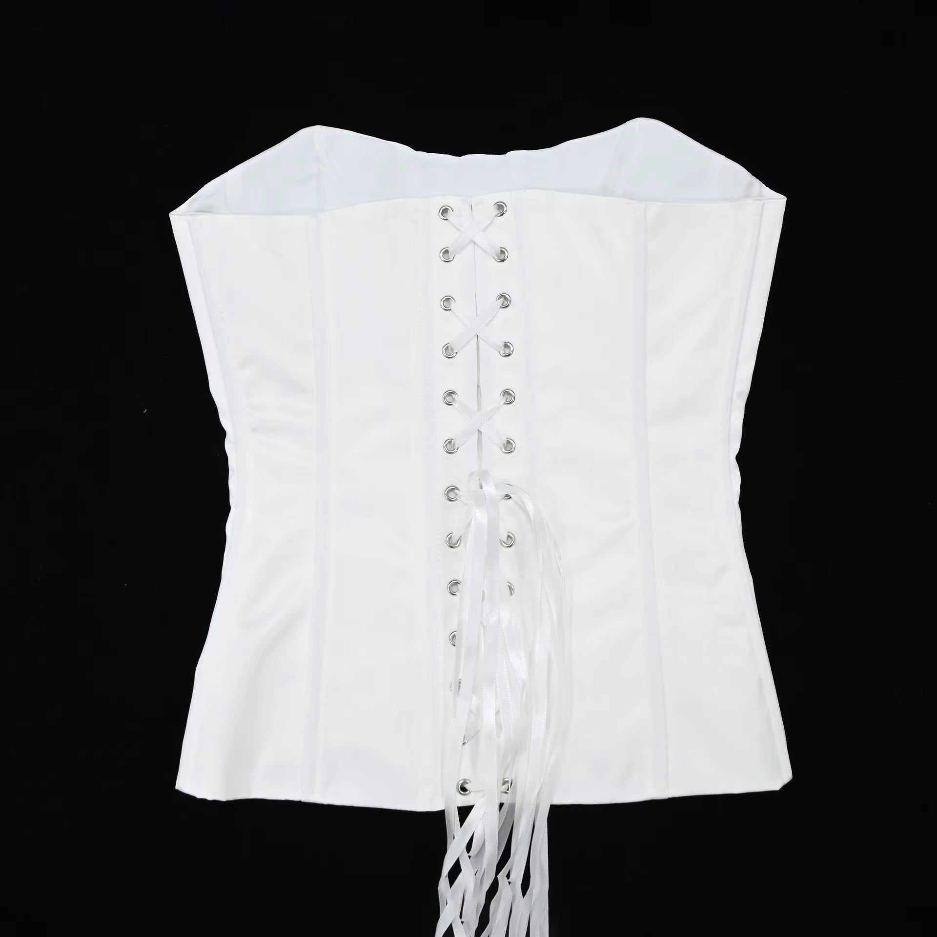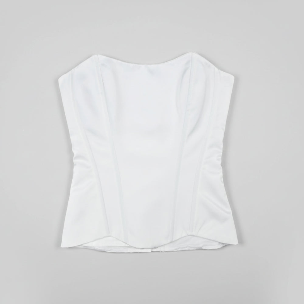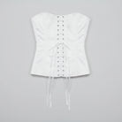 The strapless neckline highlights the shoulders and décolletage, while the lace-up back allows adjustable cinching for a custom, body-contouring fit. Perfect for bridal styling, evening wear, or modern power looks, this corset is a timeless wardrobe essential.
