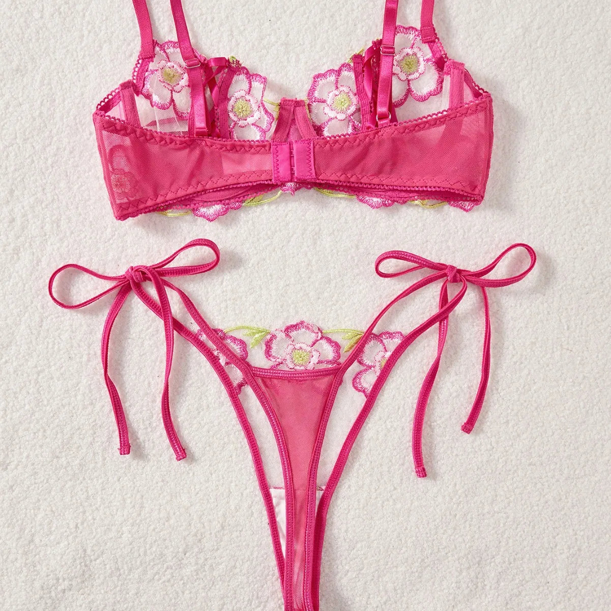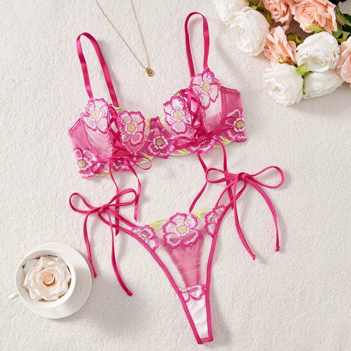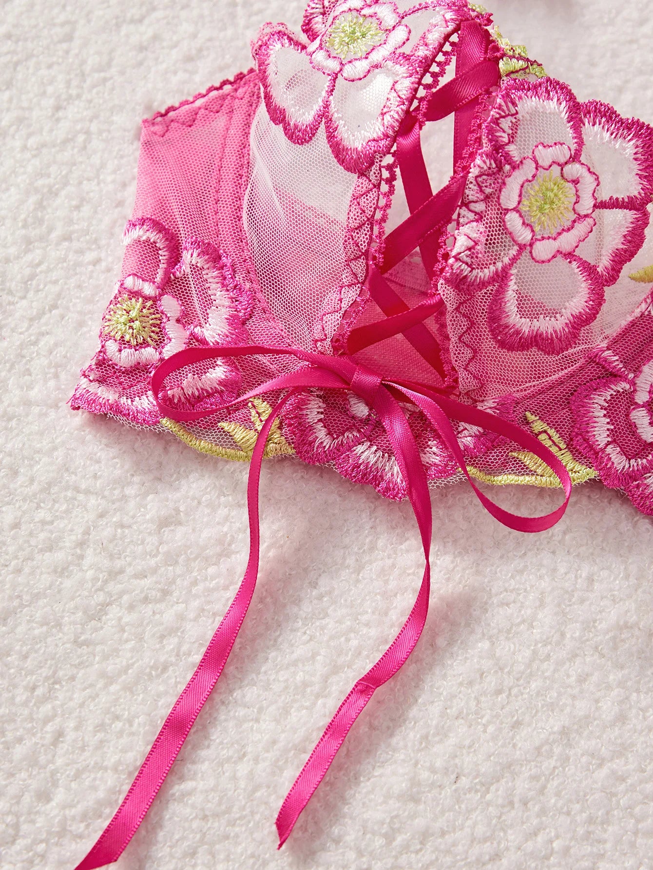 Trend4us Rose Floral Lace-Up Embroidered Lingerie Set