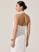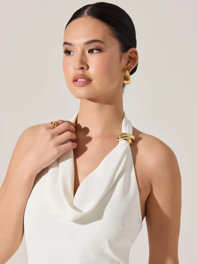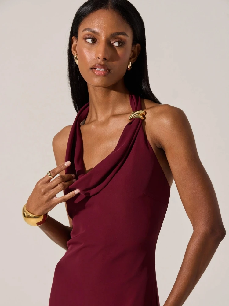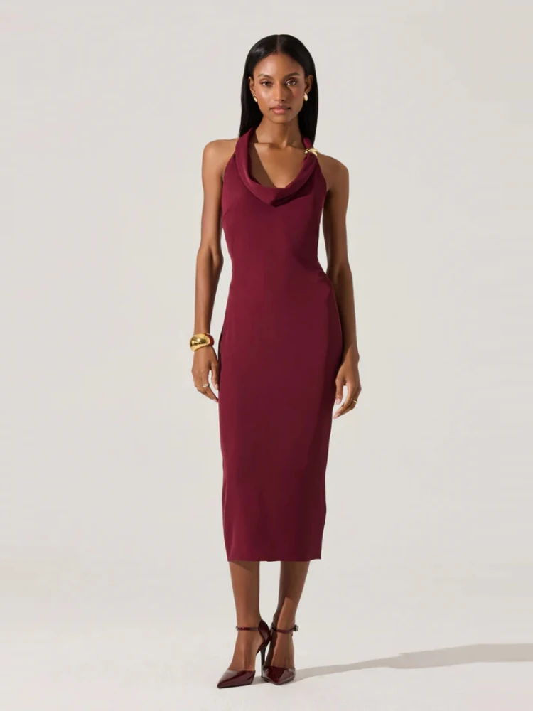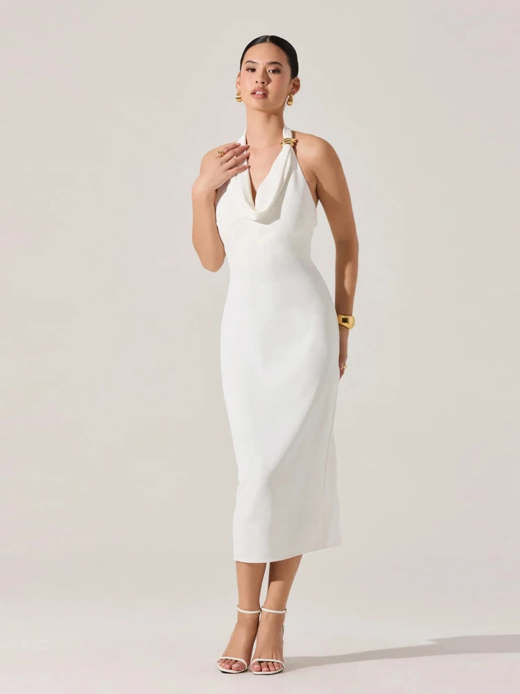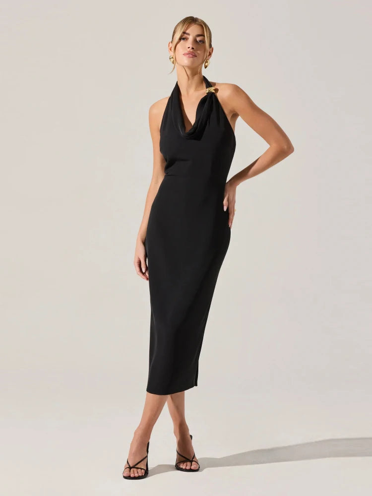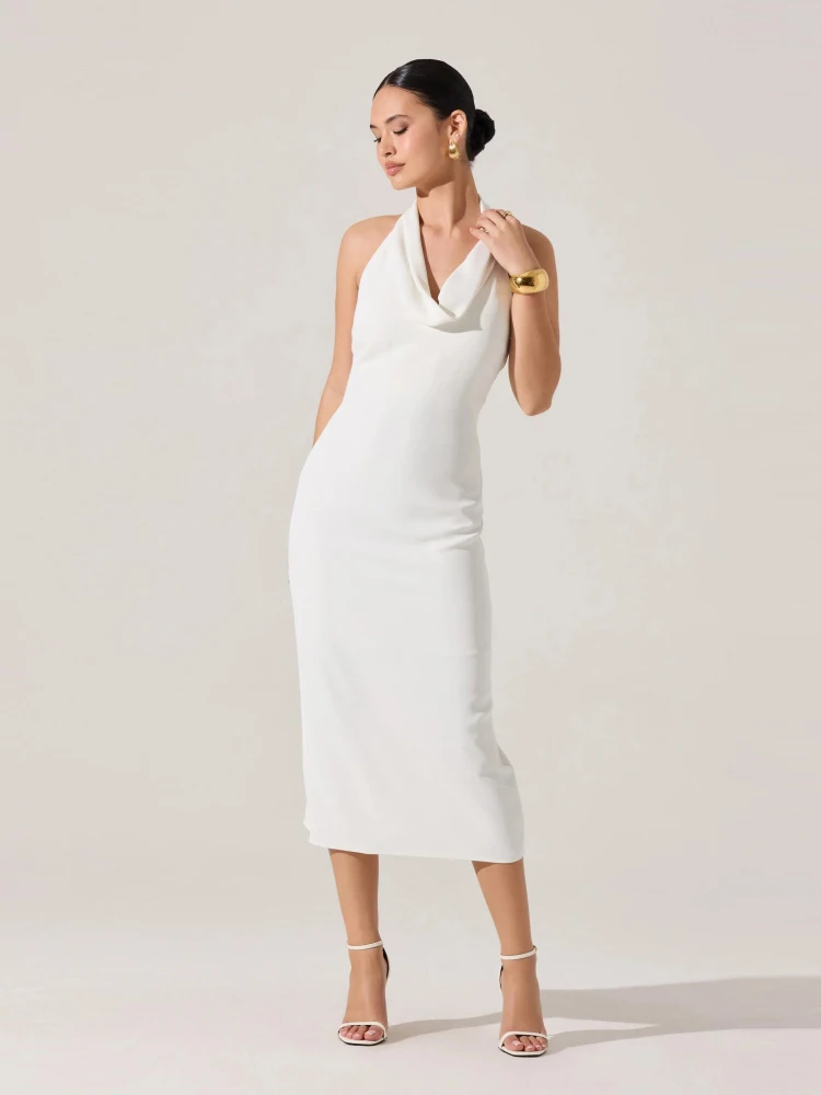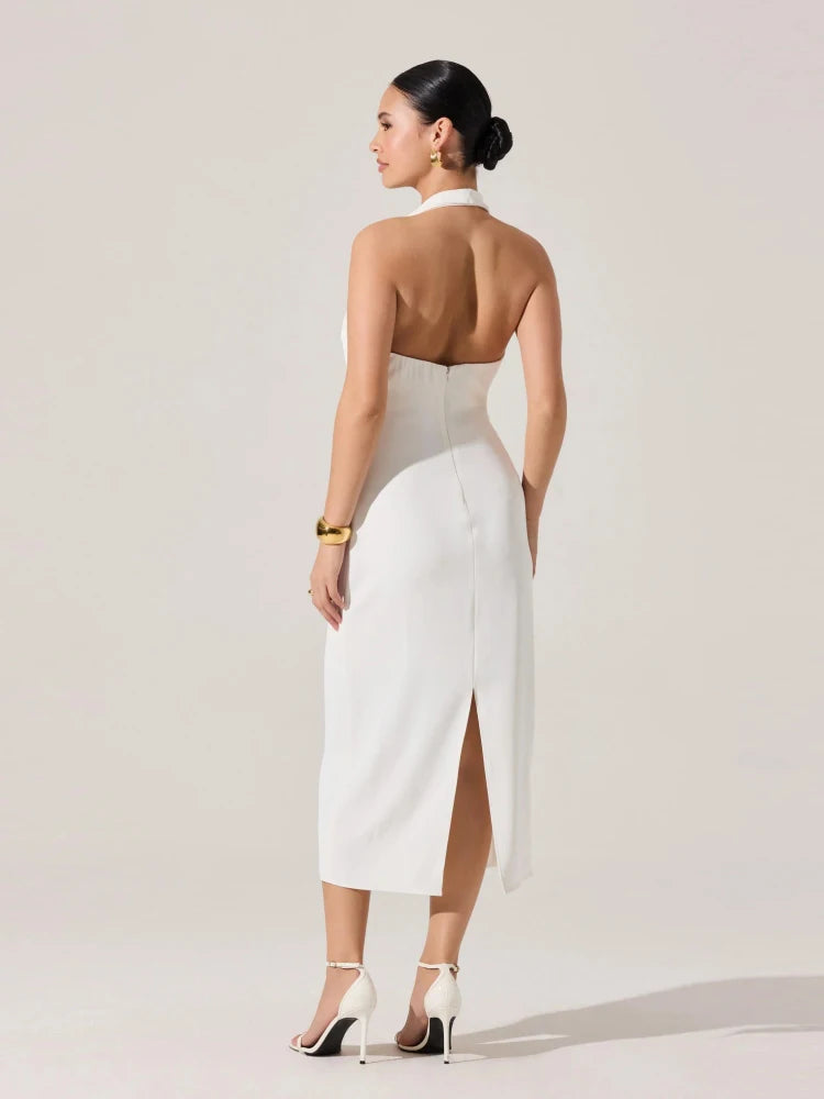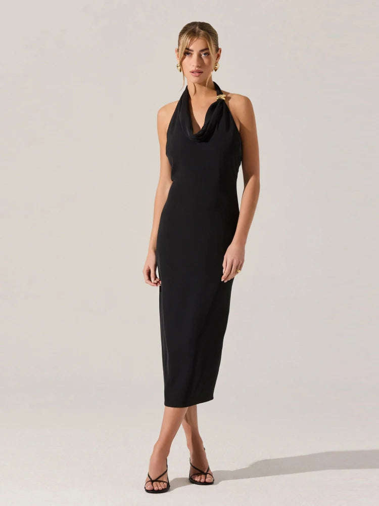 Timeless elegance meets modern allure in the Trend4us Elegant Halter Neck Backless Midi Dress. Designed with a softly draped halter neckline, this refined silhouette frames the décolletage beautifully while flowing into a sleek, body-skimming midi length. The open back adds a sophisticated touch of sensuality, balanced by clean lines and a minimalist finish for an elevated, couture-inspired look.