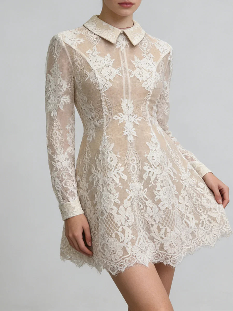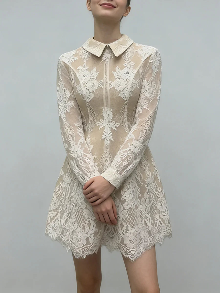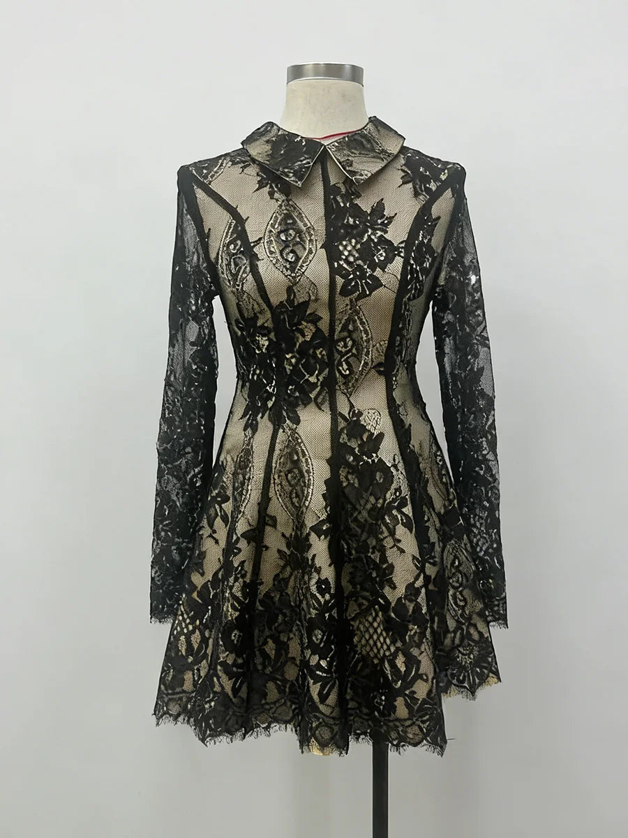 Embrace timeless sophistication with this exquisite lace mini dress that perfectly balances classic elegance and modern allure. Delicate sheer lace detailing and a refined collar create a look that's both polished and captivating.