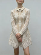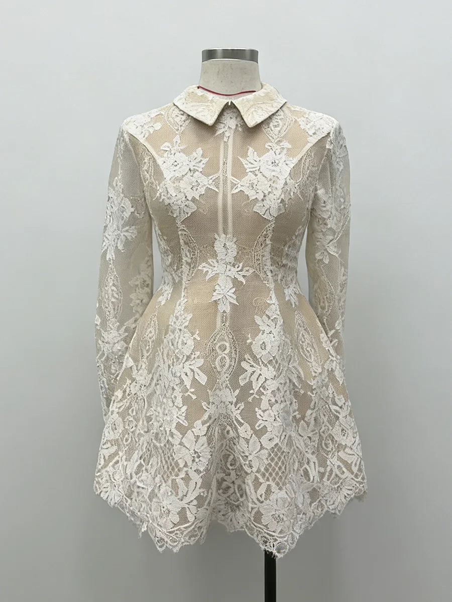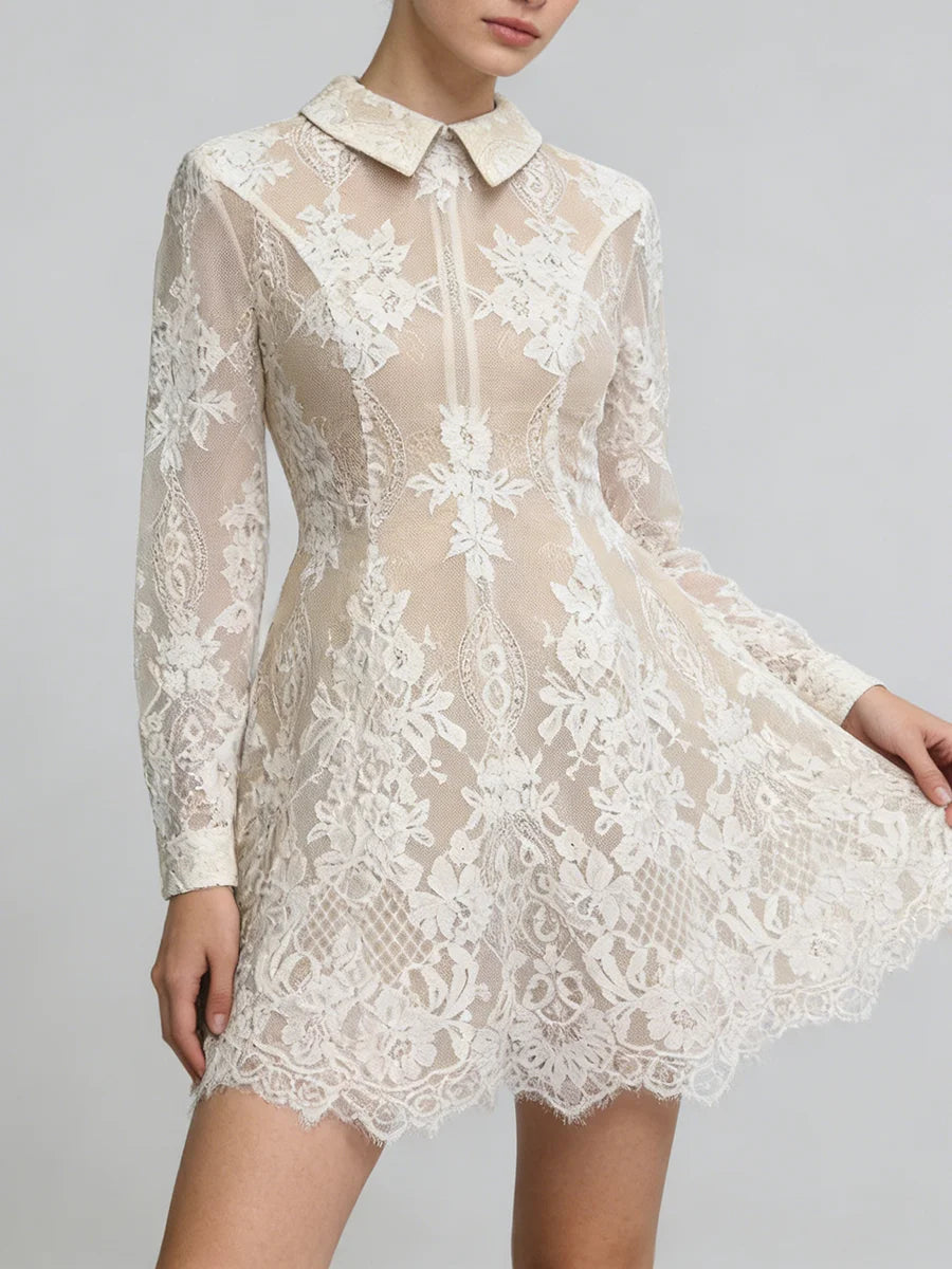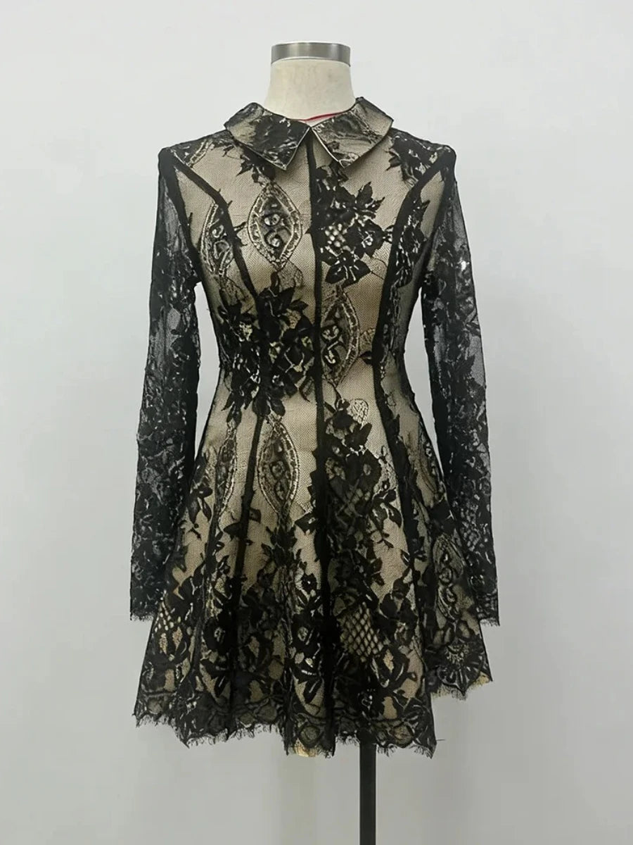 Embrace timeless sophistication with this exquisite lace mini dress that perfectly balances classic elegance and modern allure. Delicate sheer lace detailing and a refined collar create a look that's both polished and captivating.