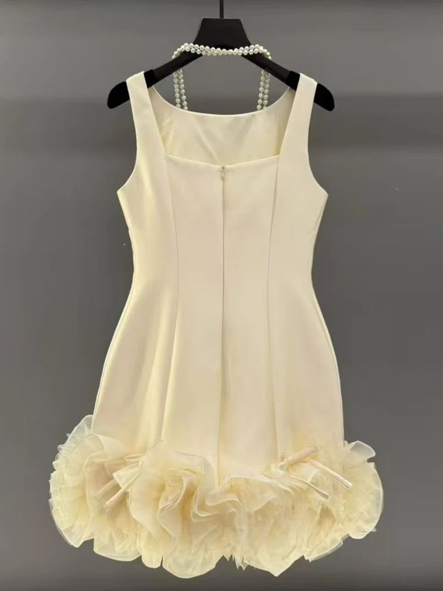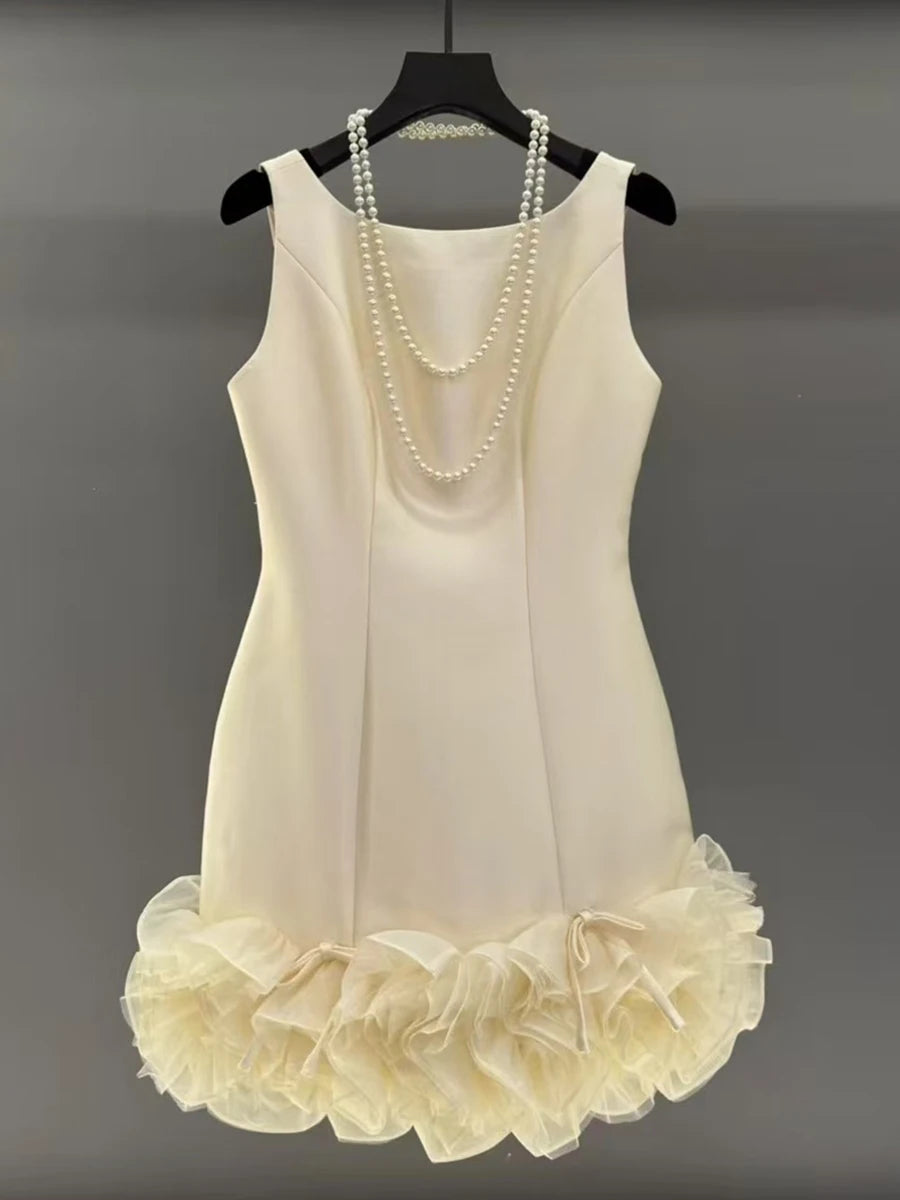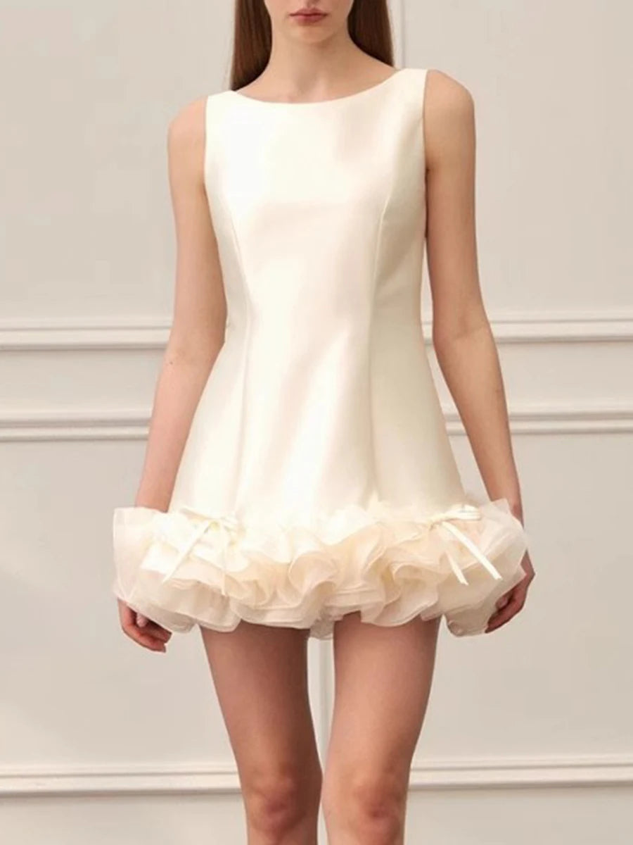 Indulge in timeless sophistication with the Trend4us Couture Ruffled Sleeveless Mini Dress. Crafted from lustrous satin fabric, this sculpted mini dress features a clean, sleeveless bodice and a voluminous ruffled hem trimmed with delicate bows. The structured silhouette flatters the figure with a graceful A-line shape, while the soft organza ruffles add a touch of couture whimsy.