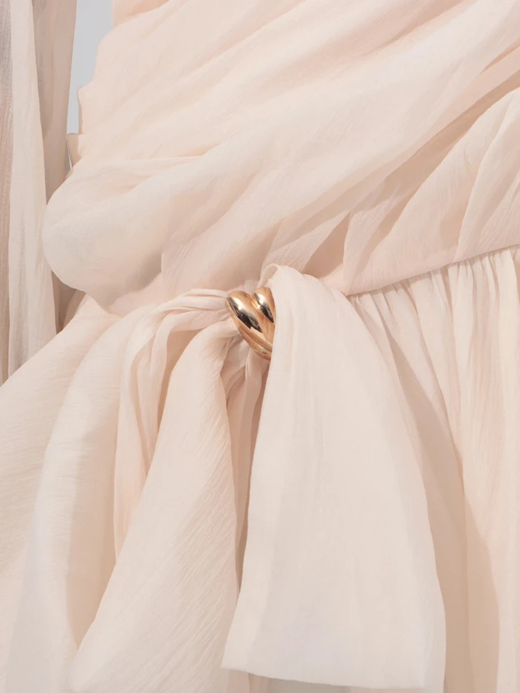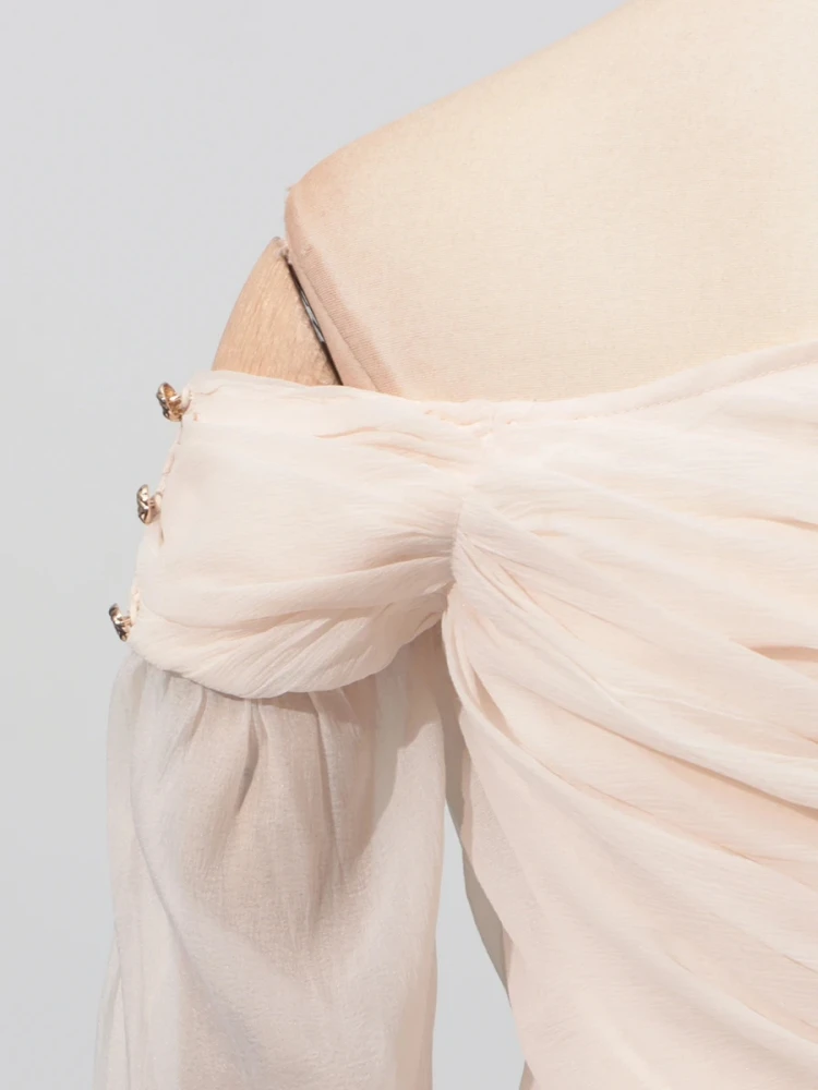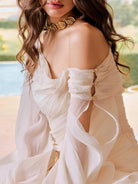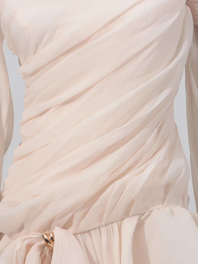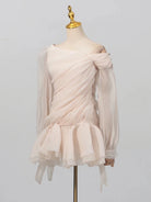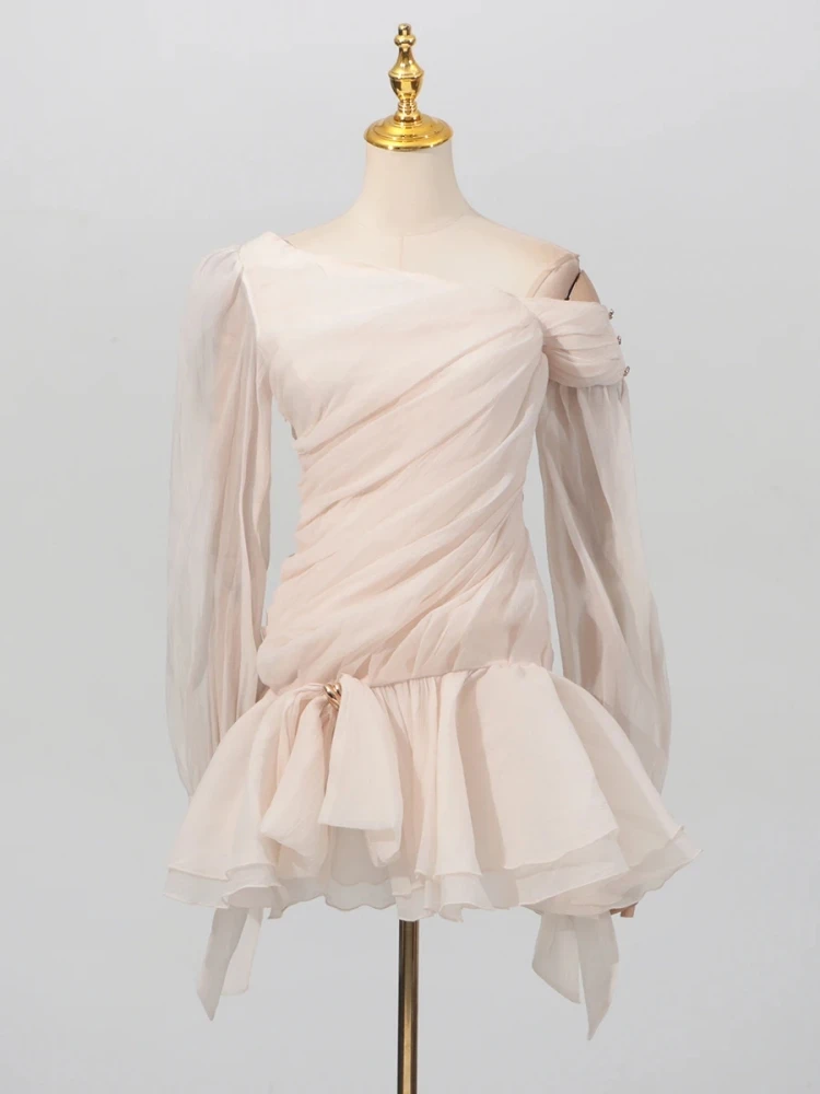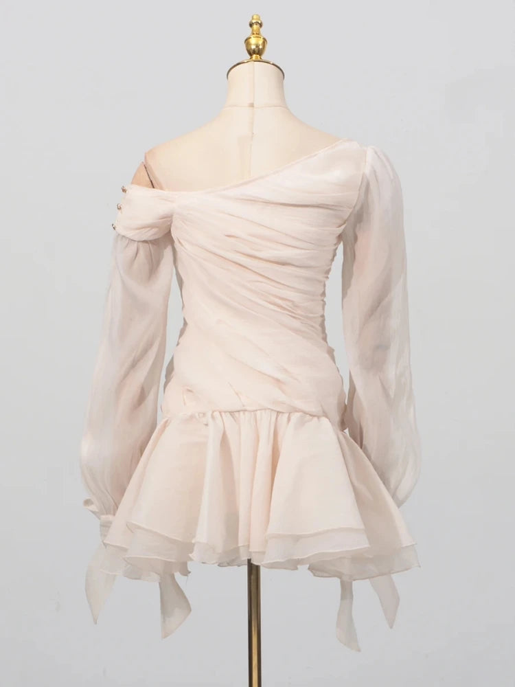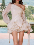 Elevate your evening look with the Trend4us Diagonal Long Sleeve Bow Ruffle Mini Dress. Crafted from airy chiffon, this luxurious mini dress features a unique diagonal neckline that drapes effortlessly across the shoulders, adding a touch of modern elegance. Voluminous sheer sleeves create a graceful silhouette, while the ruched bodice flatters the figure. The statement oversized bow at the waist is adorned with a gold accent, cascading into playful layered ruffles for a glamorous finish. Perfect for cocktail parties, special occasions, and chic soirées.