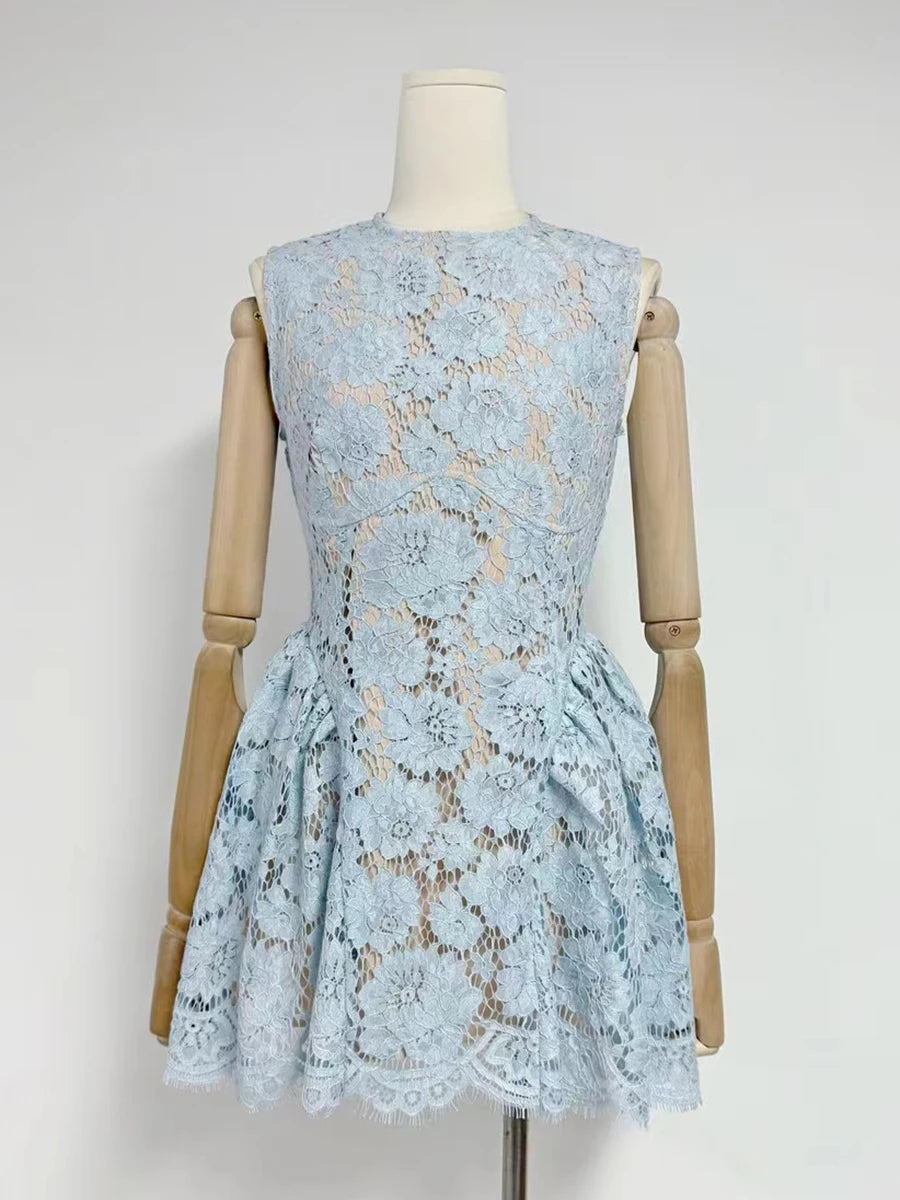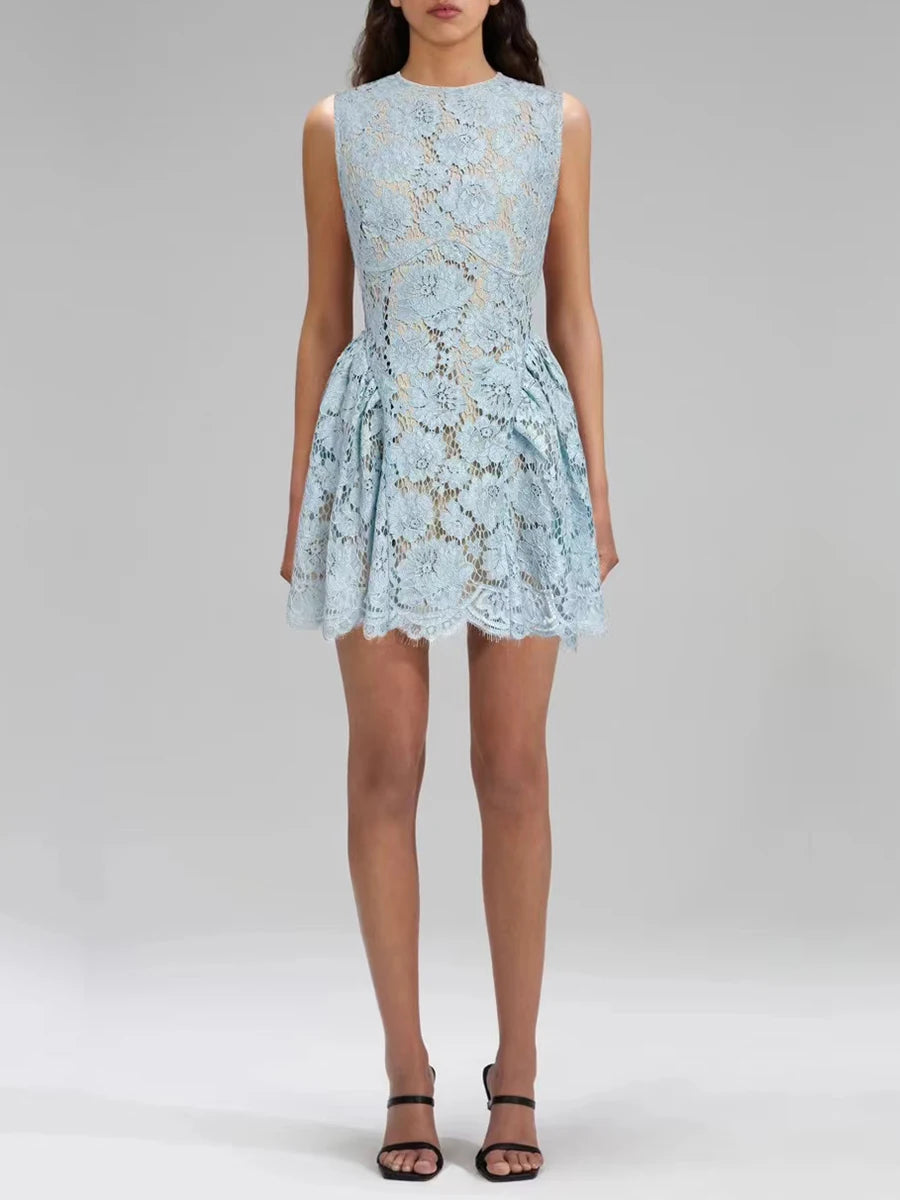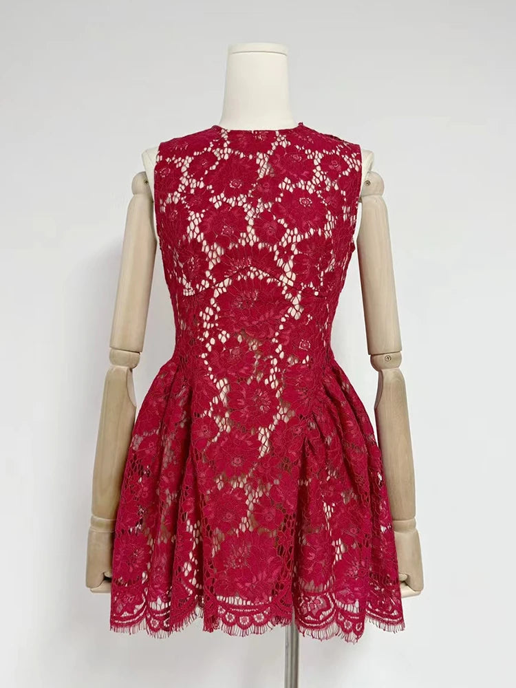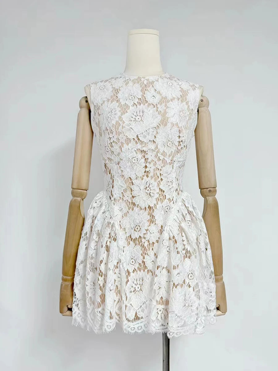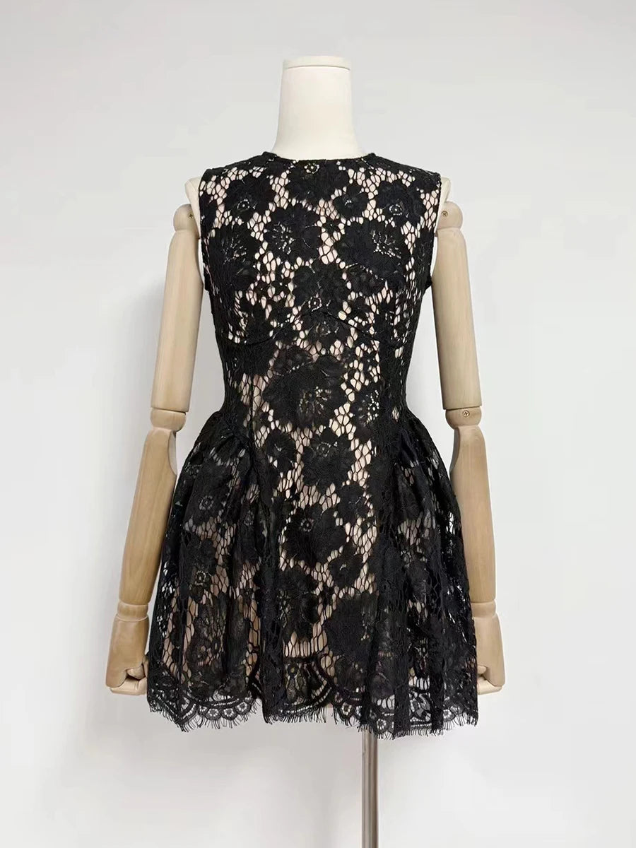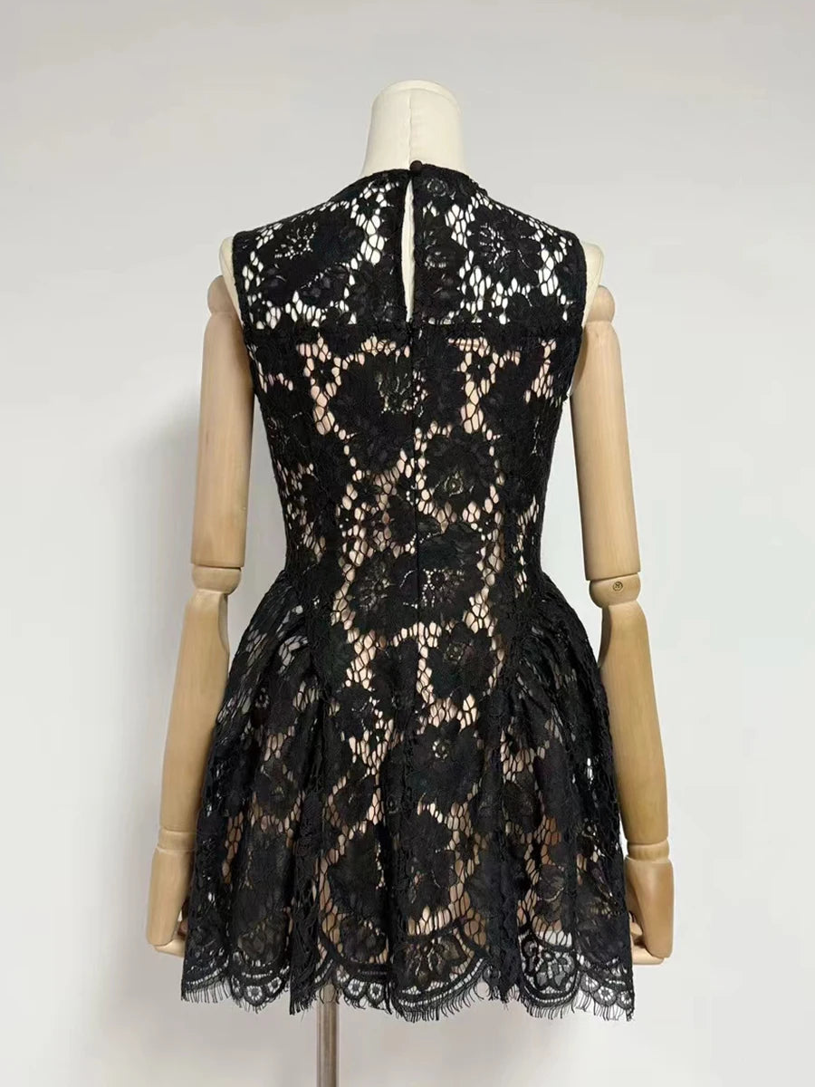 Make a statement with timeless elegance in the Trend4us Elegant Floral Lace Sleeveless Mini Dress. Crafted from intricately woven floral lace, this dress features a flattering sleeveless bodice, high neckline, and a structured fit-and-flare silhouette that accentuates the waist and adds graceful movement. The delicate scalloped hem and sheer lace overlay offer a romantic touch, while the invisible back zipper ensures a seamless finish. this versatile piece is perfect for garden parties, bridal showers, and chic evening affairs.