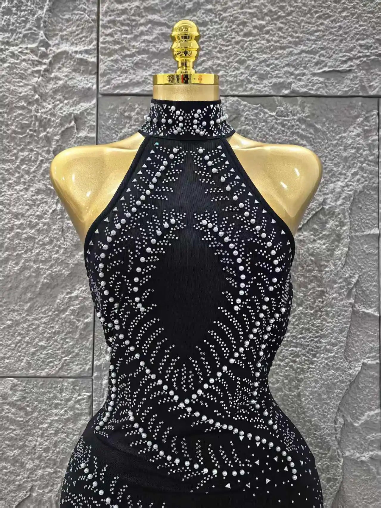 Step into the spotlight with the Trend4us Glam Crystal Embellished Halter Feather Mini Dress—a dazzling statement piece designed to turn heads. This body-hugging mini dress features a sleek halter neckline adorned with radiant crystal appliqués that create an intricate, light-catching pattern. The open back and curve-contouring silhouette elevate its sultry appeal, while the feather-trimmed hem adds a touch of playful drama. Perfect for upscale parties, nightclubs, or show-stopping appearances, this dress is your go-to for glamorous nights out.
