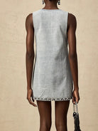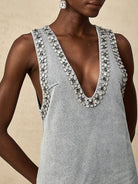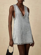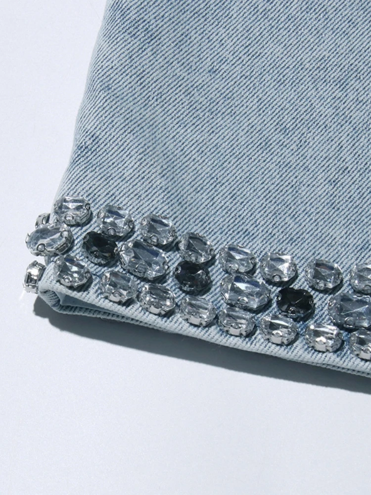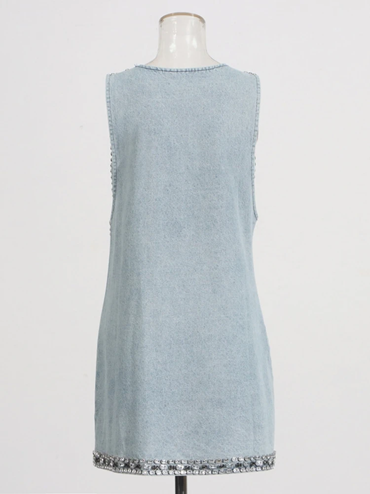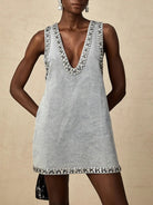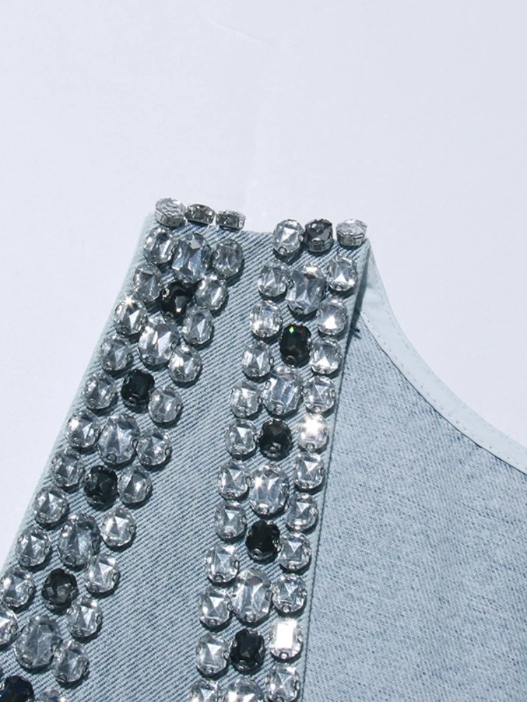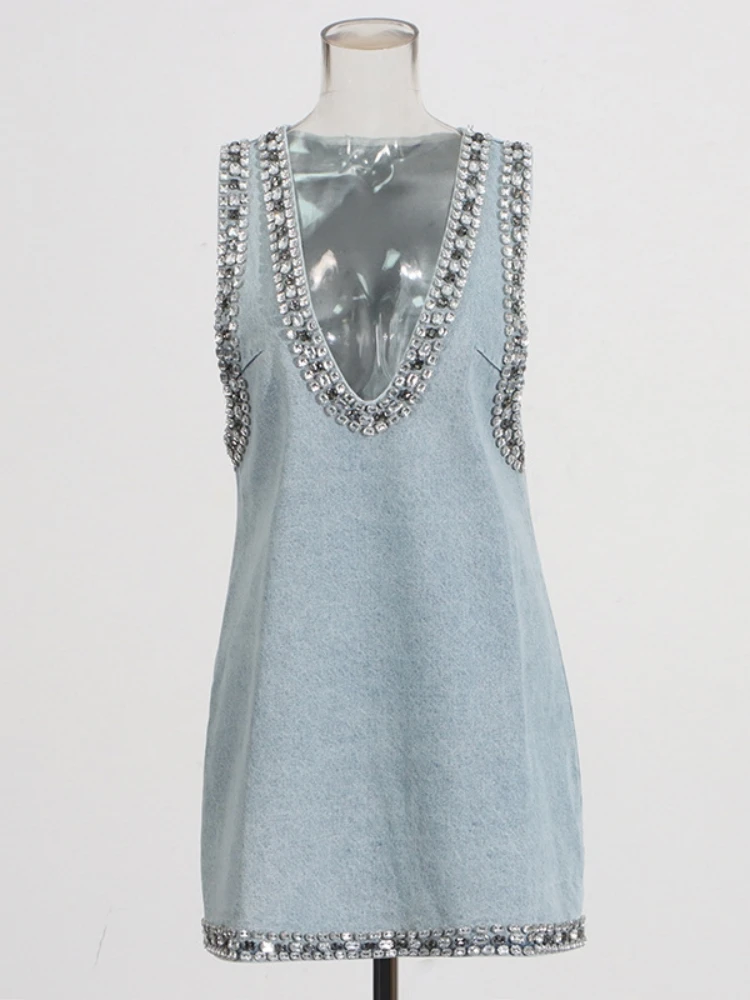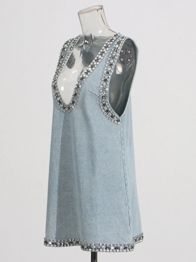 Turn heads in the Trend4us Luxe Crystal-Embellished Denim Mini Dress, a bold fusion of edgy denim and high-fashion sparkle. Designed with a daring deep V-neckline and sleeveless cut, this mini dress features striking crystal embellishments that outline the neckline, armholes, and hemline for a glamorous finish. The structured denim fabric adds modern edge, while the shimmering crystal details bring undeniable luxury. Perfect for parties, night outs, or upscale events, this dress is where casual denim meets show-stopping elegance.