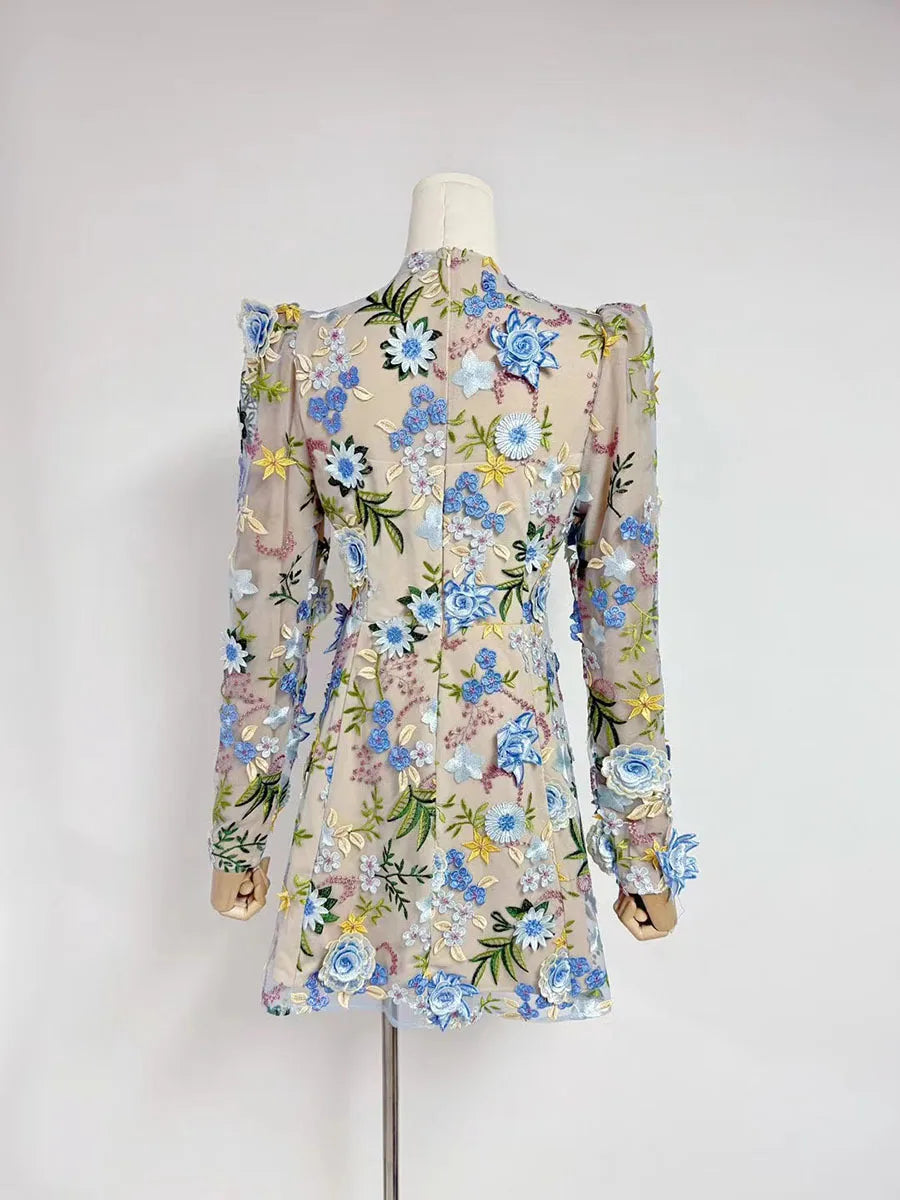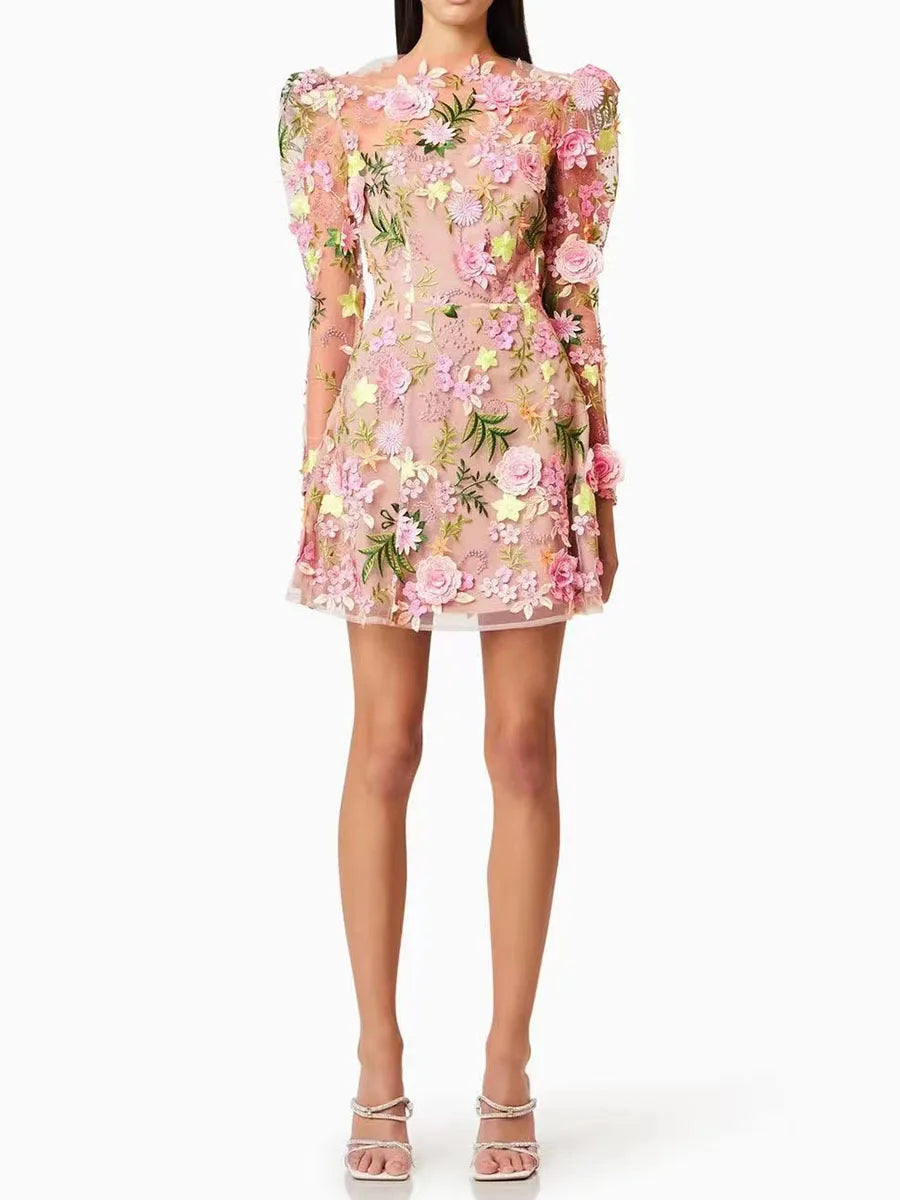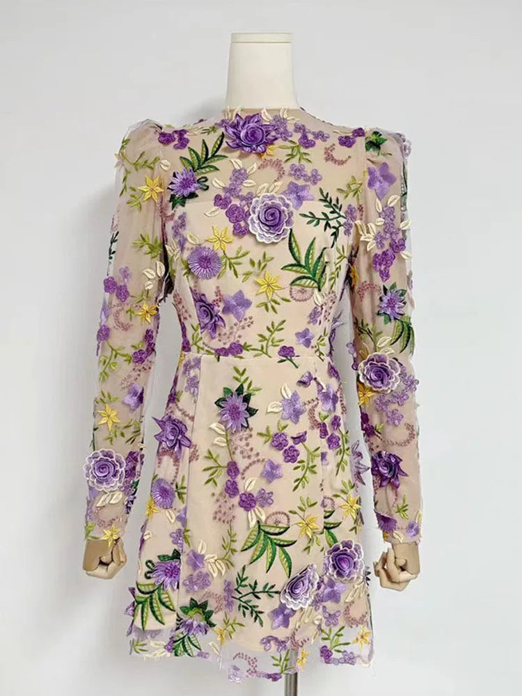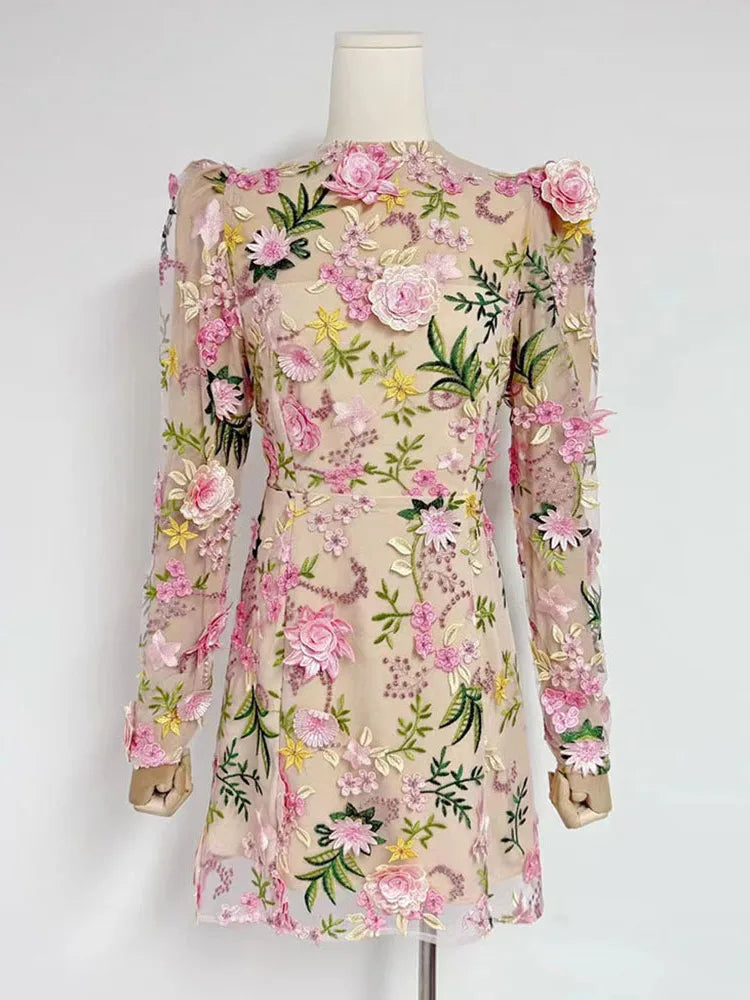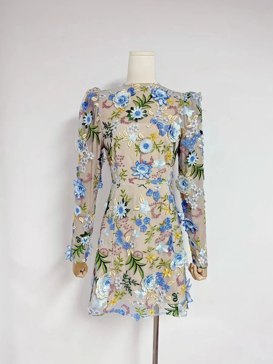 The sheer long sleeves and intricate floral detailing create a romantic, couture-inspired look perfect for upscale events, spring parties, or fashion-forward gatherings. With its artful embroidery and feminine flair, this dress is a statement of timeless beauty and luxurious craftsmanship.