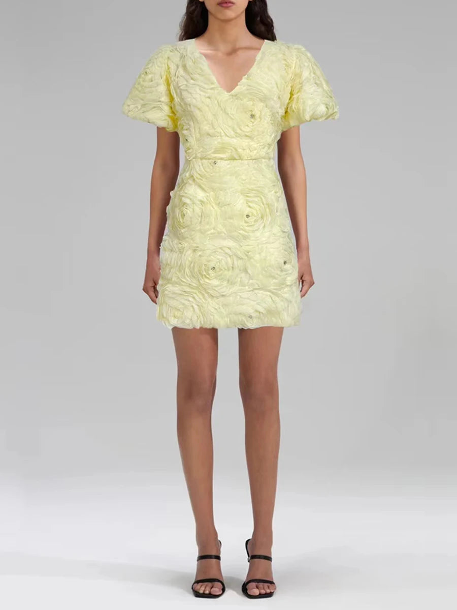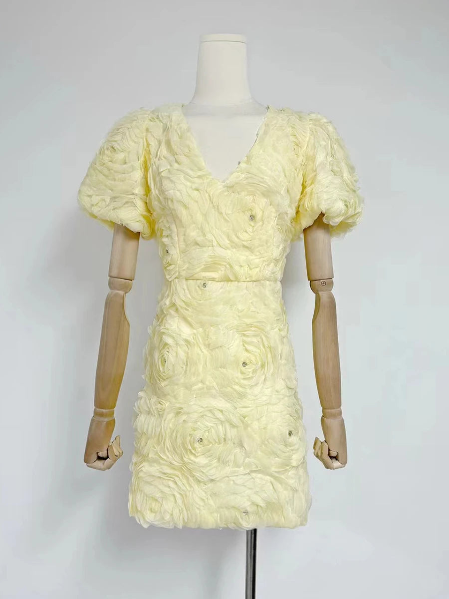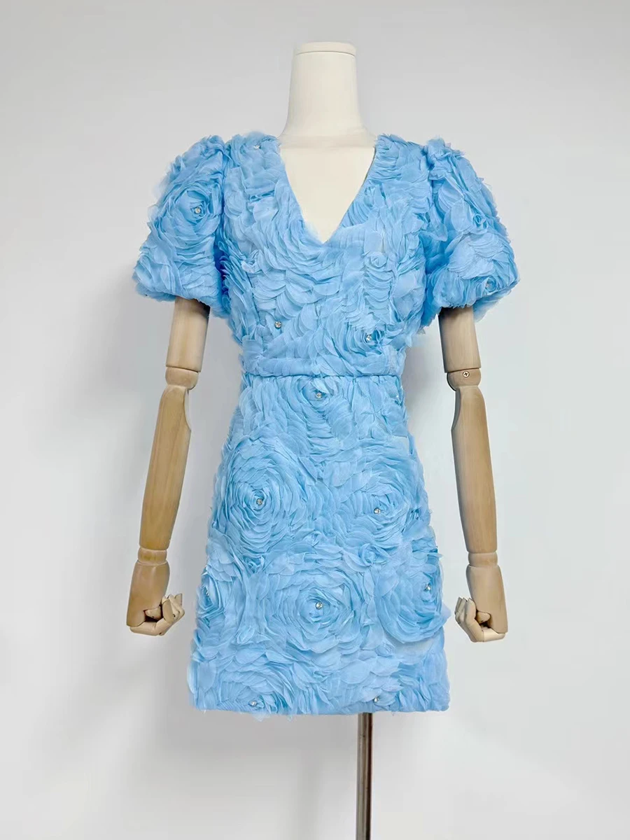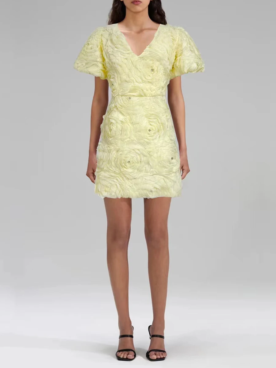 Make an unforgettable entrance in the Trend4us Luxe Floral Appliqué Puff Sleeve Mini Dress, featuring intricate 3D floral appliqués that create stunning texture and dimension. Designed with a flattering V-neckline and voluminous puff sleeves, this mini dress balances romance and modern glamour. Perfect for weddings, cocktail parties, or upscale events, this statement piece effortlessly elevates your eveningwear wardrobe.