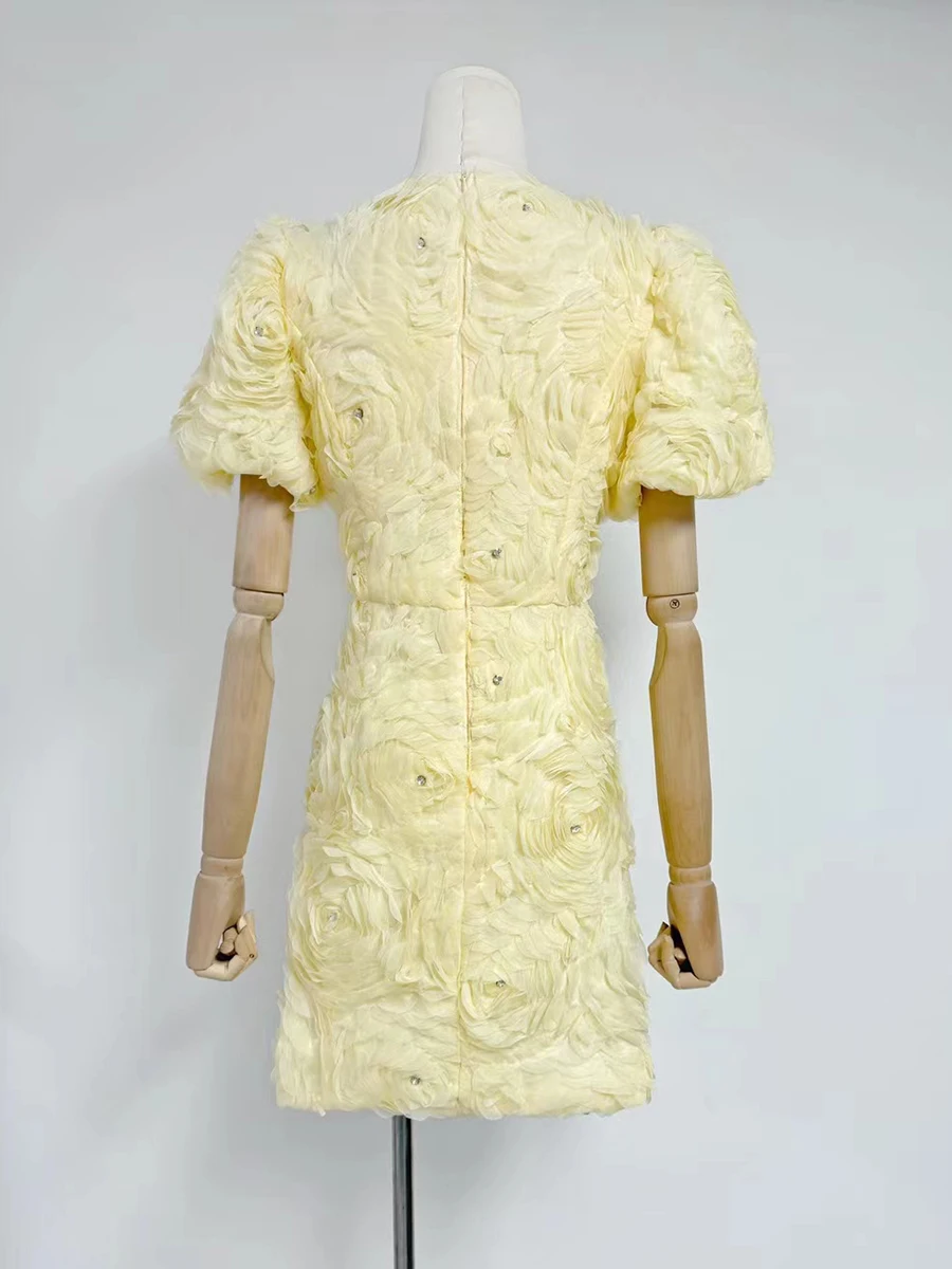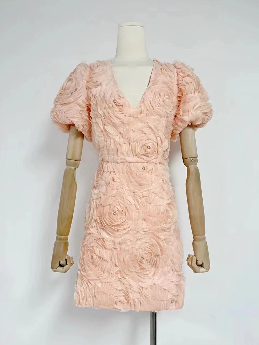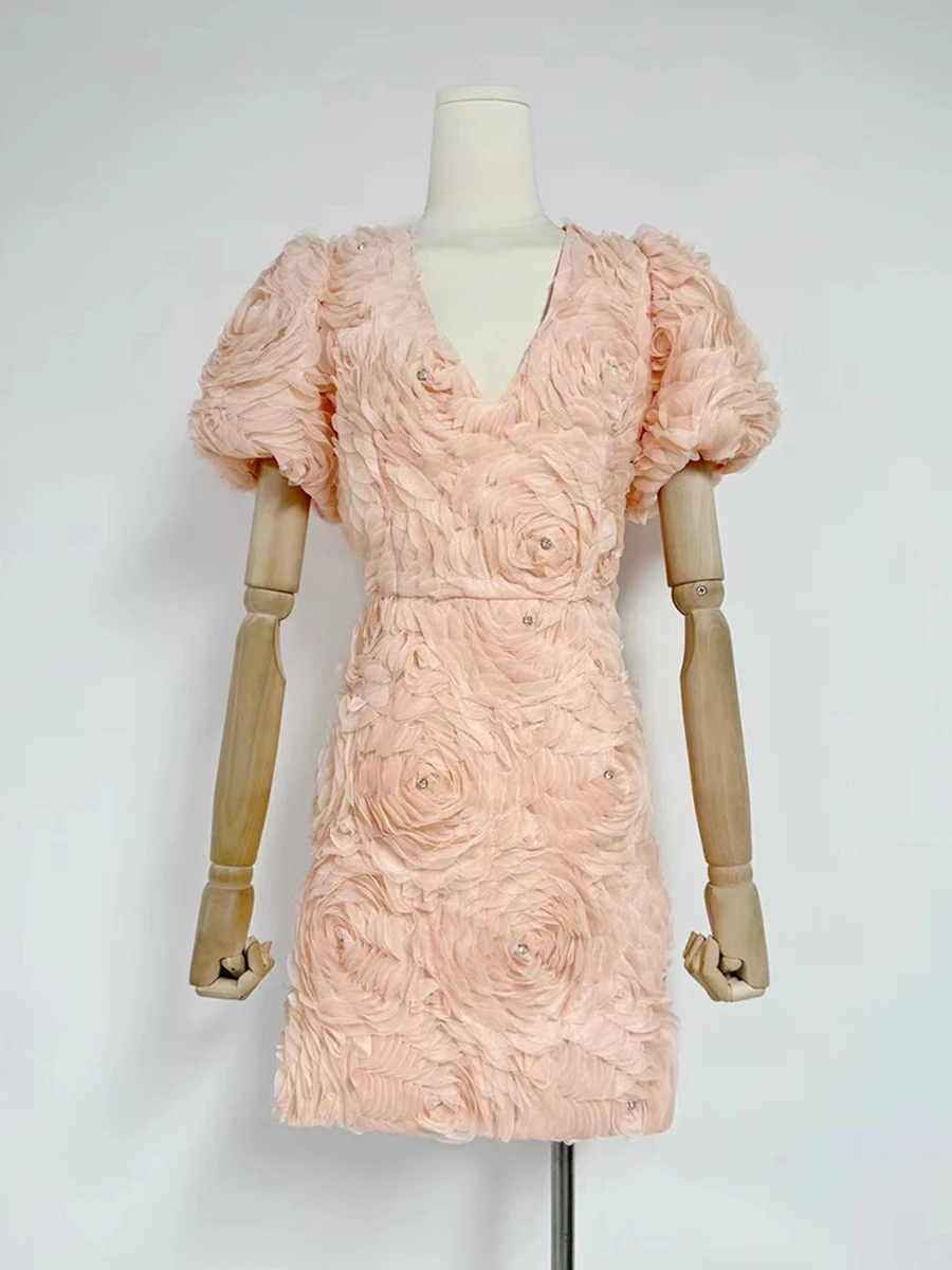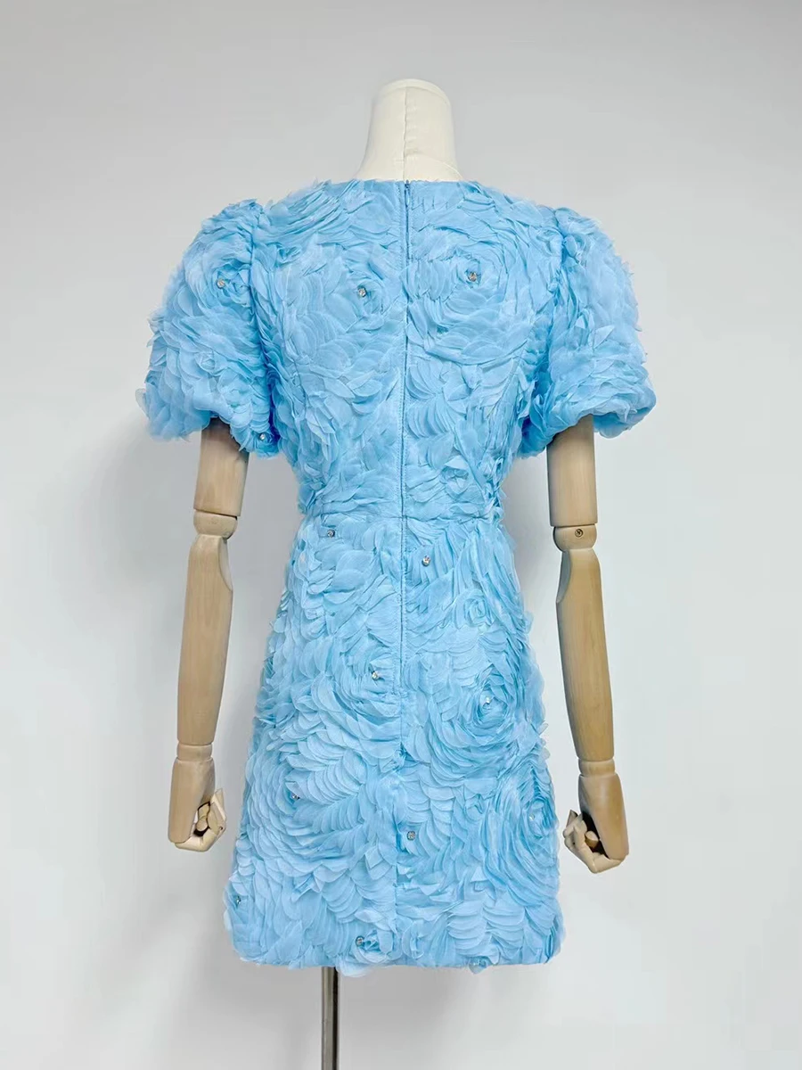 Make an unforgettable entrance in the Trend4us Luxe Floral Appliqué Puff Sleeve Mini Dress, featuring intricate 3D floral appliqués that create stunning texture and dimension. Designed with a flattering V-neckline and voluminous puff sleeves, this mini dress balances romance and modern glamour. Perfect for weddings, cocktail parties, or upscale events, this statement piece effortlessly elevates your eveningwear wardrobe.
