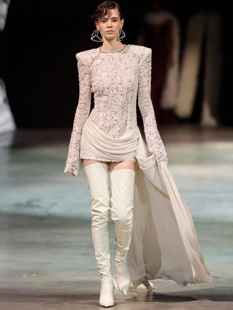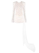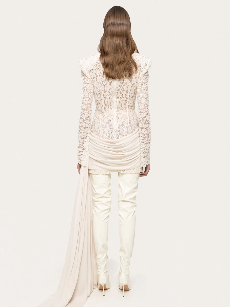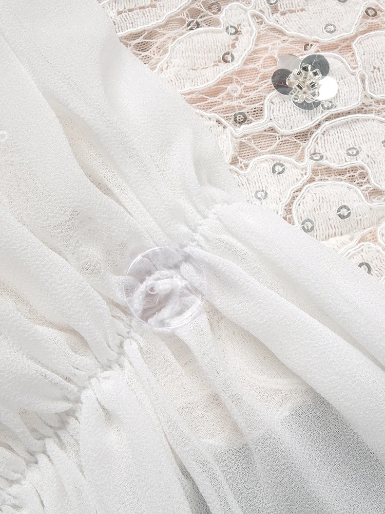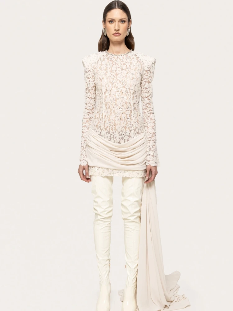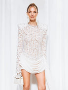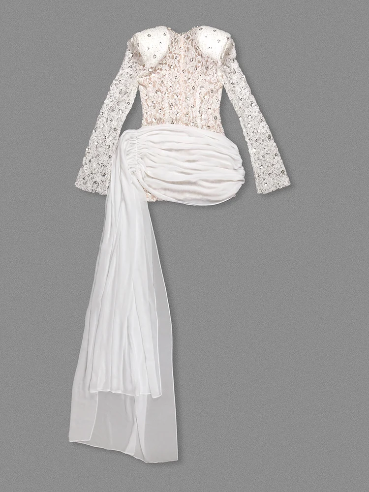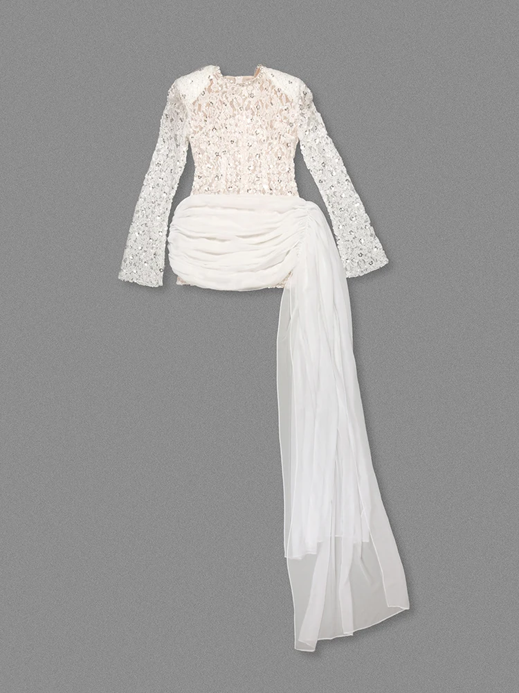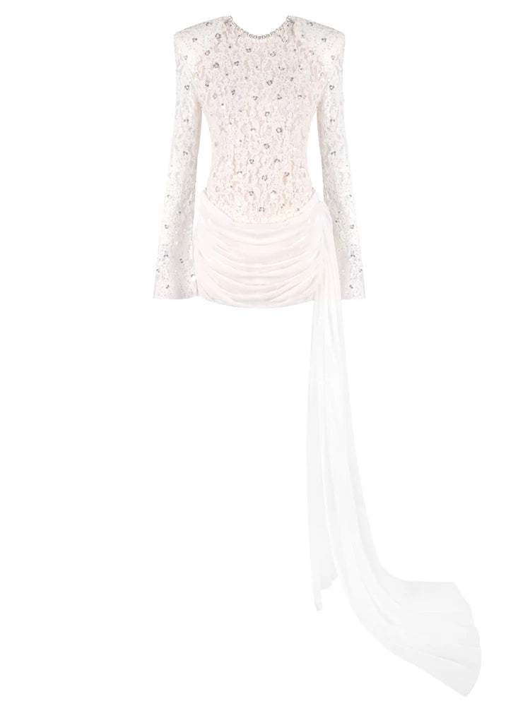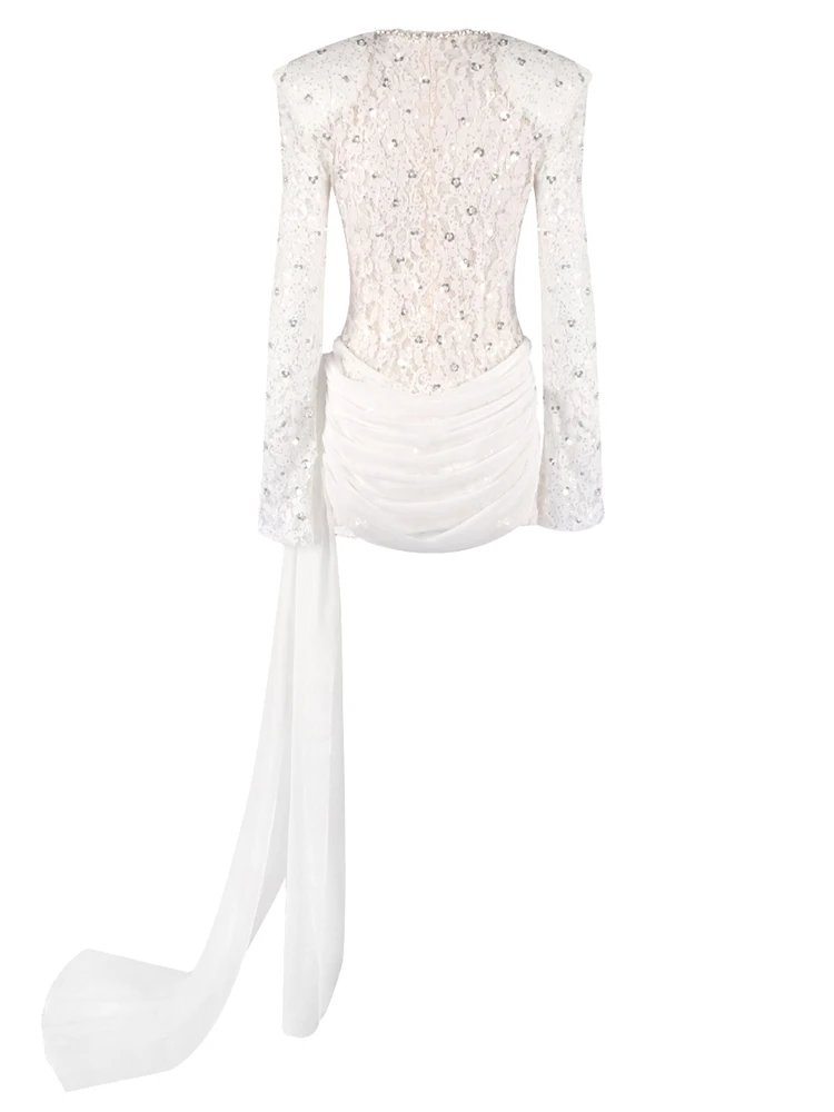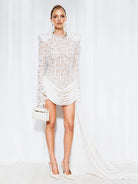 Make a bold statement with the Trend4us Luxe Sequin Lace Diamonds Structured Mini Dress, designed for women who embrace elegance with an edge. This couture-inspired mini dress features a sheer lace bodice adorned with shimmering sequins and diamond-like embellishments for maximum sparkle. The structured shoulders and long sleeves add dramatic sophistication, while the draped satin skirt with an asymmetrical train delivers a modern, high-fashion finish. Perfect for galas, evening parties, or red-carpet moments.