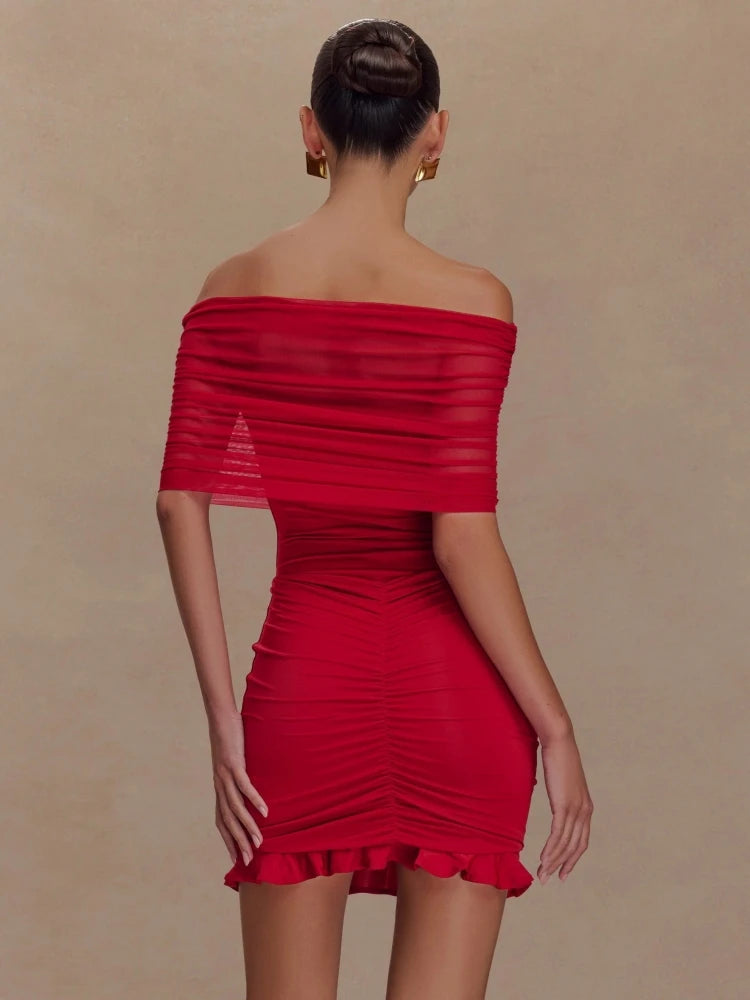 Trend4us Mesh Ruched Off-Shoulder Ruffle Mini Dress