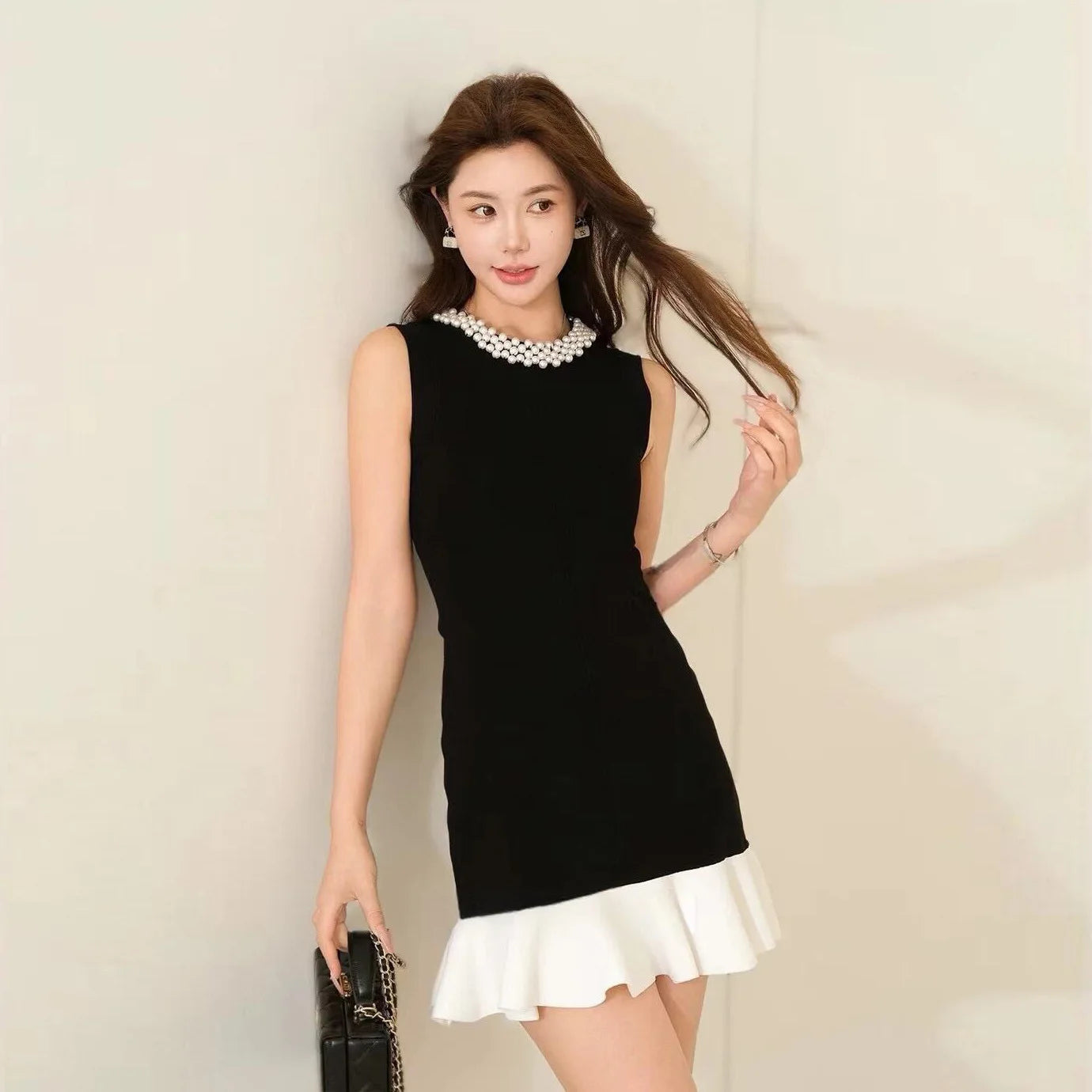 Step into timeless elegance with the Trend4us Pearl Collar Contrast Mini Dress. This sleeveless black mini dress features a fitted silhouette with a flared white ruffle hem for a playful yet polished look. The highlight is the luxurious pearl-embellished collar, adding a touch of glamour and sophistication. Crafted from a stretch-knit fabric for a smooth, flattering fit, it’s the perfect piece for upscale brunches, evening events, or stylish city outings.