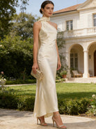 Exude sophistication in this luxurious satin maxi dress featuring a halter neckline, daring backless design, and elegant scarf detailing. The empire waistline and sleek sheath silhouette create a refined, figure-flattering look perfect for upscale events.