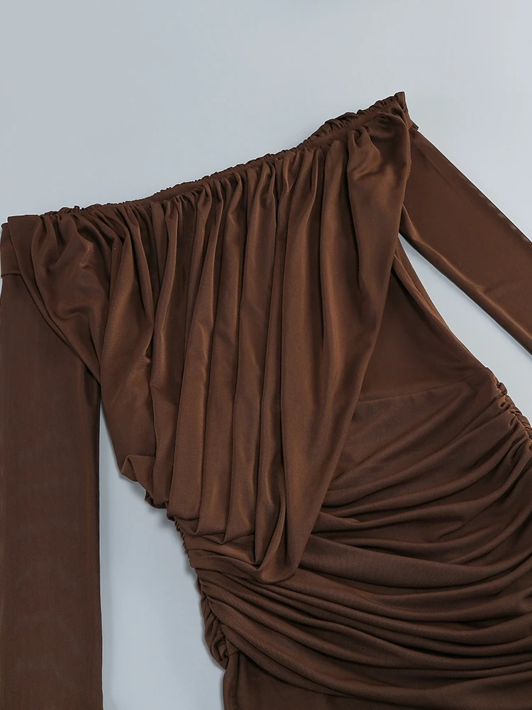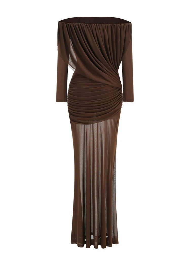 Trend4us Luxe Off-Shoulder Sheer Draped Maxi Gown commands attention with its sophisticated silhouette and refined construction. The lightweight sheer mesh fabric drapes elegantly across an off-shoulder neckline, creating a flattering frame that emphasizes the décolletage. Strategic ruching and sculpted detailing contour the body with precision, delivering both visual impact and wearable comfort. Designed for gala nights, red carpet appearances, upscale soirées, and destination celebrations, this maxi gown elevates any formal occasion with understated luxury and editorial polish.