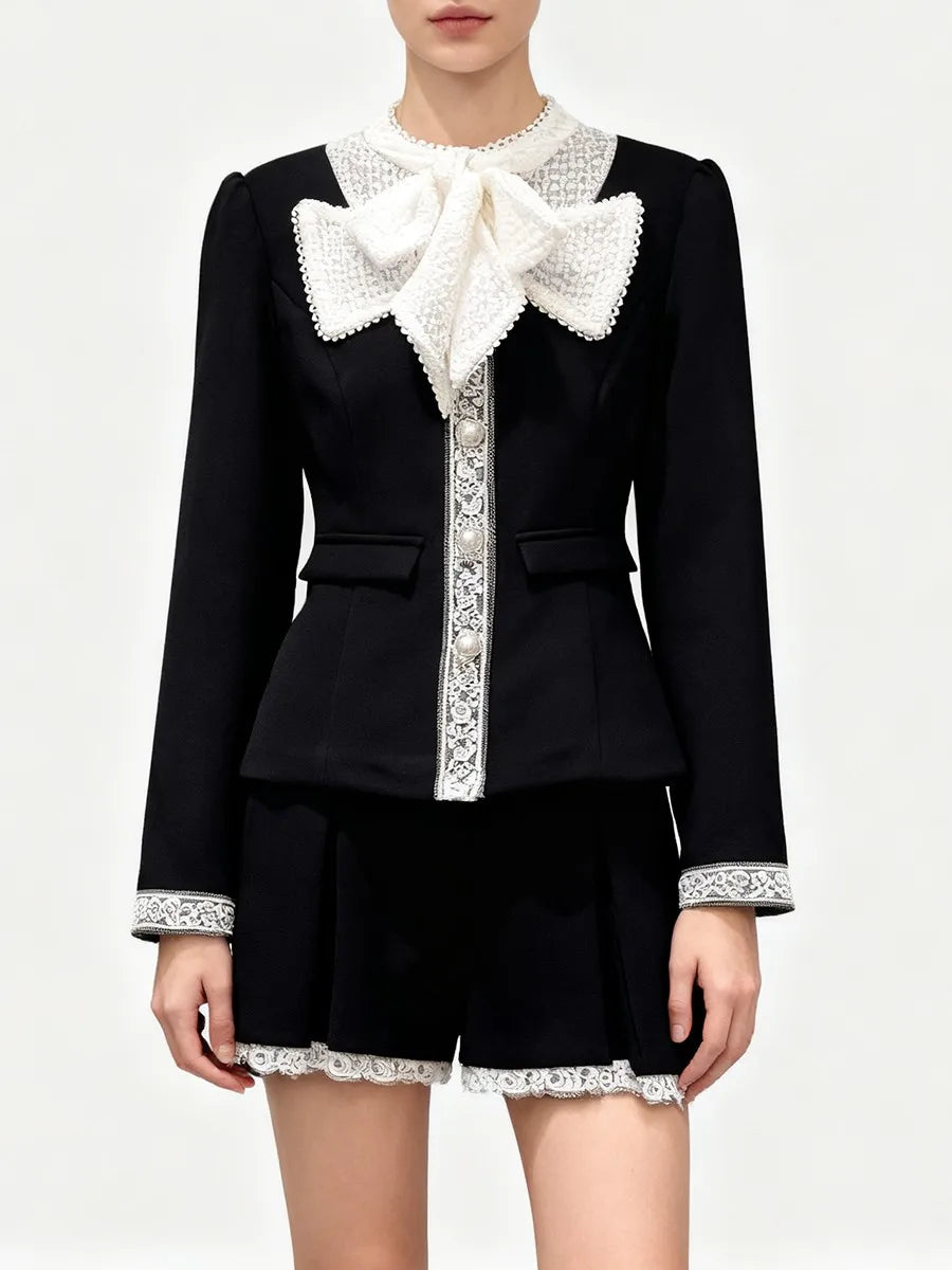 Trend4us Elegant Lace Bow-Collar Blazer & Shorts Set