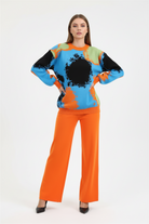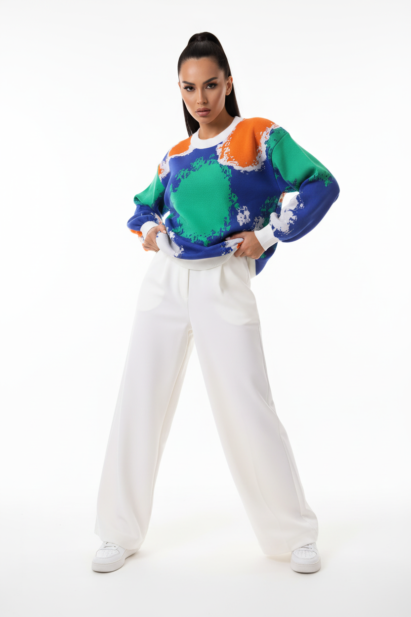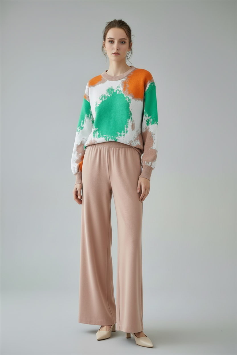 Step into effortless style with this retro-inspired knit two-piece set that brings together comfort and high-street fashion. Featuring a bold abstract print sweater and coordinating wide-leg pants, this versatile outfit delivers a put-together look with minimal effort. Perfect for the modern woman who values both style and comfort in her everyday wardrobe.