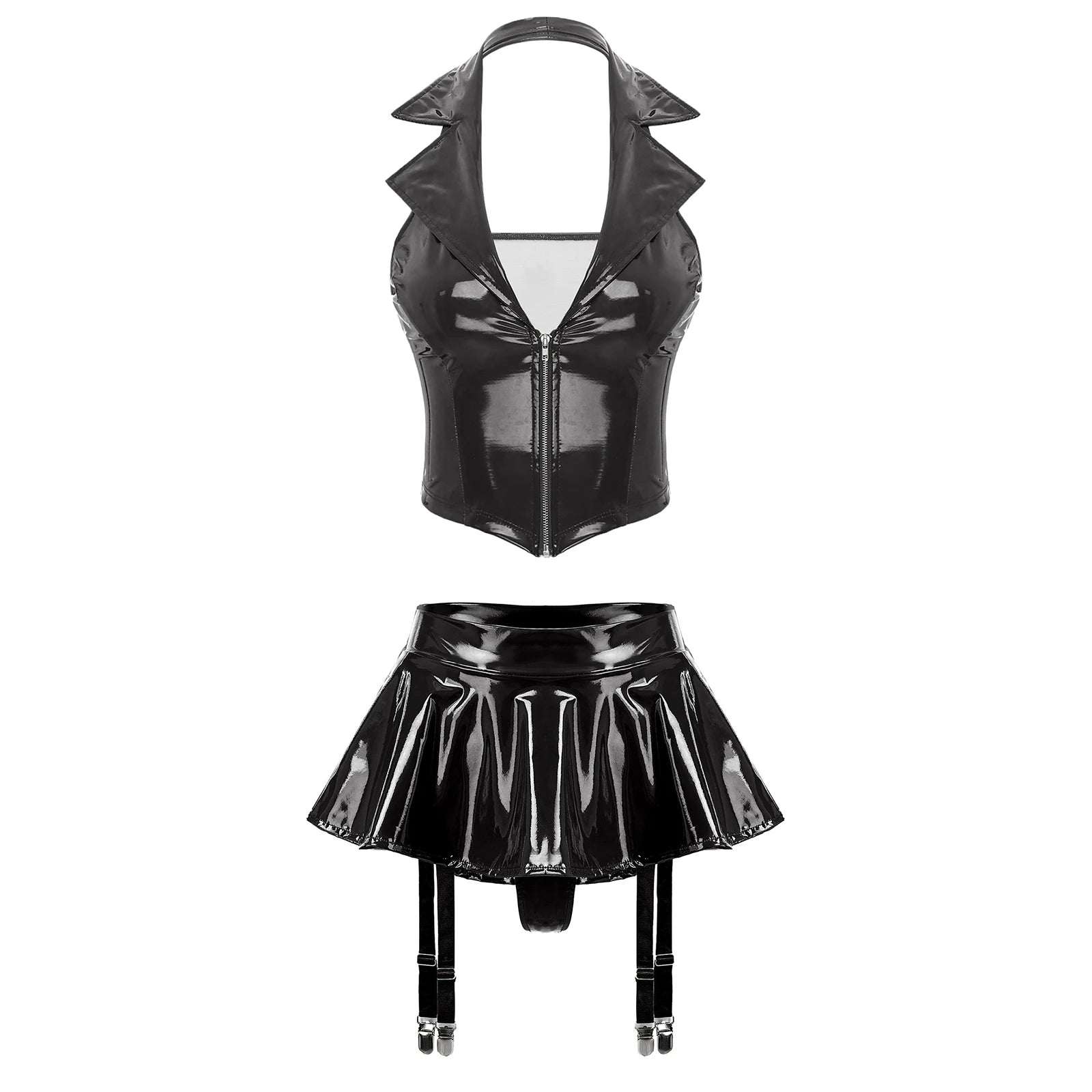 Whether you're making an entrance at a party or elevating your fashion game, the Trend4us Glossy Faux Leather Halter Skirt Set is your ultimate statement piece.