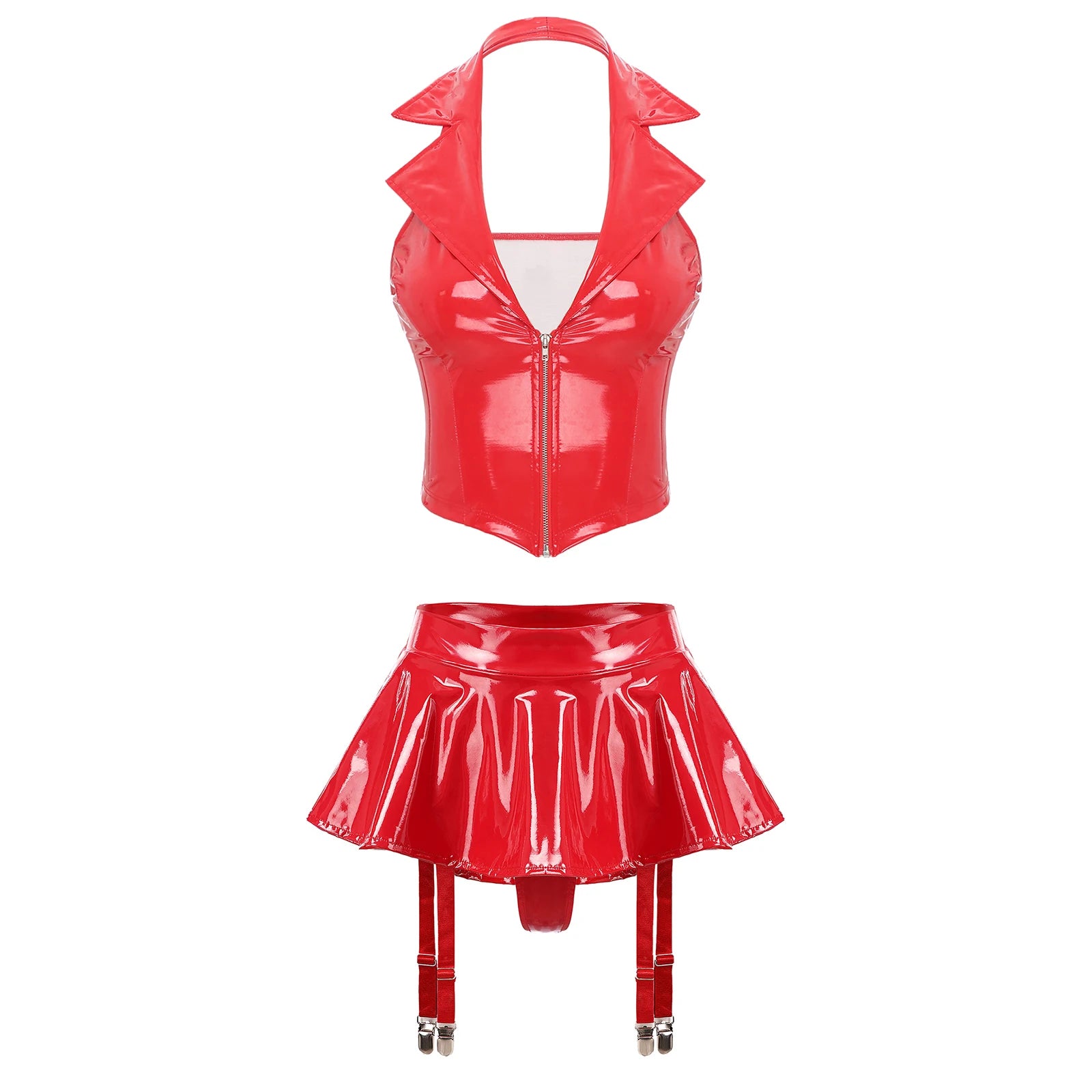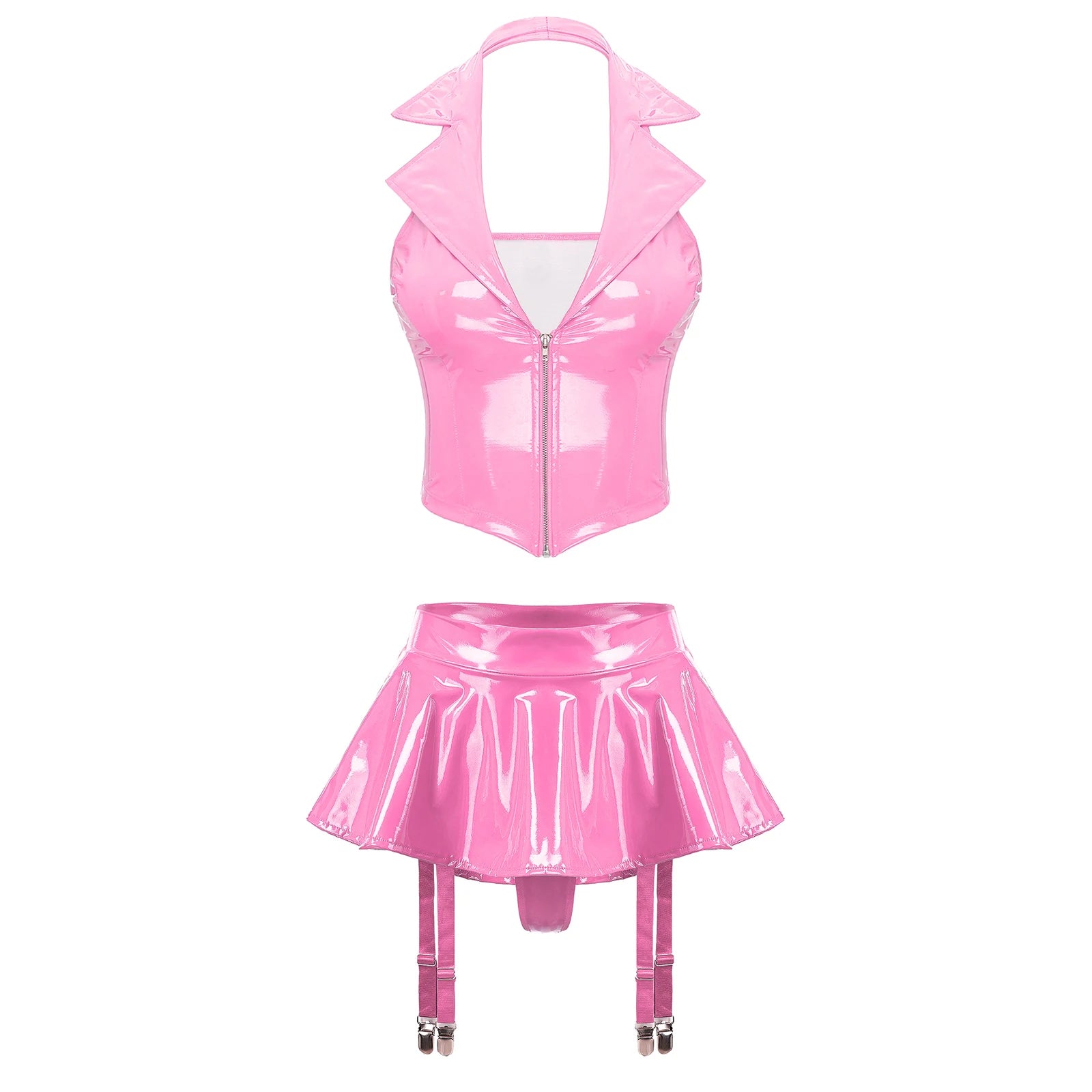 Trend4us Glossy Faux Leather Halter Skirt Set