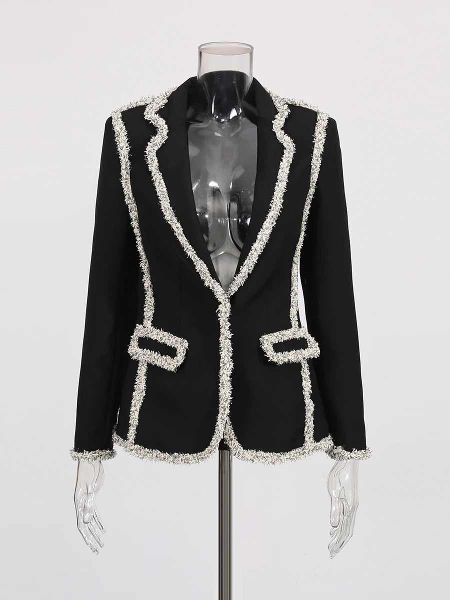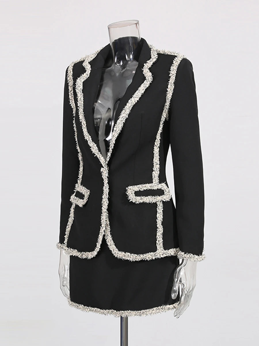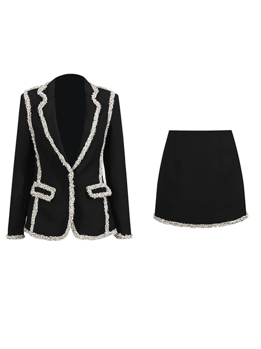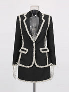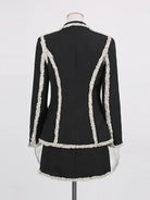Channel timeless sophistication with the Trend4us Luxe Contrast Trim Blazer & Skirt Set. Designed with modern elegance, this two-piece features a tailored black blazer trimmed with textured white contrast details for a chic, polished edge. The matching mini skirt completes the look with a refined yet trendy silhouette. Perfect for business events, dinner dates, or evening occasions, this set seamlessly blends luxury tailoring with fashion-forward appeal.