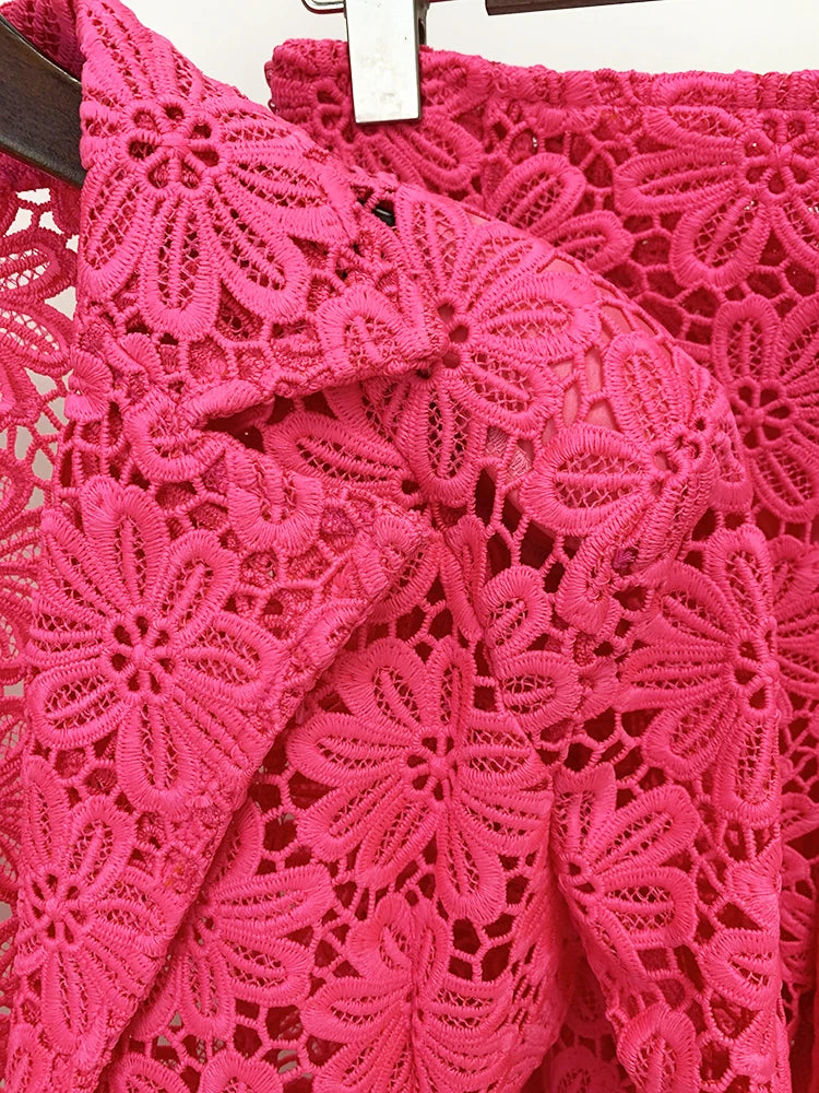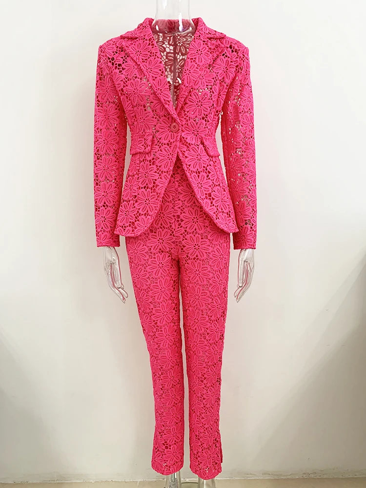 Make a bold statement with the Trend4us Luxe Floral Lace Blazer & Pants Set. This stunning two-piece ensemble features a tailored blazer and slim-fit pants, both crafted from intricate floral lace for a sophisticated yet playful look. The blazer is designed with a sharp lapel collar, front button closure, and flap pockets, while the matching pants offer a comfortable elastic waist and sleek silhouette. Available in vibrant pink and classic white, this set is perfect for parties, special occasions, or fashion-forward daywear that demands attention.
