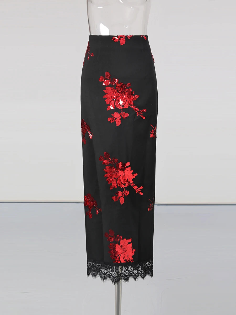 Bottom: High-waisted midi skirt with floral sequins and lace hem trim