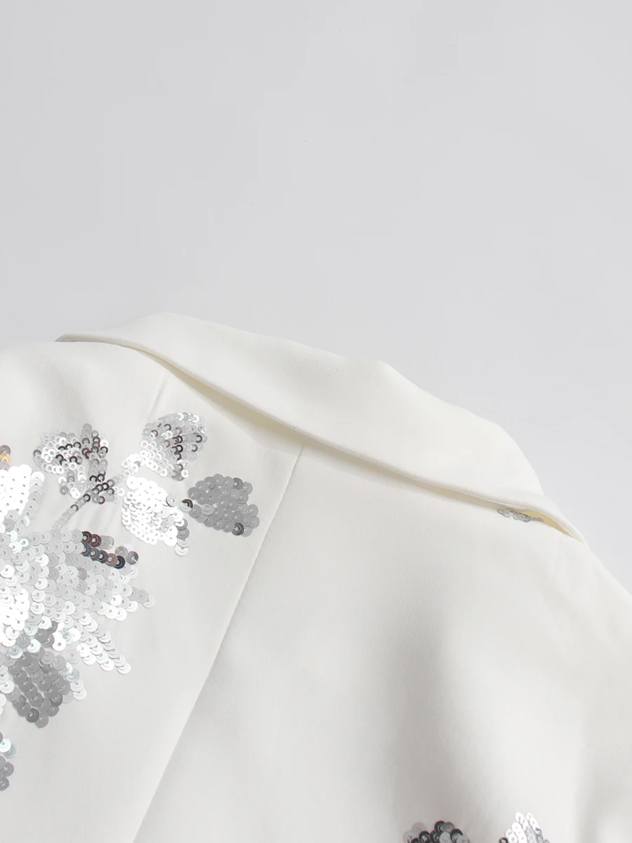 Top: Cropped double-breasted blazer with sequin floral embellishments
