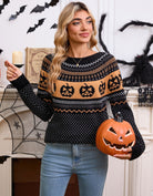 Embrace the spooky season in comfort and style with the Trend4us Oversized Halloween Pumpkin Knit Sweater. This cozy knit features a festive Fair Isle pattern with bold jack-o’-lantern motifs in striking orange and black tones, perfect for adding a playful seasonal vibe to your autumn wardrobe.