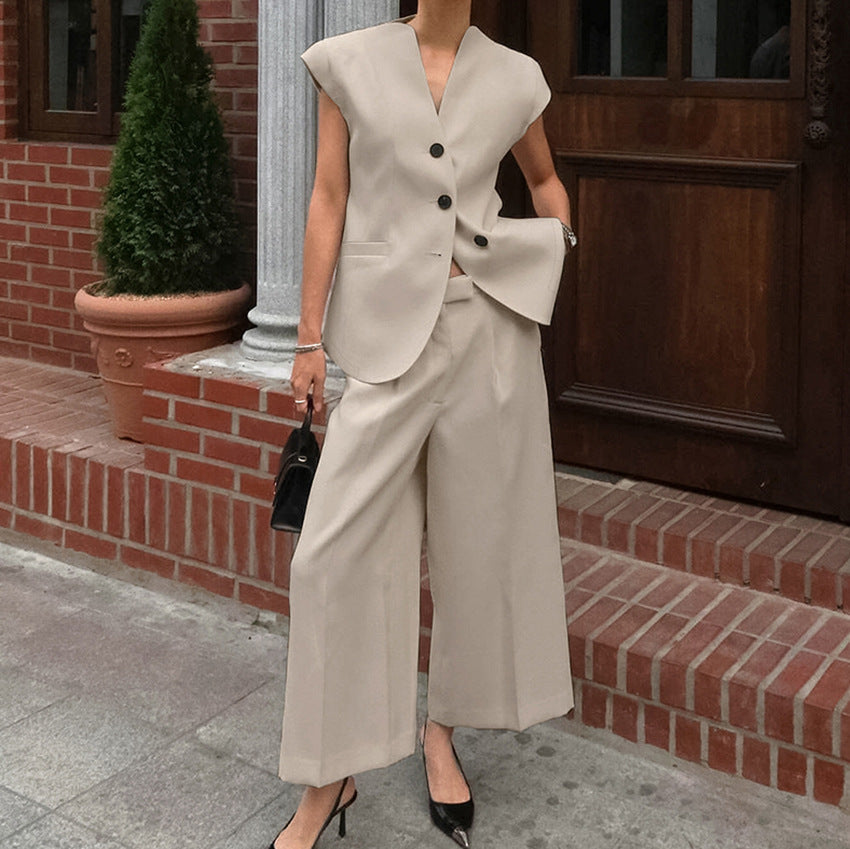 Trend4us Minimalist Sleeveless Blazer and Wide-Leg Trouser Set