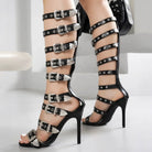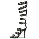 Unleash your boldest style with the Trend4us Fierce Multi-Buckle Gladiator Stiletto Sandals, crafted for women who love commanding attention with every step. These high-impact sandals feature a dramatic knee-high gladiator silhouette adorned with multiple sculpted Western-inspired buckles, creating the perfect blend of modern edge and statement-making luxury.