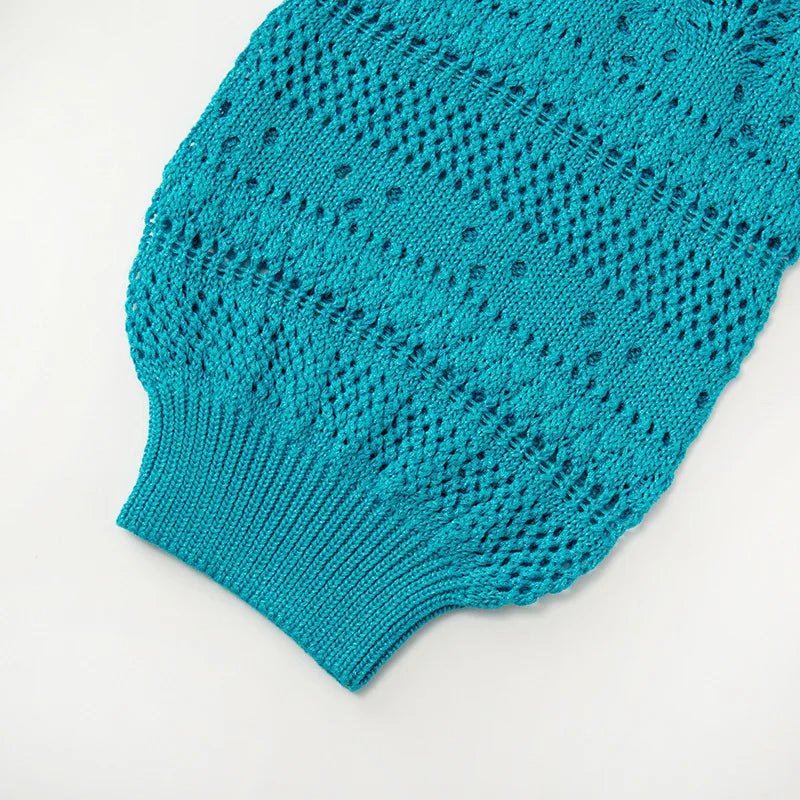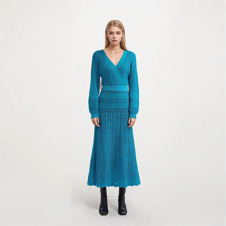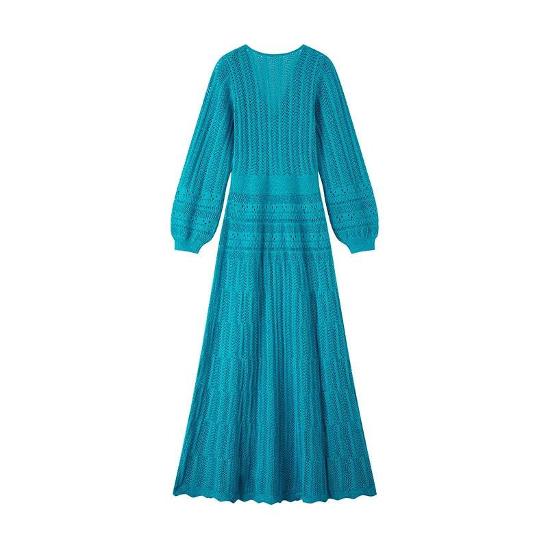 Refined and romantic, the Trend4us Crochet Knit Flare Sleeve Maxi Dress exudes effortless sophistication. Featuring an intricate openwork crochet design, this dress is styled with a deep surplice V-neckline, long balloon sleeves with ribbed cuffs, and a wide waistband that enhances the silhouette. The full-length flared skirt flows gracefully with every step, finished with a scalloped hem for added charm. Perfect for spring soirées, resort getaways, or breezy outdoor events.