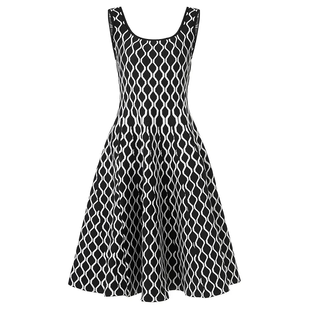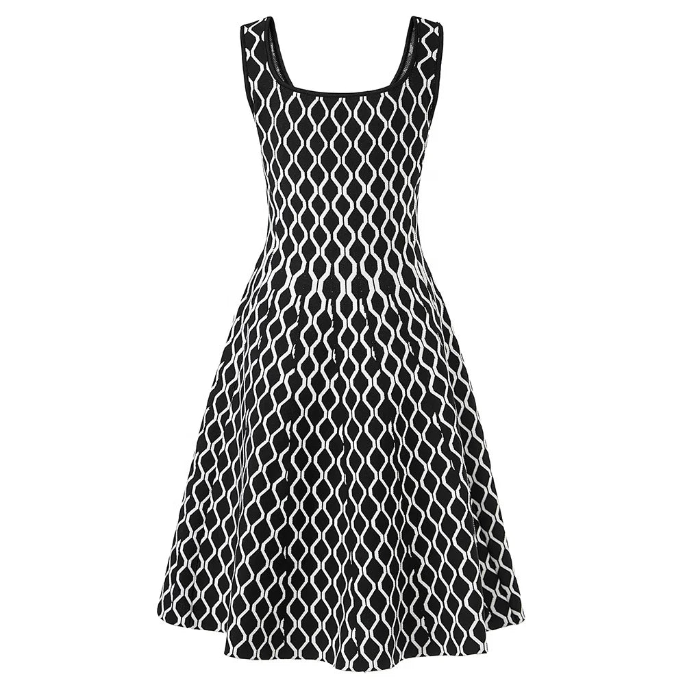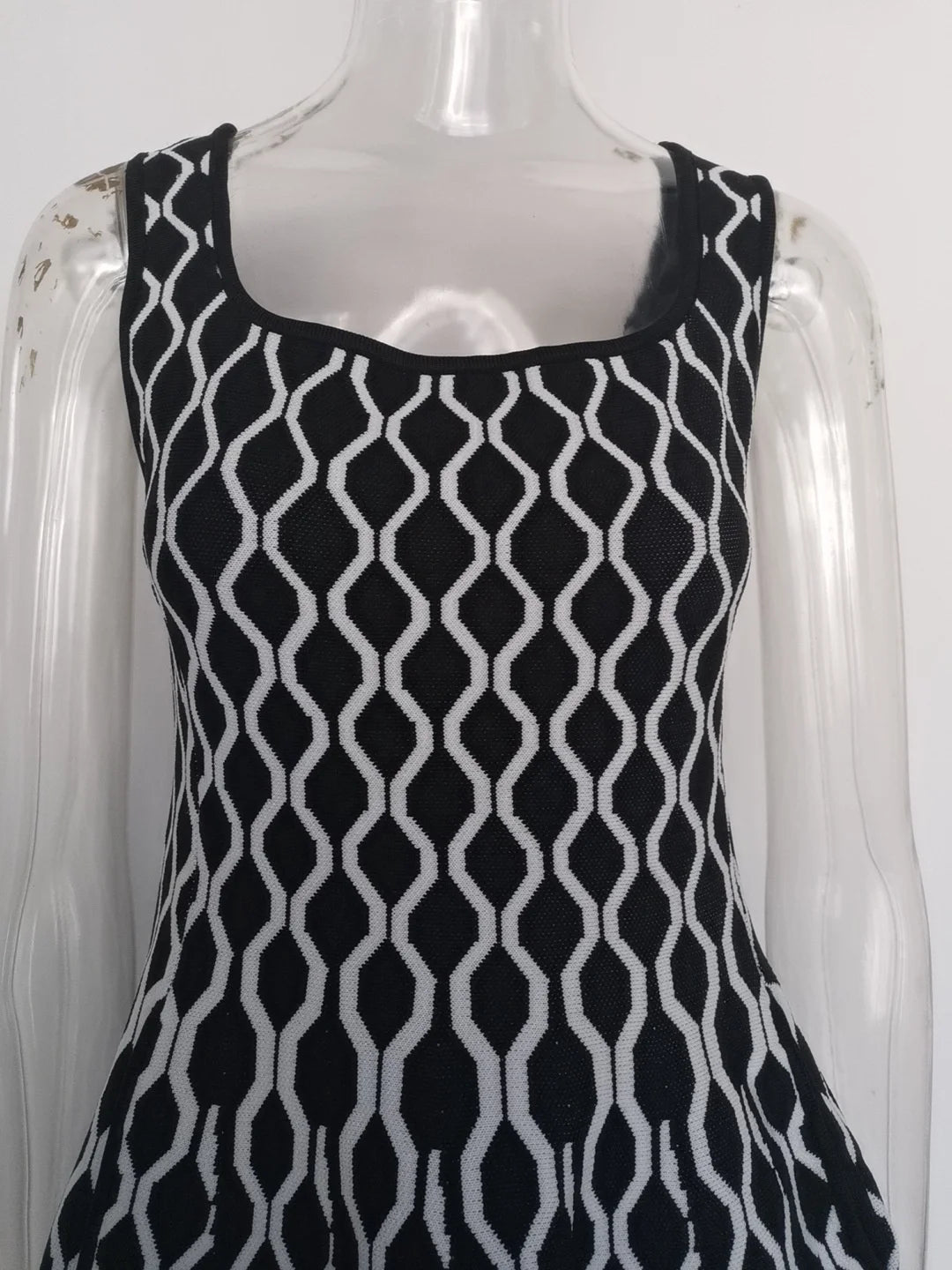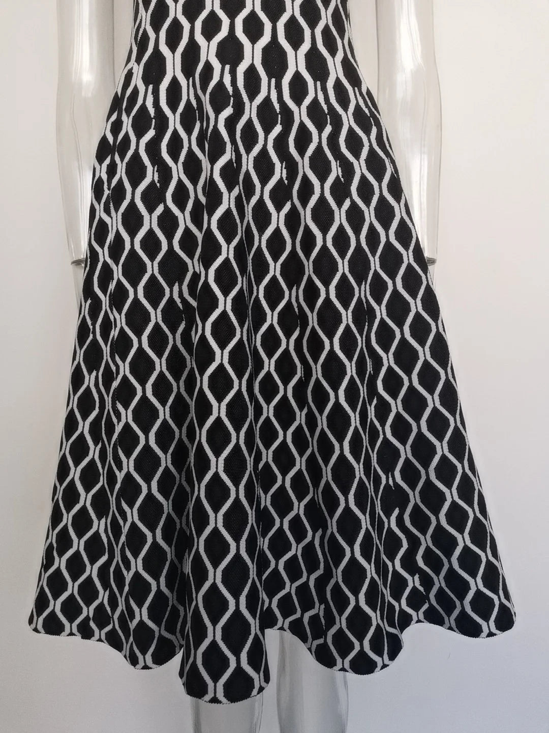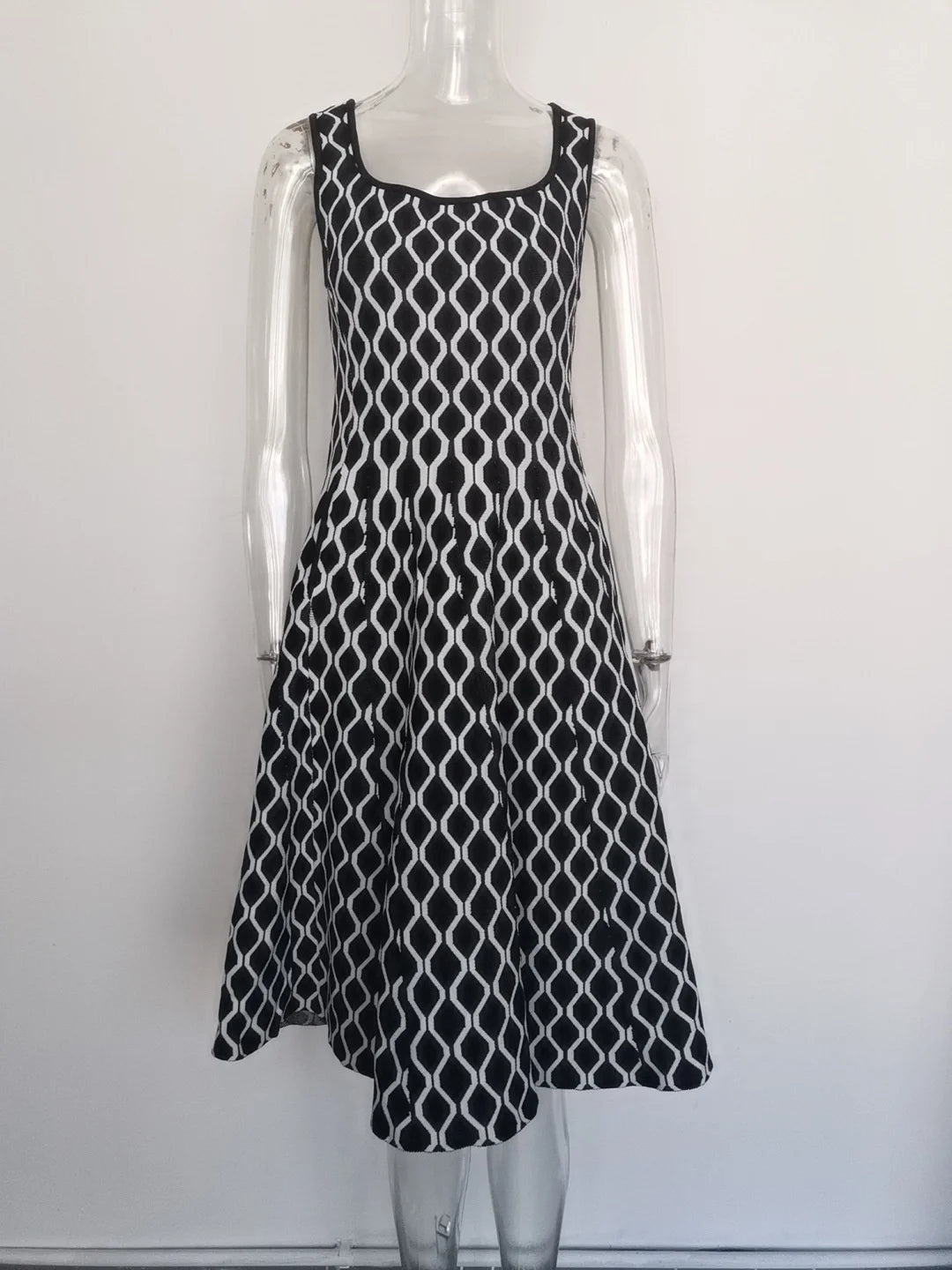 Refined and effortlessly stylish, the Trend4us Elegant Knit Jacquard Flared Midi Dress is designed to make a statement. Crafted from premium stretch-knit jacquard fabric, this sleeveless midi dress features a square neckline, a fitted bodice, and a voluminous flared skirt that enhances the silhouette. The bold geometric pattern in black and white adds a modern edge to its classic French-inspired aesthetic. Ideal for gallery outings, dinner dates, or upscale daywear looks.